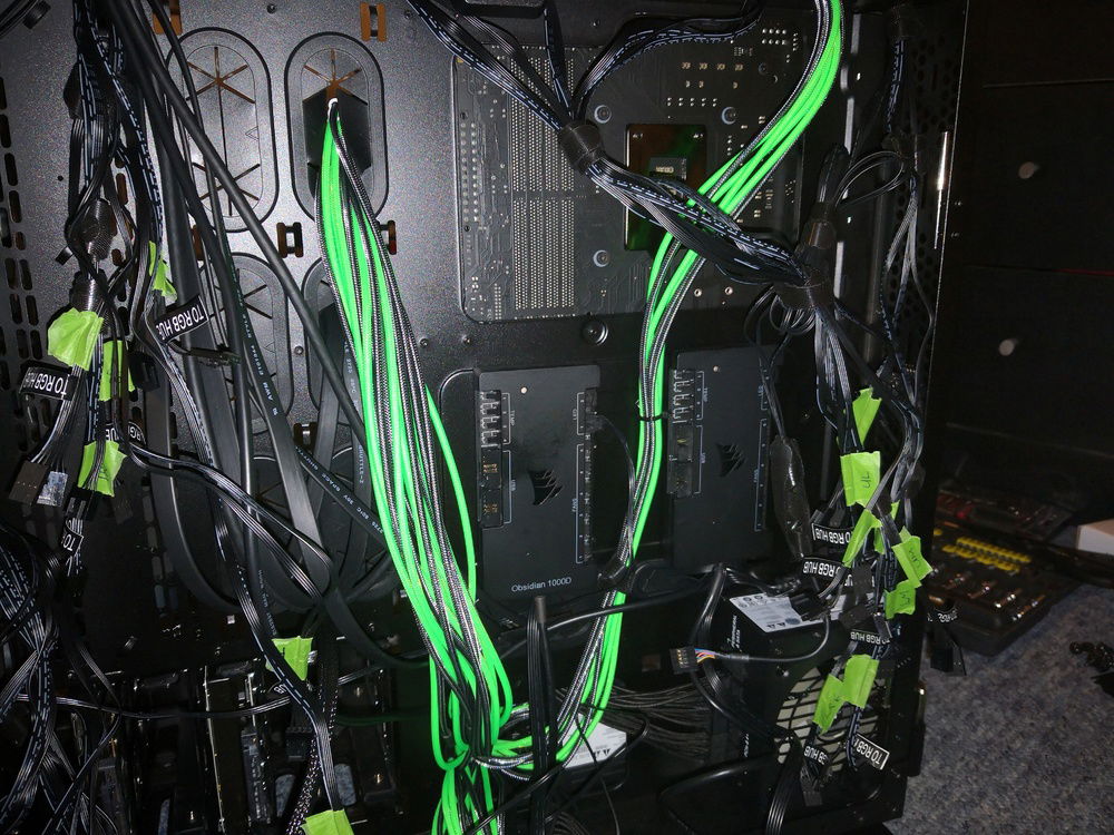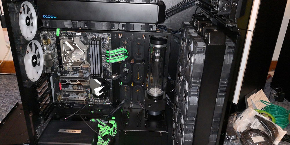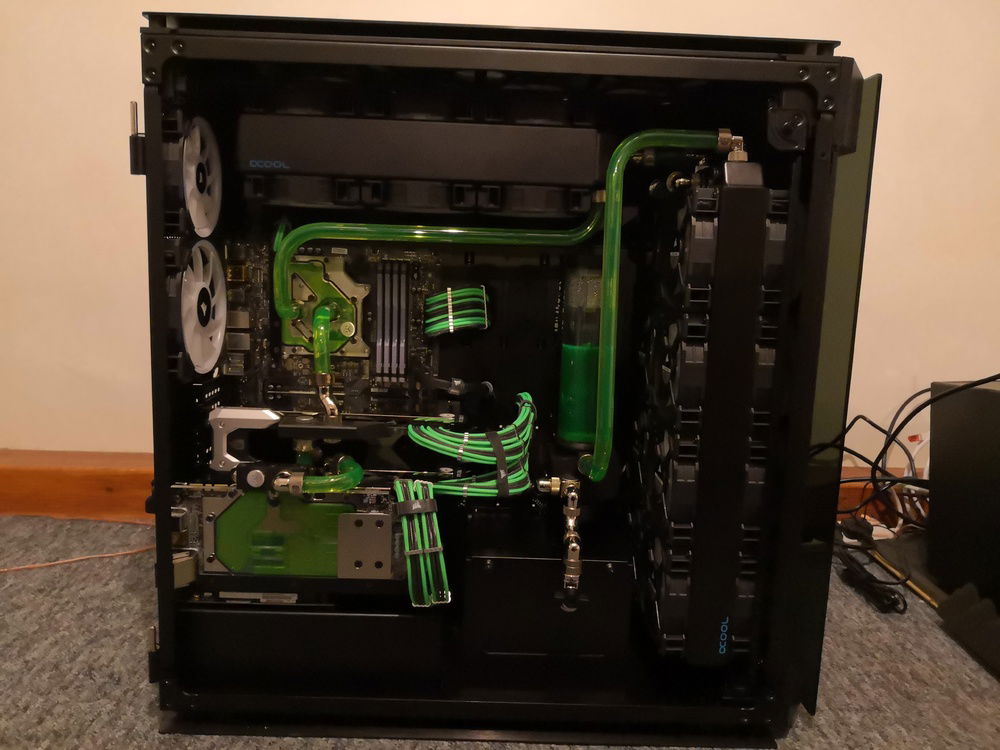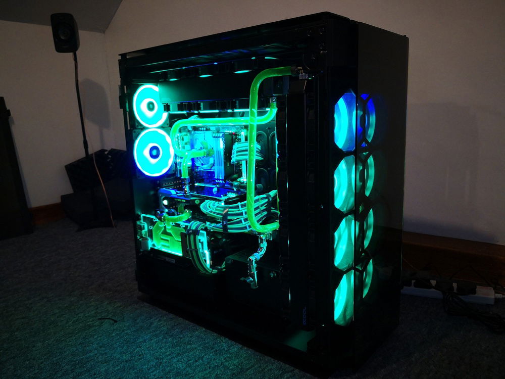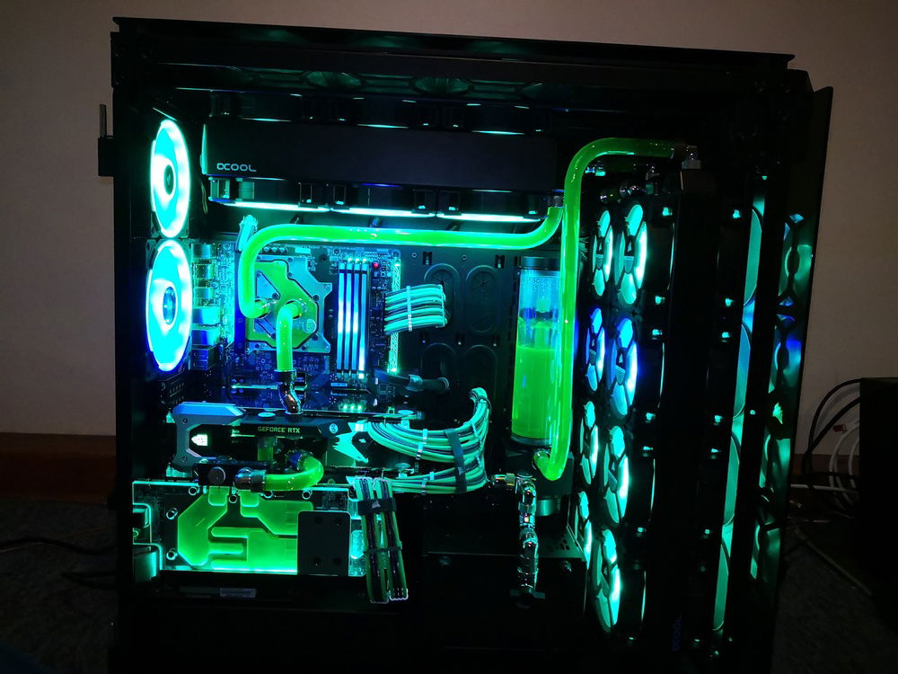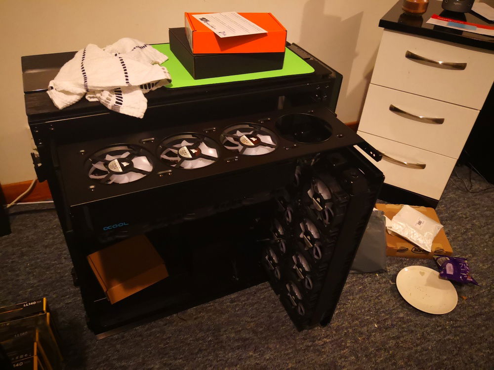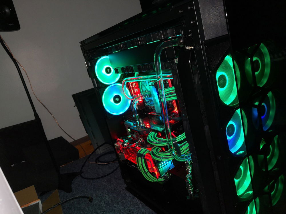 After months of hardware stocking, weeks of preparation and weeks of building... It's done. Build complete. Corsairs Obsidian 1000d case 2 PCs in 1; 24 LL series RGB fans; alphacool radiators and reservoir/pump; EKWB waterblocks and fittings and much more.