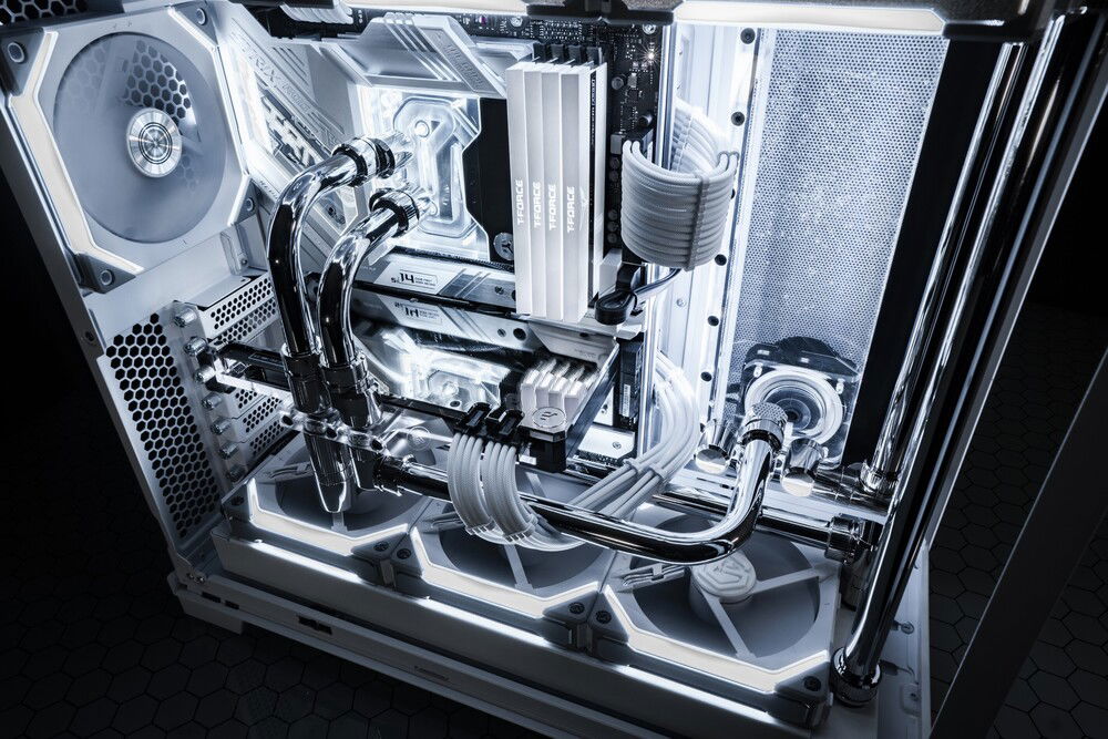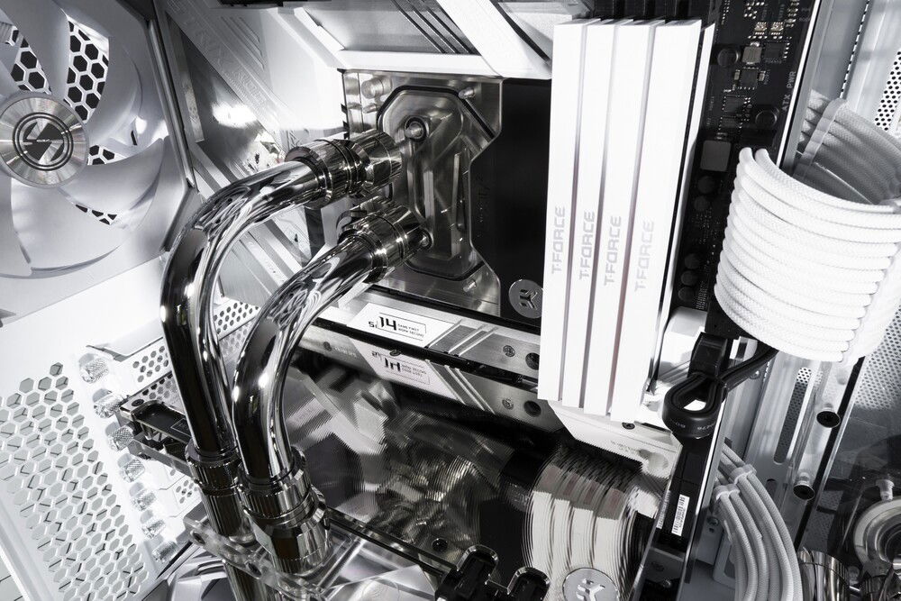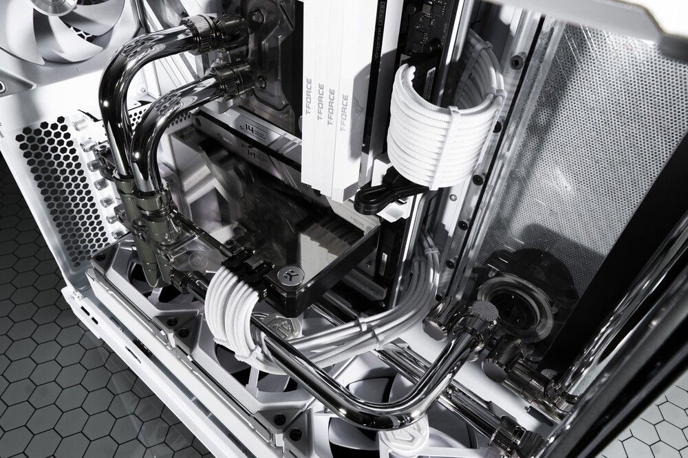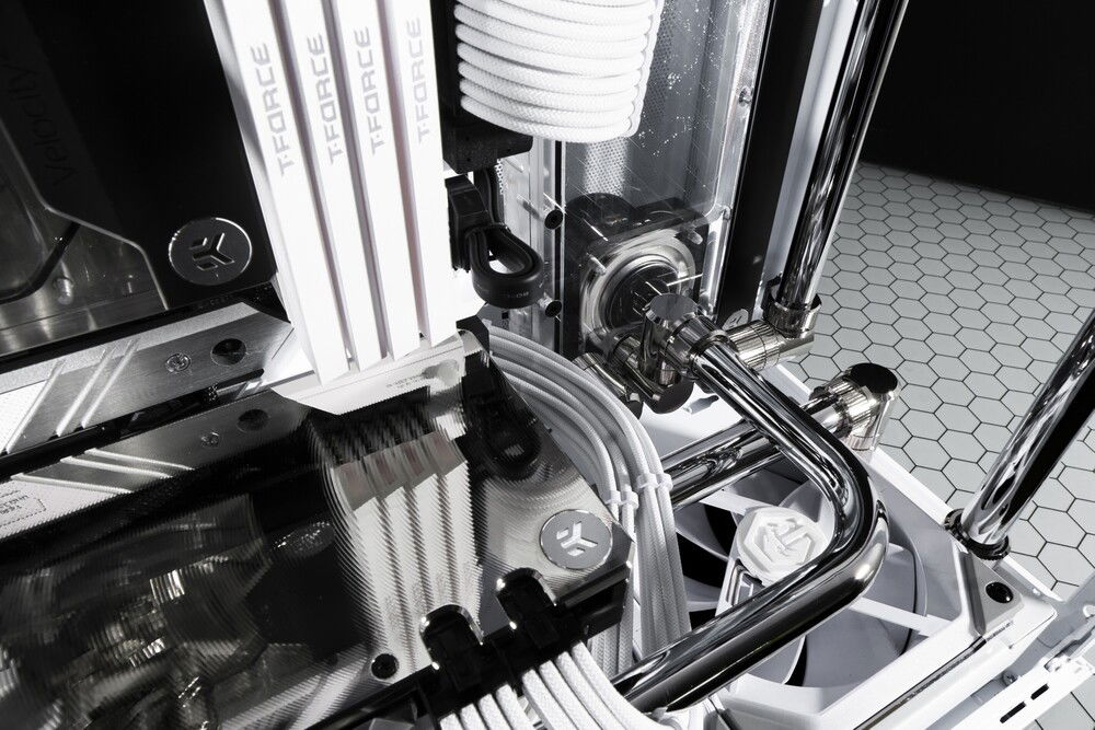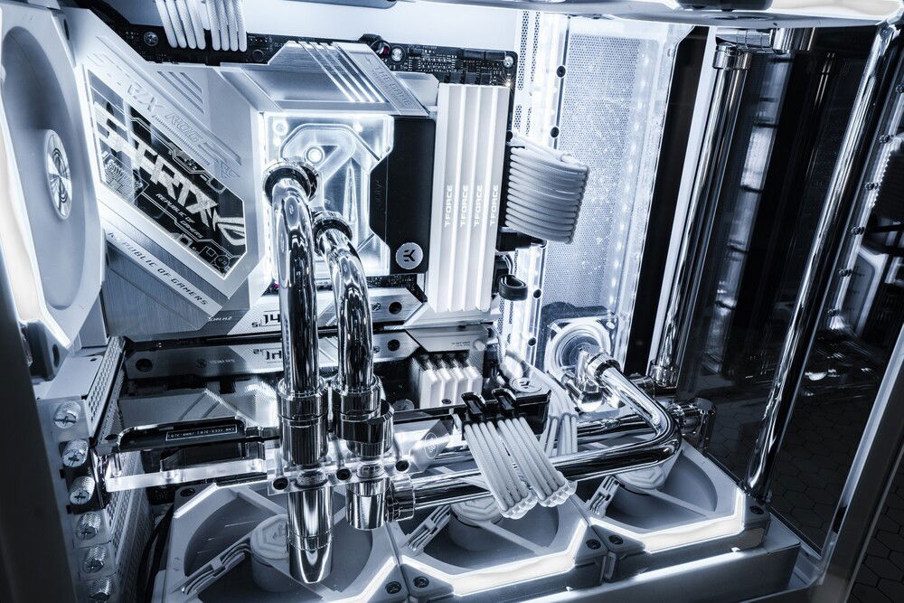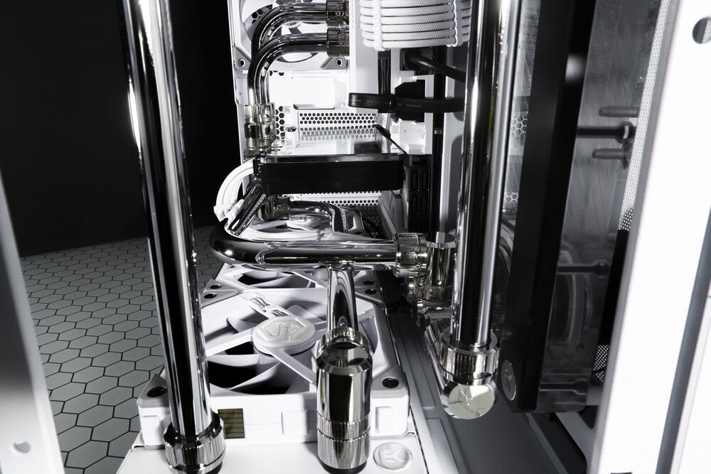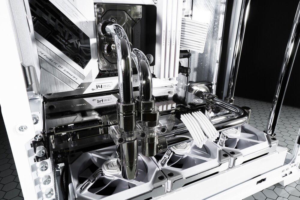 This build comes across as impeccably pristine. Pure white paired with chrome and nickel suggest the cleanliness and meticulousness of an operating theater. An Intel i7 12700KF and a Geforce RTX 3080 Trinity OC from Zotac slumber under the massive EK coolers. The white ASUS Z690-A board and memory from Teamgroup's Xtreem line ideally complement the look.