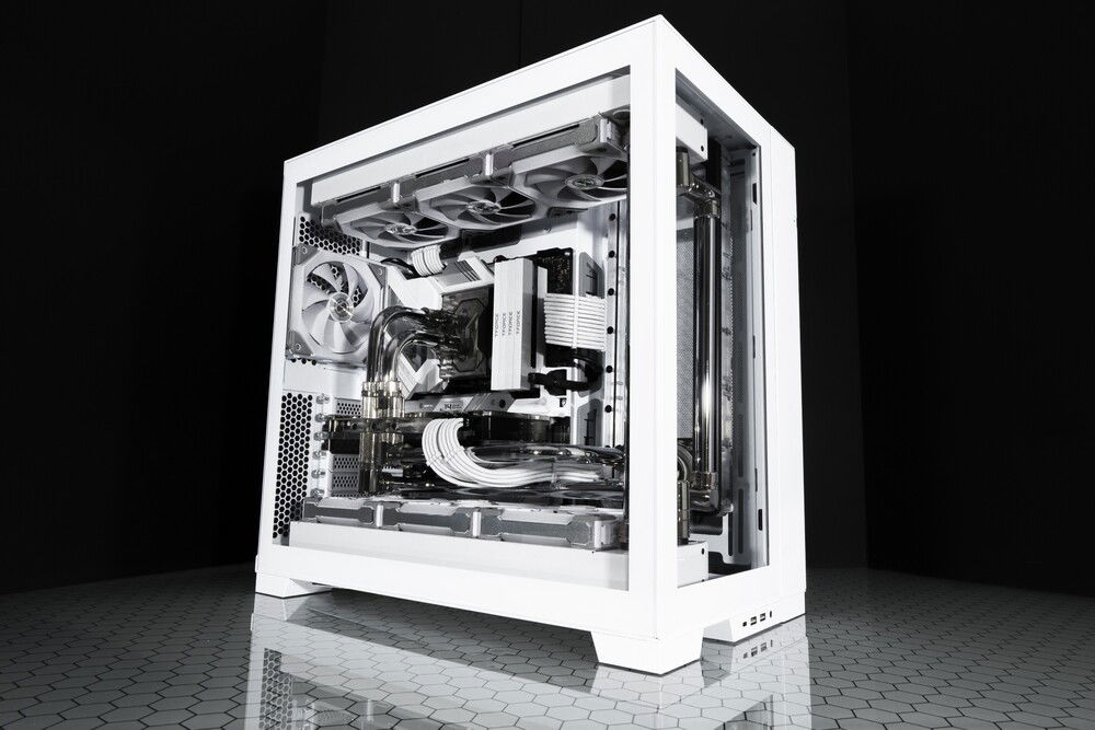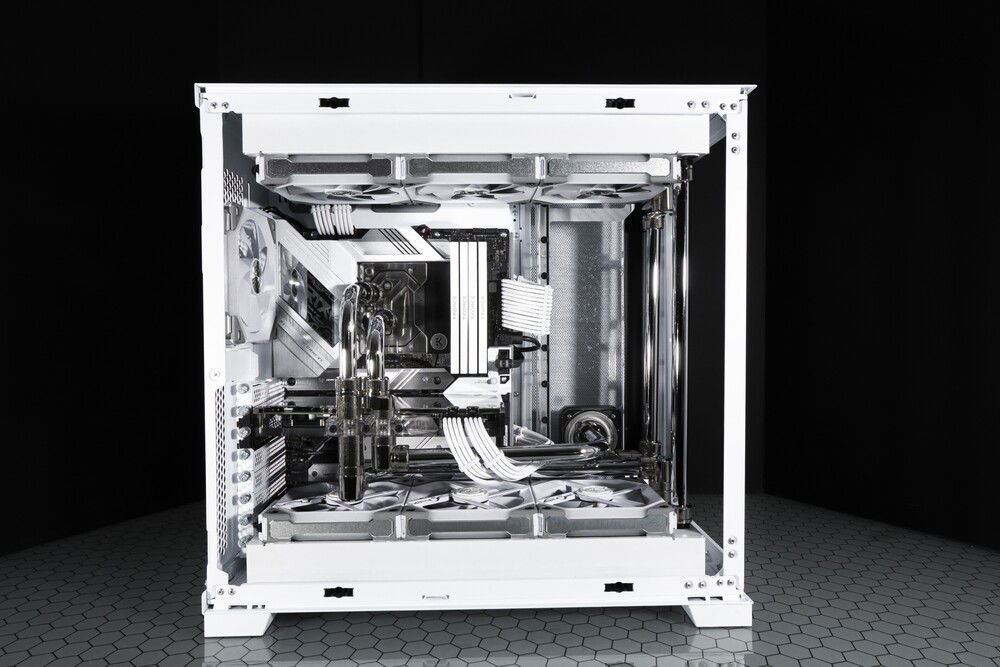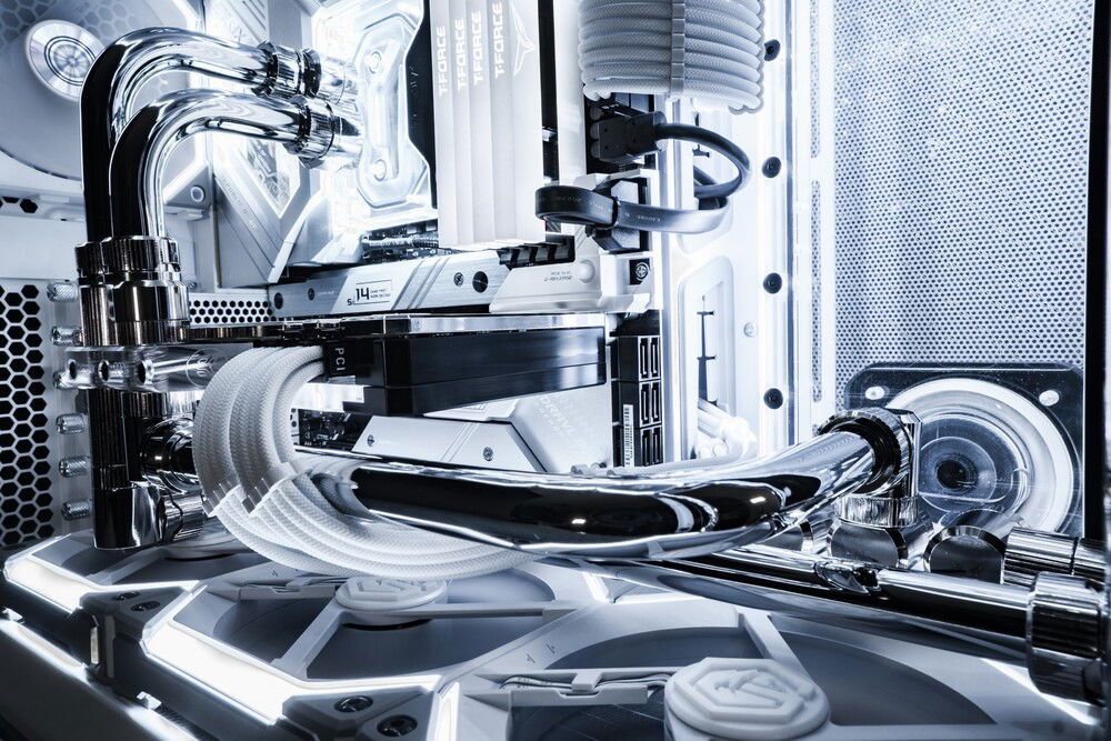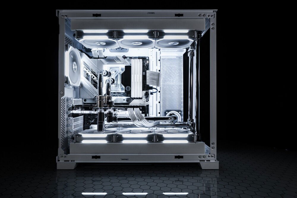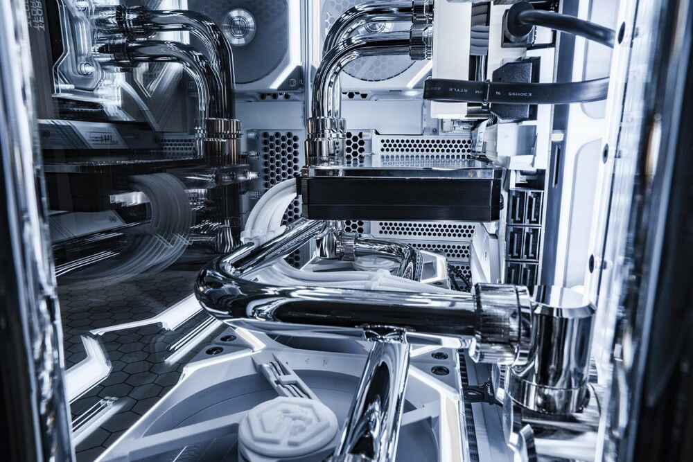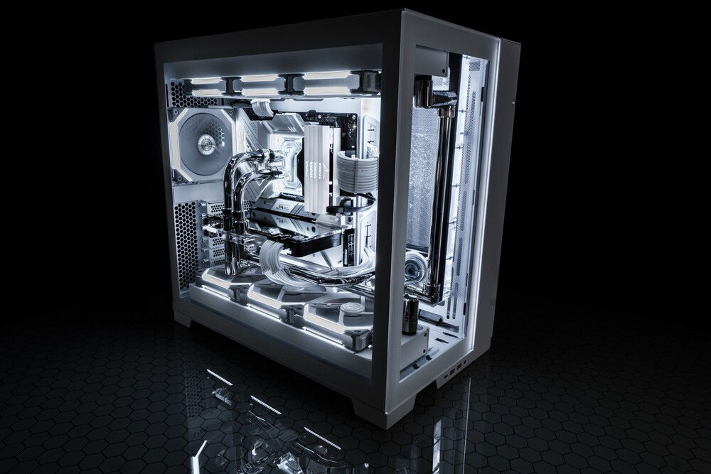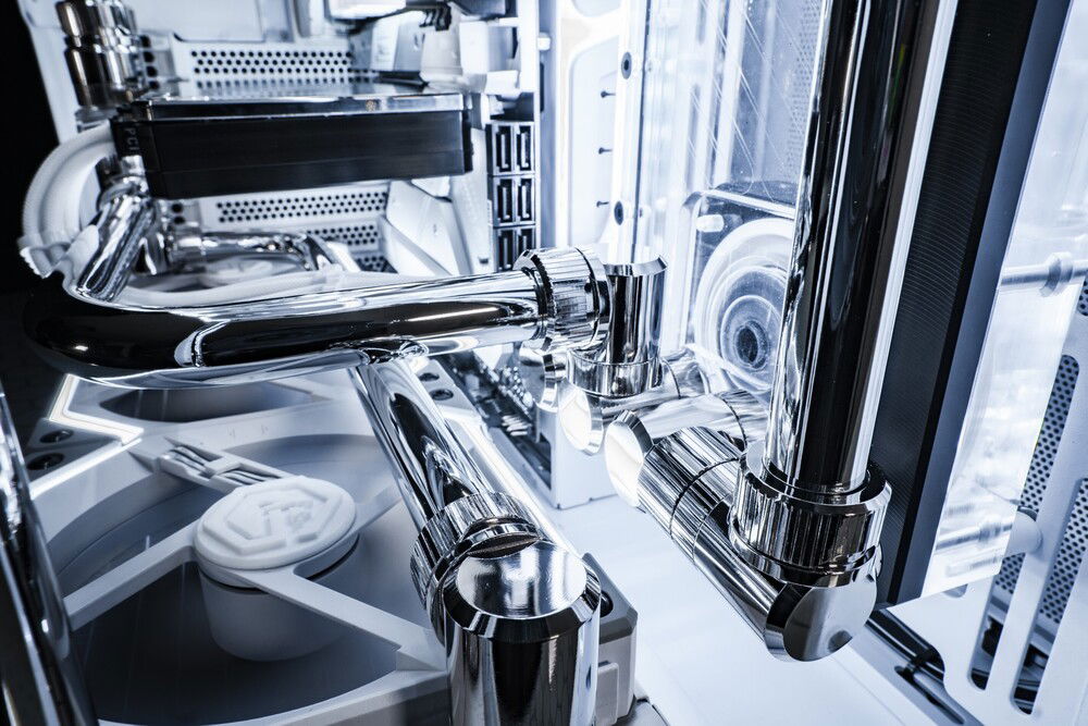 This build comes across as impeccably pristine. Pure white paired with chrome and nickel suggest the cleanliness and meticulousness of an operating theater. An Intel i7 12700KF and a Geforce RTX 3080 Trinity OC from Zotac slumber under the massive EK coolers. The white ASUS Z690-A board and memory from Teamgroup's Xtreem line ideally complement the look.