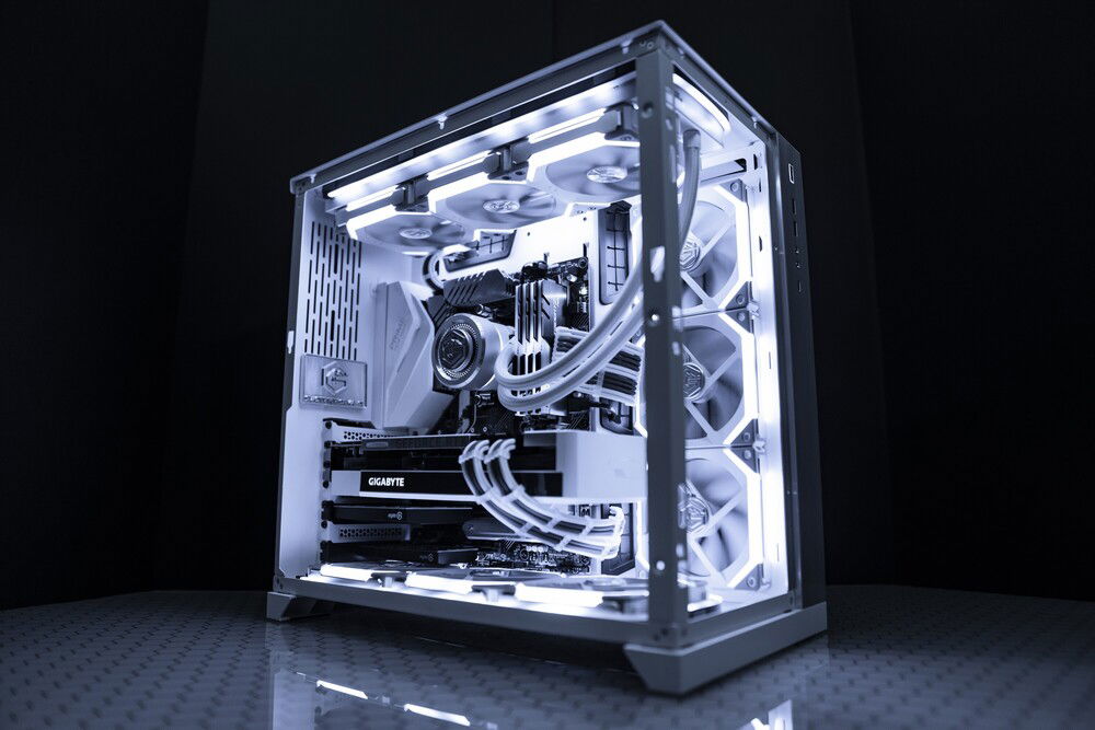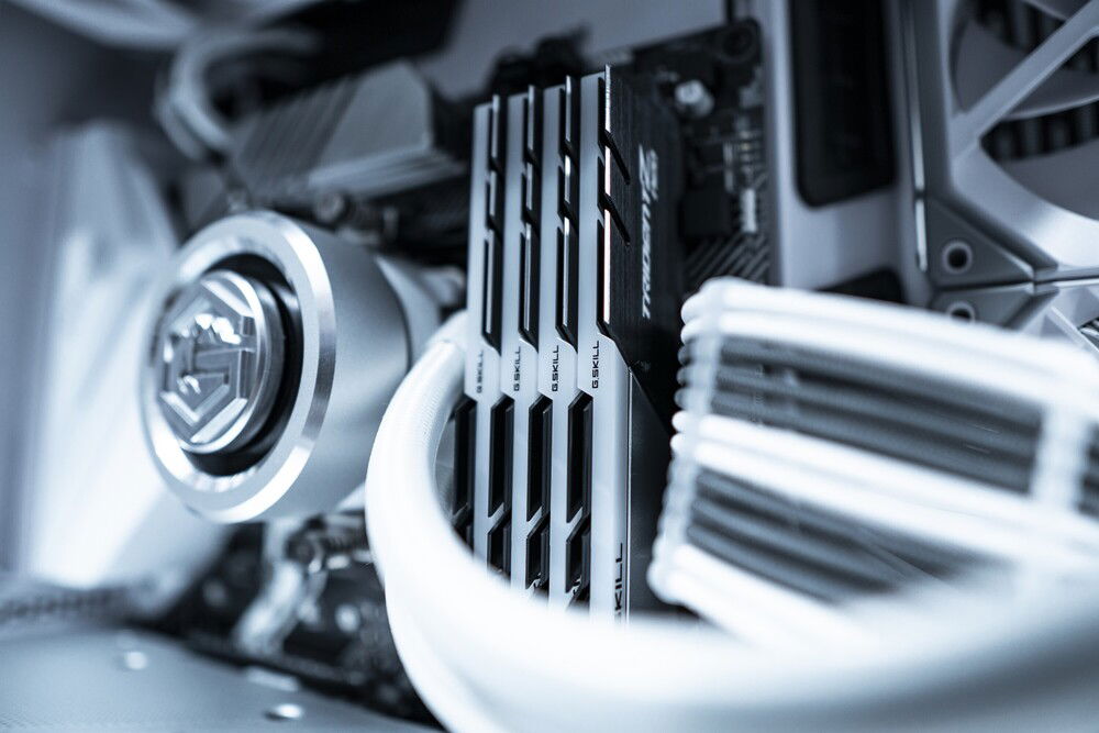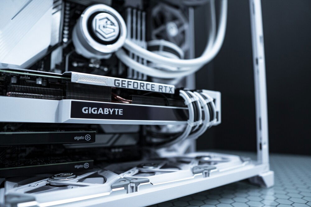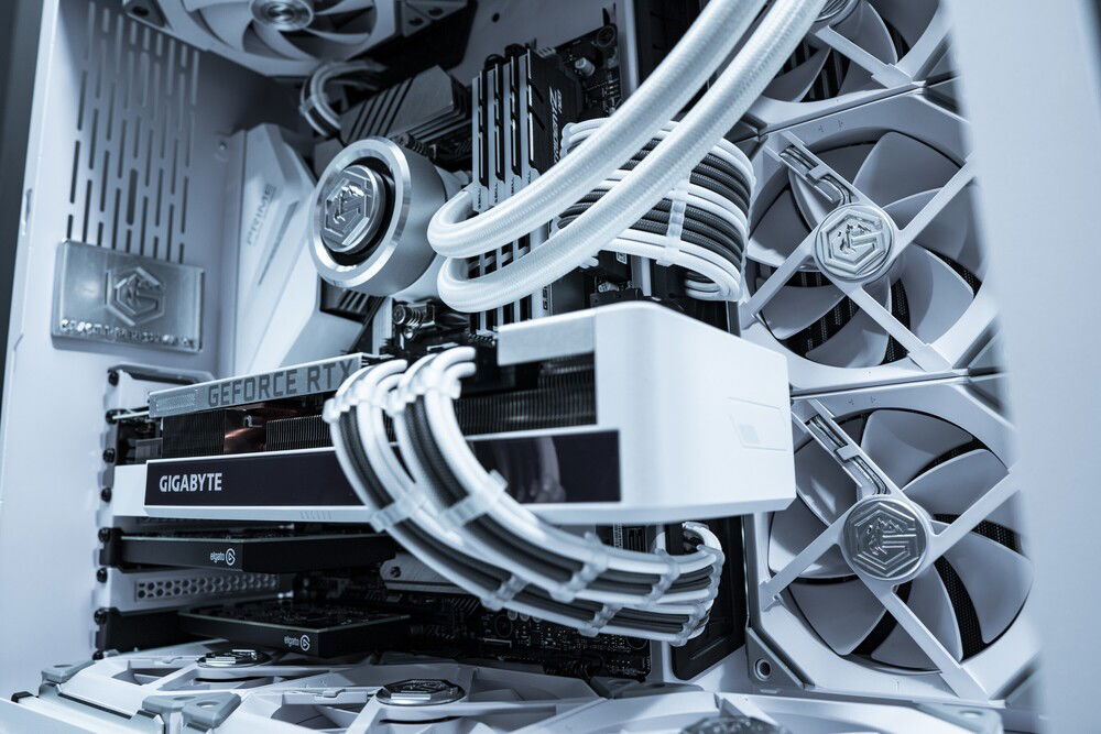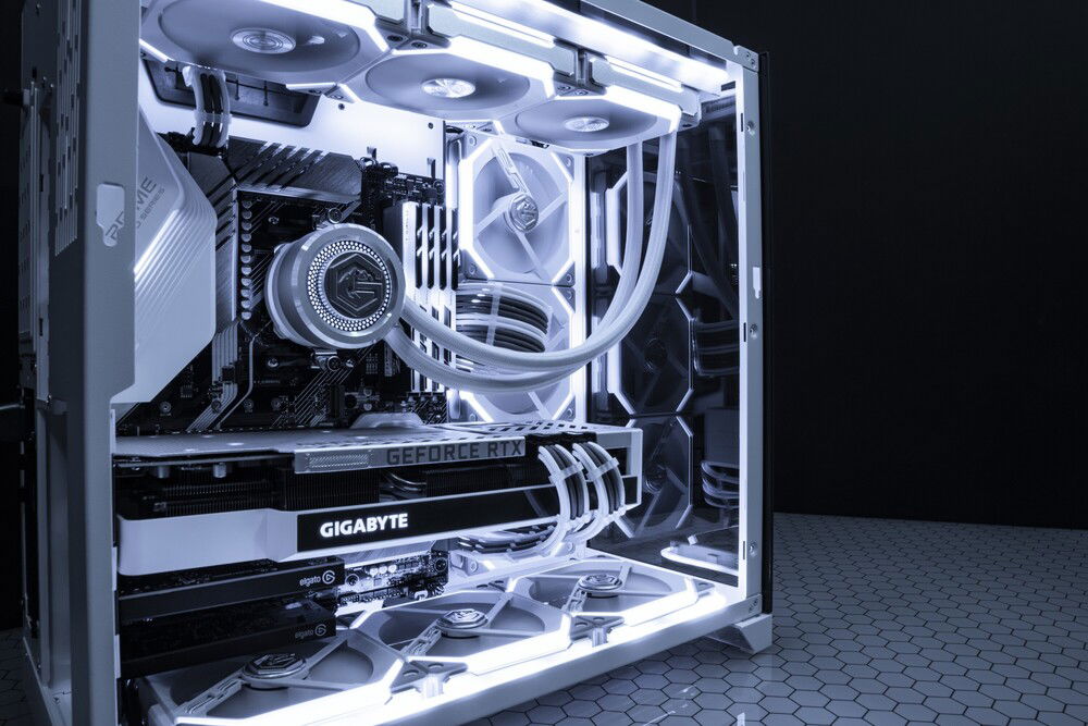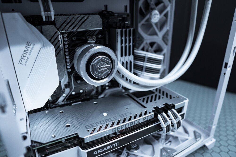 Designed in classic silver and white, this PC will primarily be used for video editing. The powerful 12-core Ryzen 9 5900X from AMD together with a Geforce RTX 3070 Ti from Gigabyte's Vision series and 64GB of RAM from G.Skill with a clock rate of 3600MHz are provided for this. In addition to these, two add-on cards from the Elgato brand assist with video processing, namely the Game Capture 4K60 Pro MK2 as well as the Cam Link Plus. Nine UNI Fan SL from Lian Li provide sufficient ventilation, and the CPU is kept in check with the Galahad-AIO in the 360mm variant from the same brand.