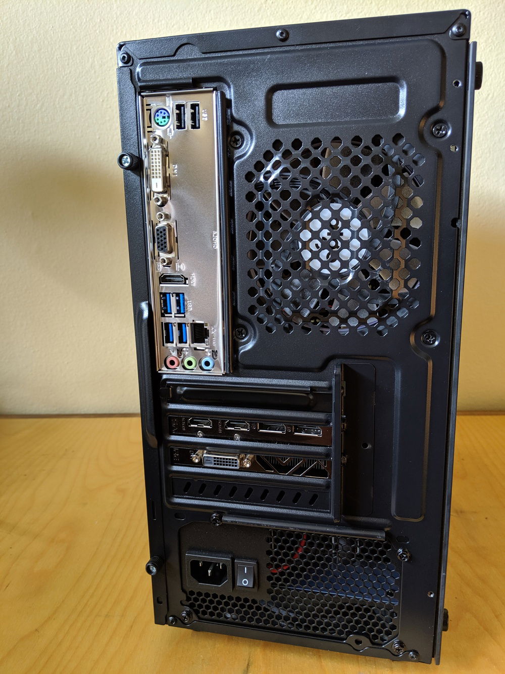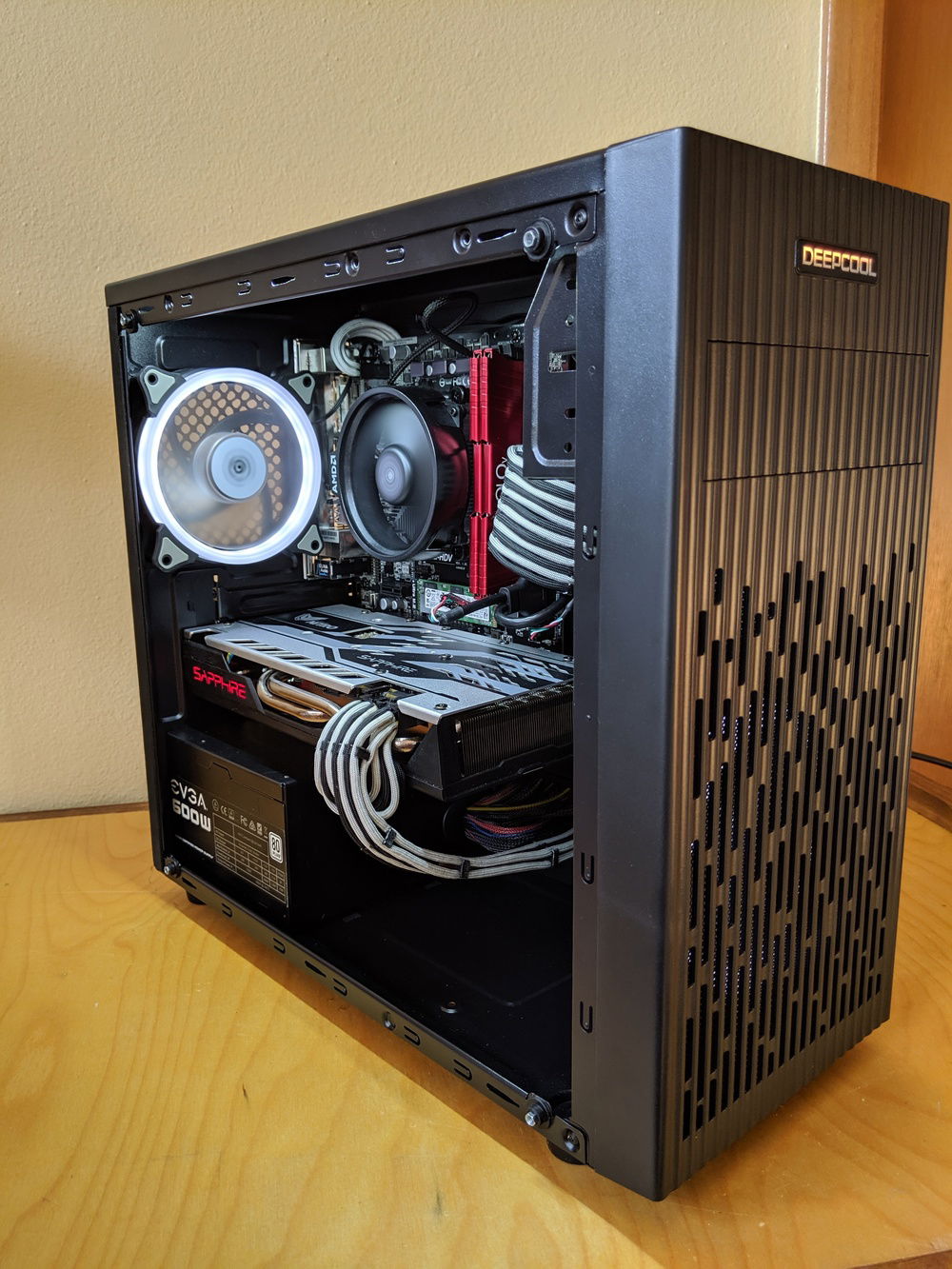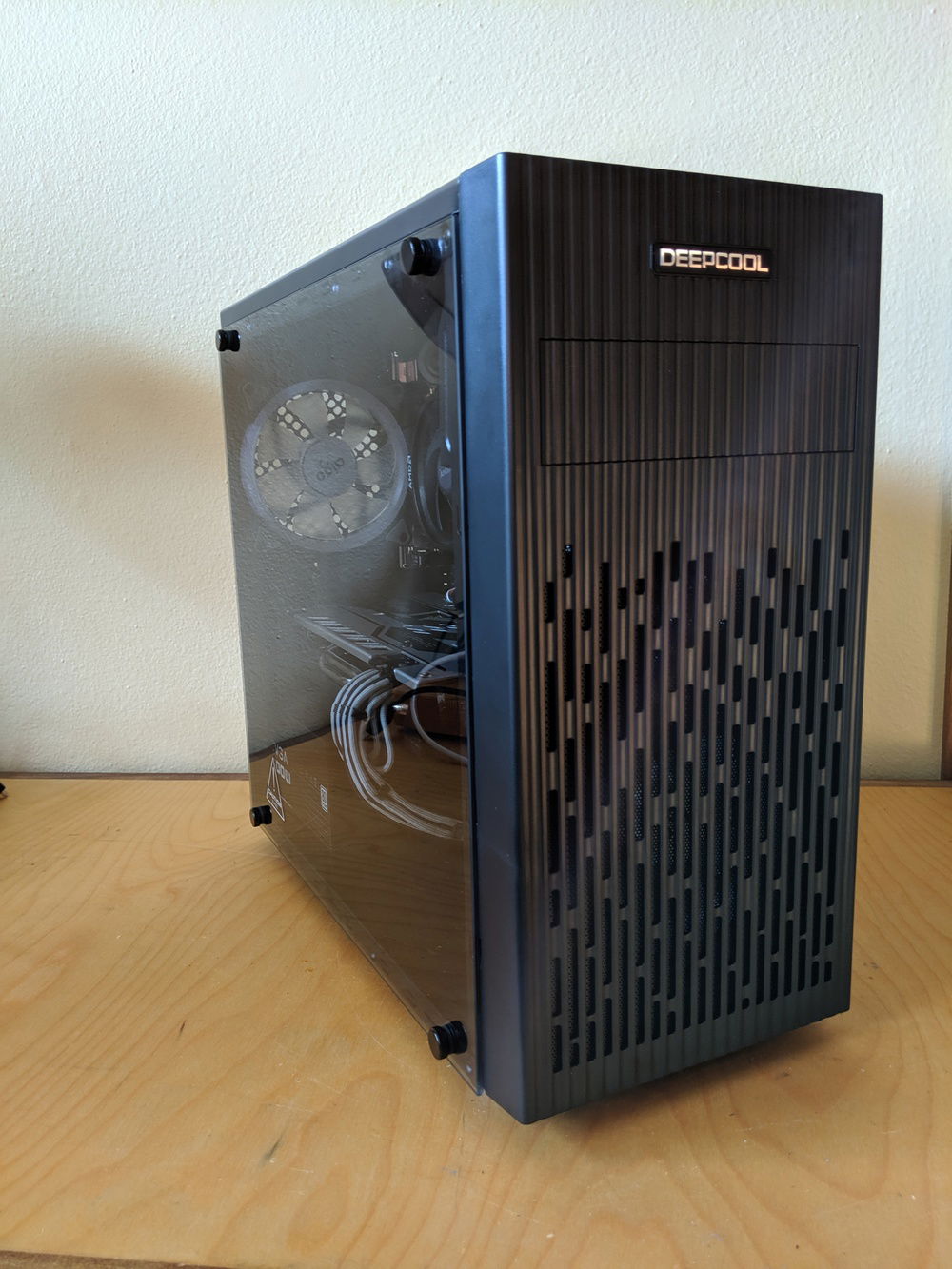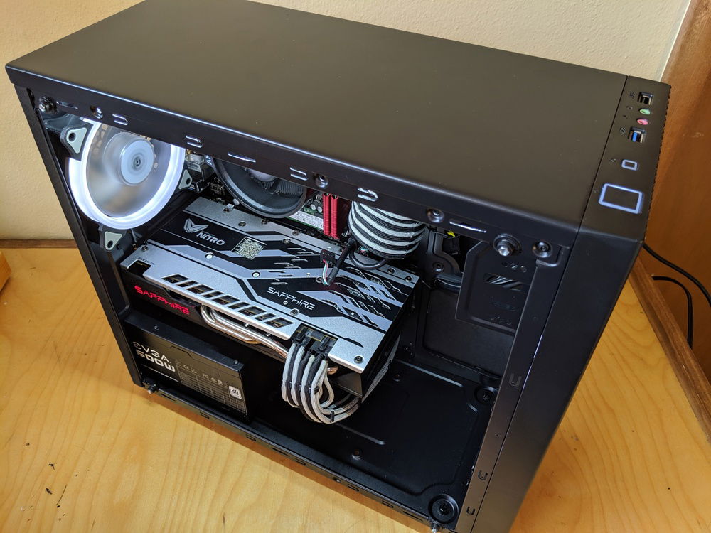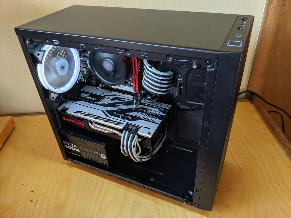 I bought this case as its the cheapest tempered glass case I could find. Acrylic side panels scratch too easily for me to build with them anymore. The case is a pretty standard cheap case with poor cable routing and no nice-to-have features. It would probaby be $15 - $25 with a steel/acrylic side panel. The front panel looks pretty nice and provides decent filtered airflow - much better than some of the other cheap cases from Cooler Master and Thermaltake. I had to drill out the some rivets to remove the 3.5" HDD cage to make room for the GPU ( a slightly shorter one would have fit ). I also had to cut out some of the steel in the front of the case to get airflow from the front fan. It wasn't pretty, but it was easy. The GPU runs nice and cool with this setup - never above 75 deg C in Furmark.