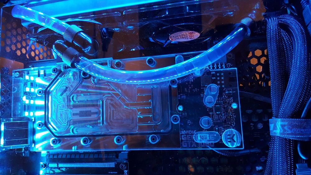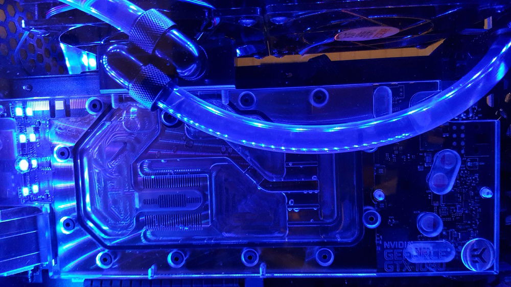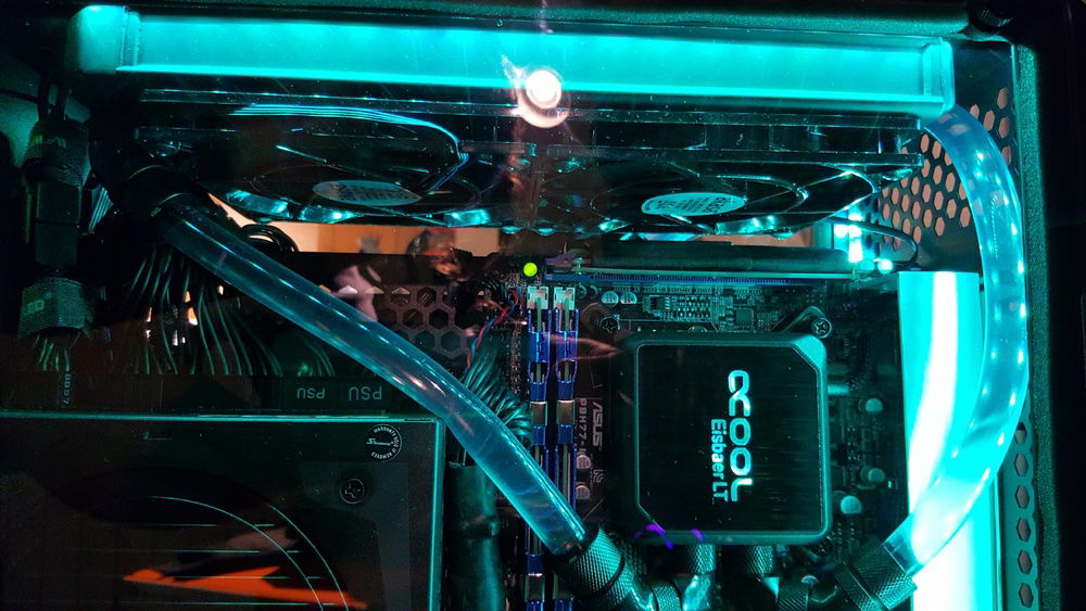 Mainly built from old hardware with the exception of a GTX 1080. CPU is a Xeon E3-1220v2 with 8GB of DDR3 ECC memory taken from an old server and some blue heatsinks from ebay. Motherboard is ASUS P8H77I. BCLK is at stock and RAM is overclocked mildly to 1400Mhz. The motherboard has a custom white cover on the I/O made out of plexi and white vinyl. Cooling is built around Eisbaer LT pump/block combo with a 240 radiator and an EK 1080 FE block. RGB provided by some cheap strips from ebay and a CoolerMaster C10L controller. Fans are all Akasa slim. One of the radiator fans is connected directly to the GPU via an adapter so it can run independently from CPU depending on the load. Temperatures are well in check even though the pump is too weak to even push bubbles out of blocks and tubes. Running CPU stress on Linux along with Unigine Superposition gives 65c on all cores and GPU.