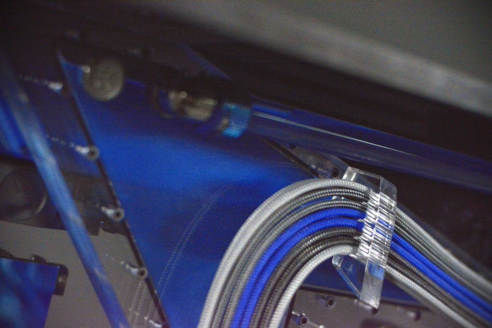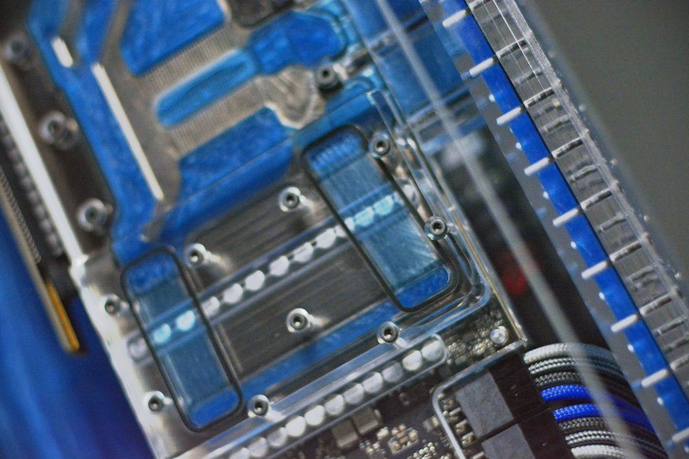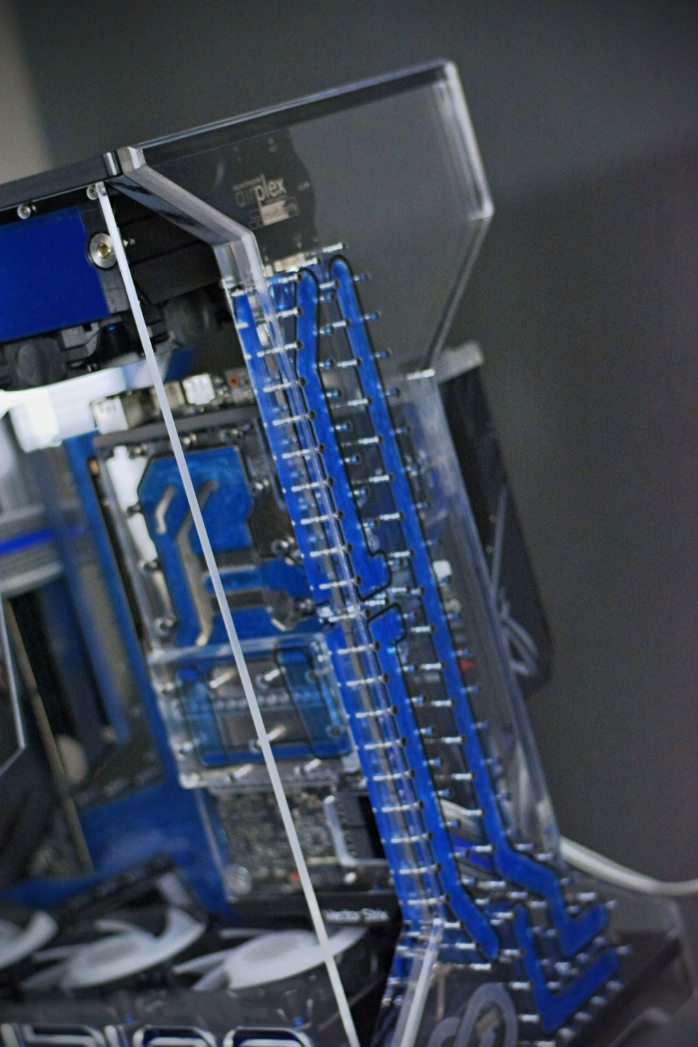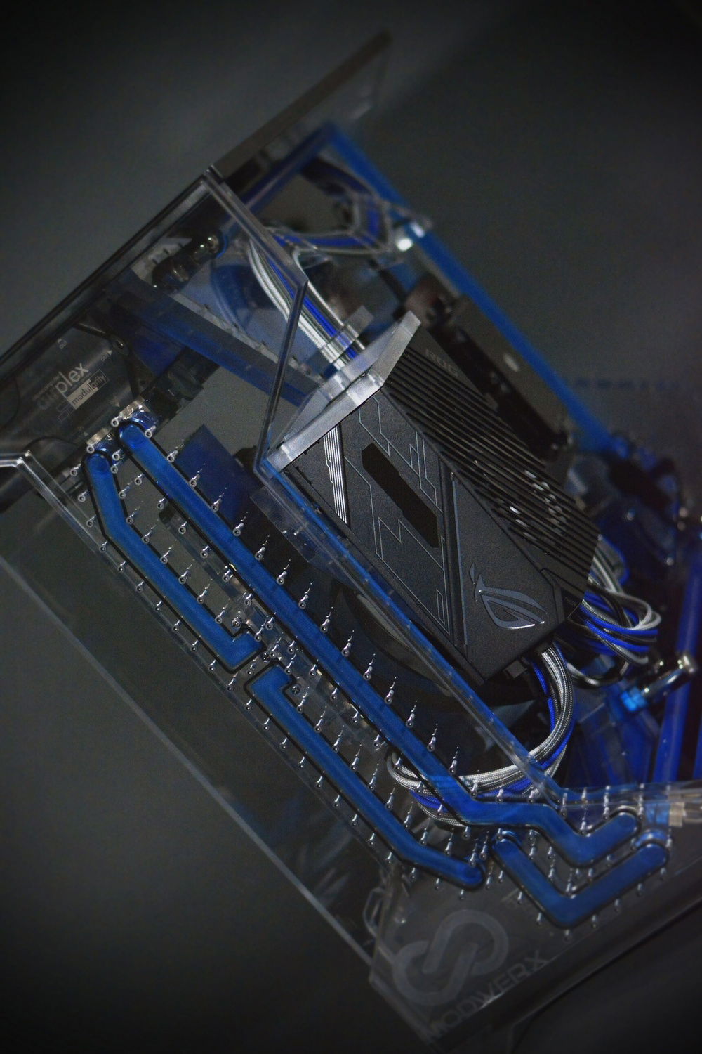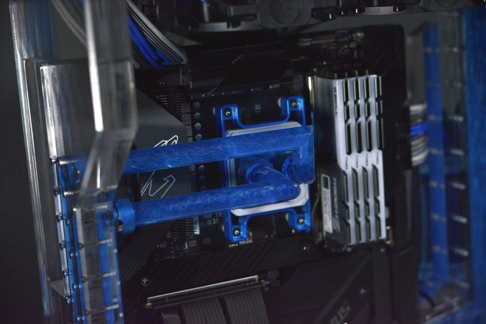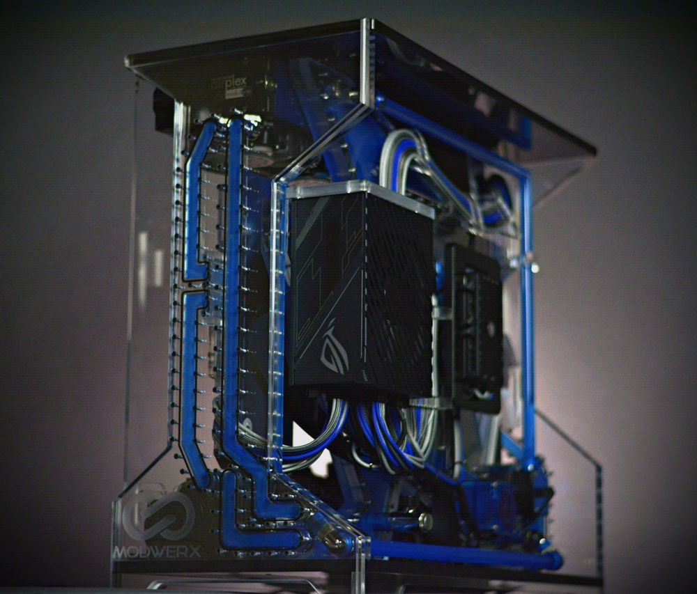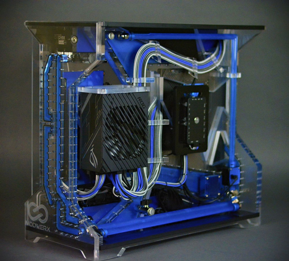 Scratch built case from acrylic in black and clear. Radiators, fittings, and other various components have been powdercoated in LP blue from Prismatic Powders. Tubing was cut and joined together using a chemical welding process and eliminated the need for bends using heat. The front and rear panels have been designed to be coolant channels or more commonly referred to as distro plates to tie the front and rear together. The motherboard panel is also a reservoir and uses a crazy shape that's not used in many reservoirs. I wanted something that went far outside the usual square box style steel/aluminum enclosures that are so common with PC building. The insane shapes and harsh lines make this a one of a kind build for sure. I hope you enjoy the pics as much as I did designing and building it. This case will be available for sale once I make the necessary adjustments to my drawing. There will also be a smaller version of this model to hold 2 360mm radiators as well. This build was a prototype and as such should be viewed that way. This is in now way a finished production ready enclosure. If you have an interest in purchasing one of these cases please feel free to contact me.