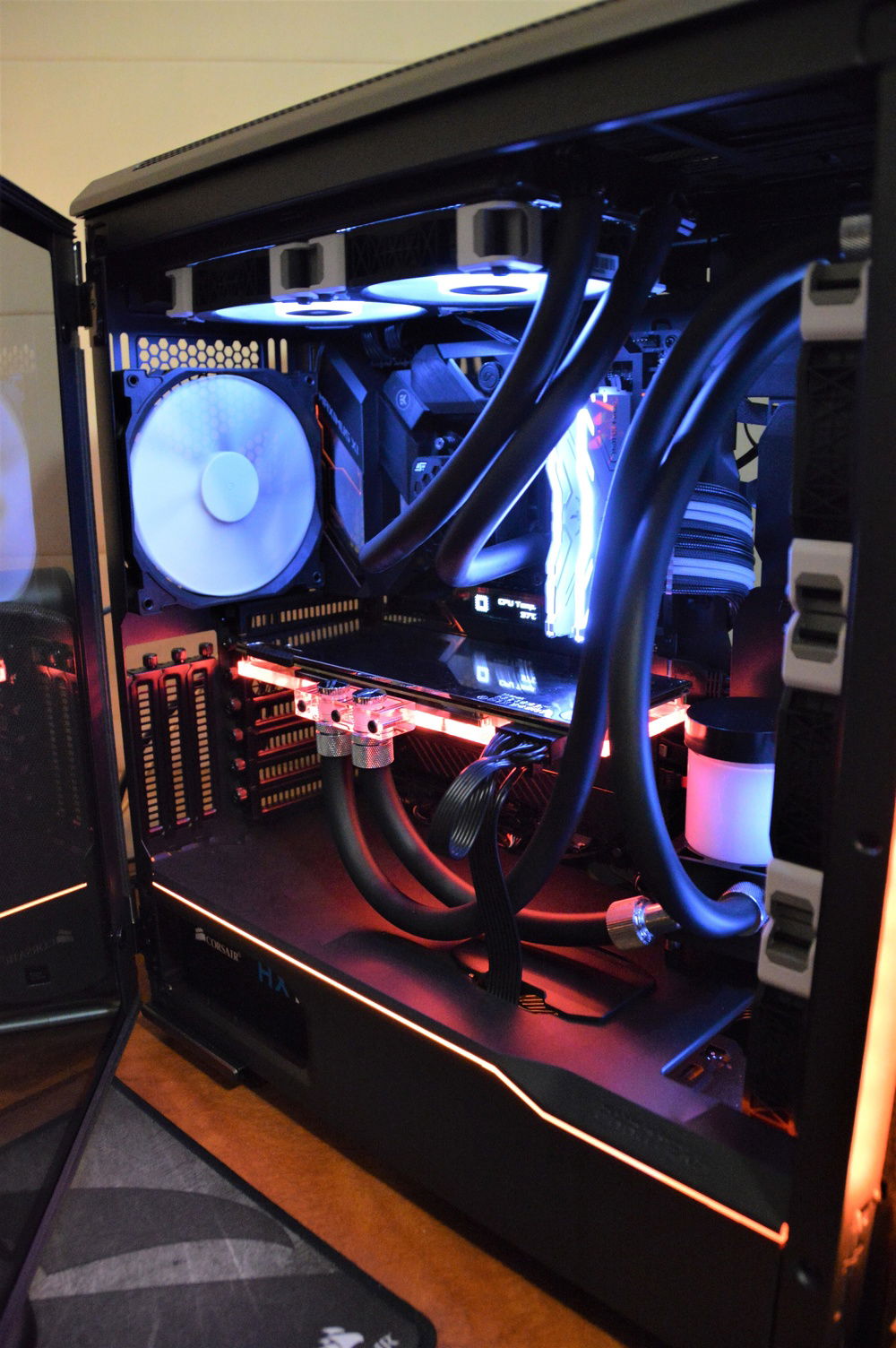 this was done with minimal effort, being stage 1. honestly very surprised it looks as good as it does. zero f's were given to the water loop as stage 2 i am planning on rebuilding it with all custom watercooling, including custom made distro blocks. money aside its i don't know when i will go about that as im really happy how it looks, other than needing a new custom sleeved cable for the GPU. plan on going dual 1080ti's which i will do as soon as i find another cheap one. cpu is delidded and has been tested to be stable at 5.2ghz at 1.42v. which threatened to burn down my house so its sitting at 5.0 now haha. only other thing to note is the price of the system. it's a great example of if you are ready and waiting for the right deals, bargain hard and you can find some amazing savings. oh and you may have seen the weird speakers. story behind that is I'm mostly a headphone guy and have spent silly amounts of money of headphones over the years. need to buy more headphone stands so i can display them all what would make for a cooler set up picture :P. but back to the speakers, they are home theater front speakers because f spending any more money on sound. It has a very large sub underneath on very low (also acts as a great foot rest) and a receiver that is connected to my external Dac which i also use to run my headphones. other than the very big receiver its a hell of a sound set up for free. its just parts lying around that weren't being used. new these speakers were $2000 for the full 7.1 set up a few years back when bought new. but you can see examples of home theater speakers selling used for next to peanuts ($50) everywhere. they sound really really good, i thought they wouldn't work well not being designed for such close listening.