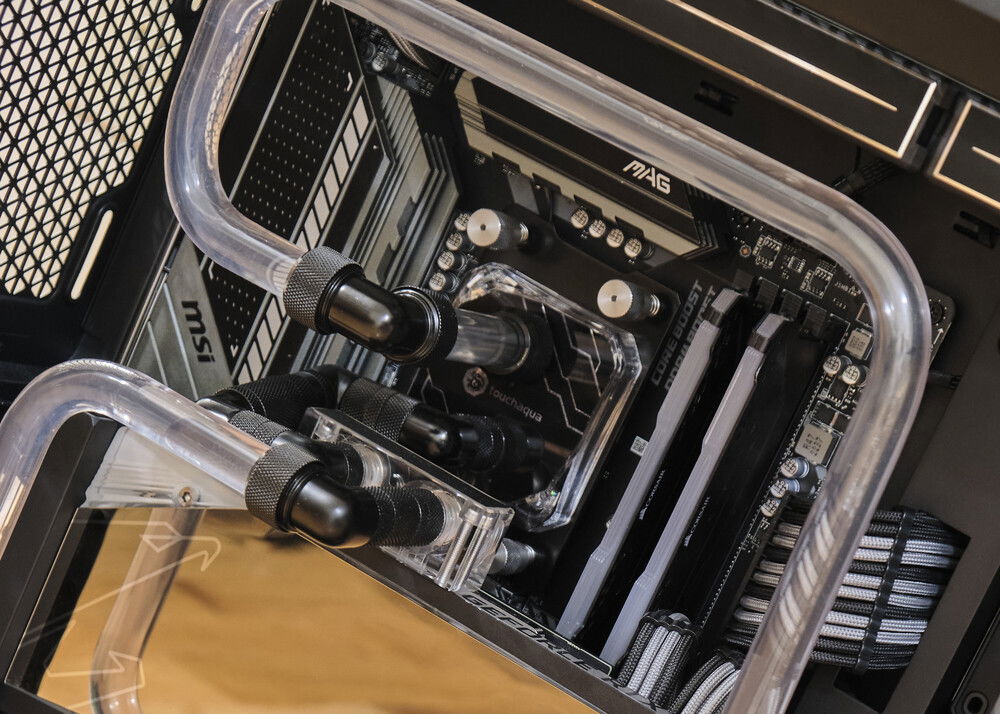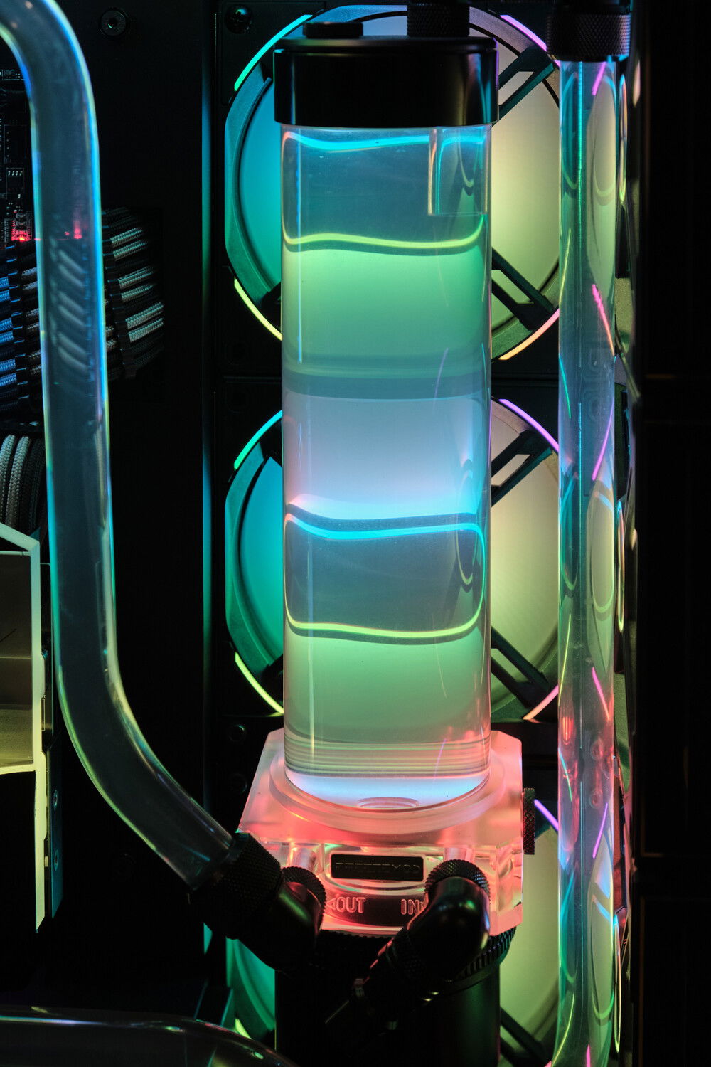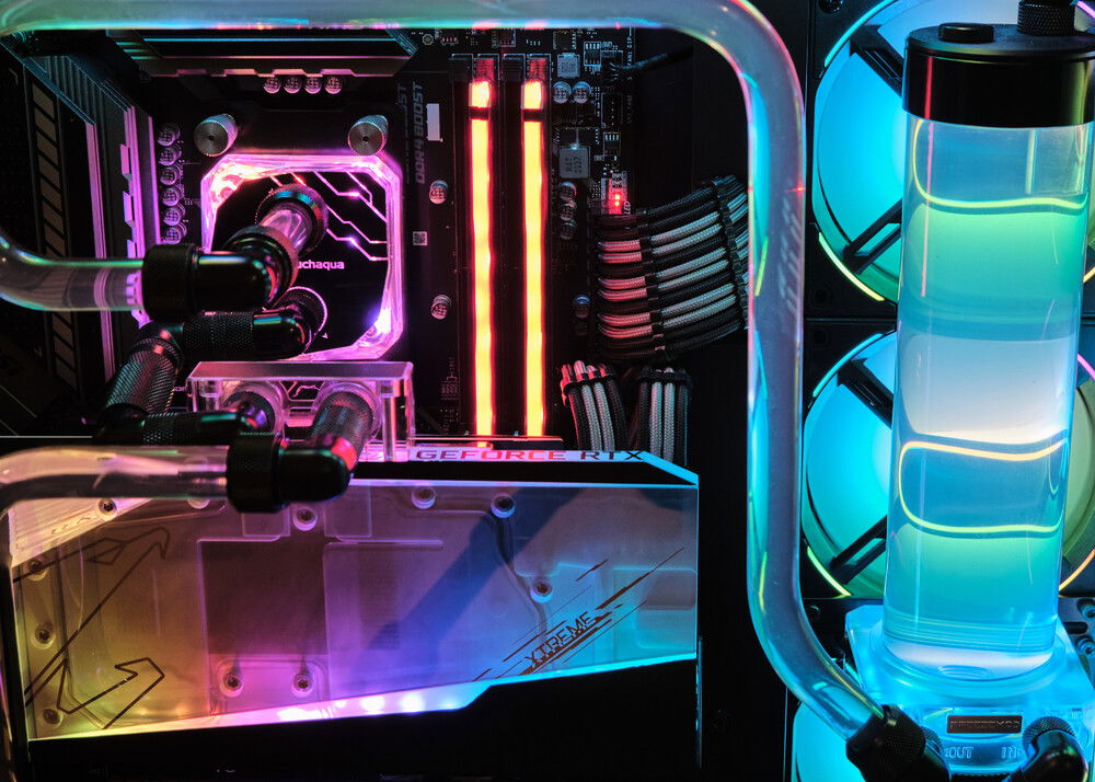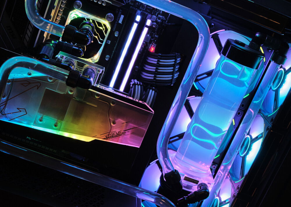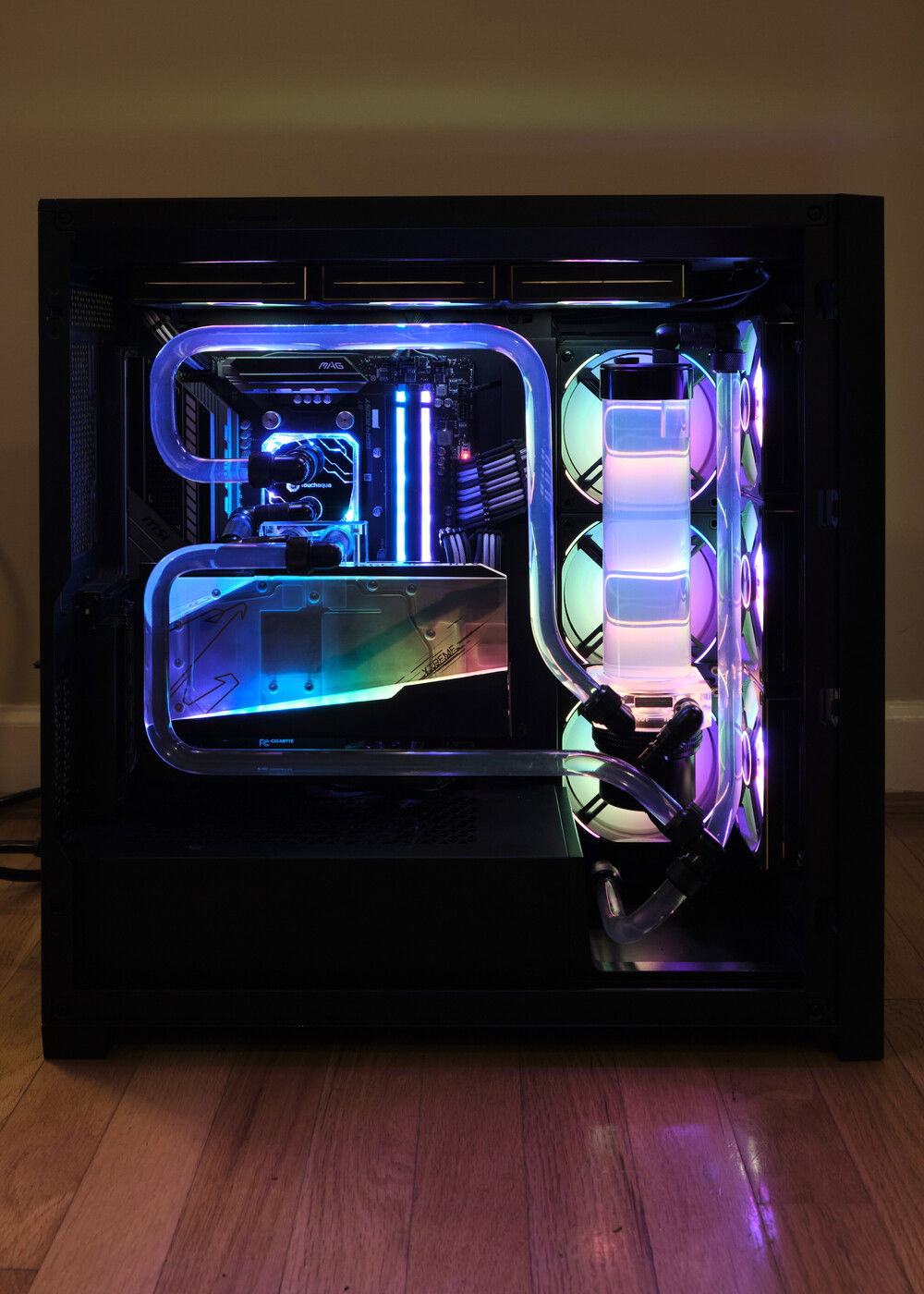 Client build. Wanted full RGB so I didn't even bother setting any lighting profiles. Coolant is a custom mix to be a slightly gray version of what EK Mystic Fog is. It consists of XSPC EC6 clear, a tad of EC6 white, and two drops of XSPC black dye. It came out pretty great in my opinion. It creates a bit of a psychedelic effect in the reservoir with the fan lighting behind it.