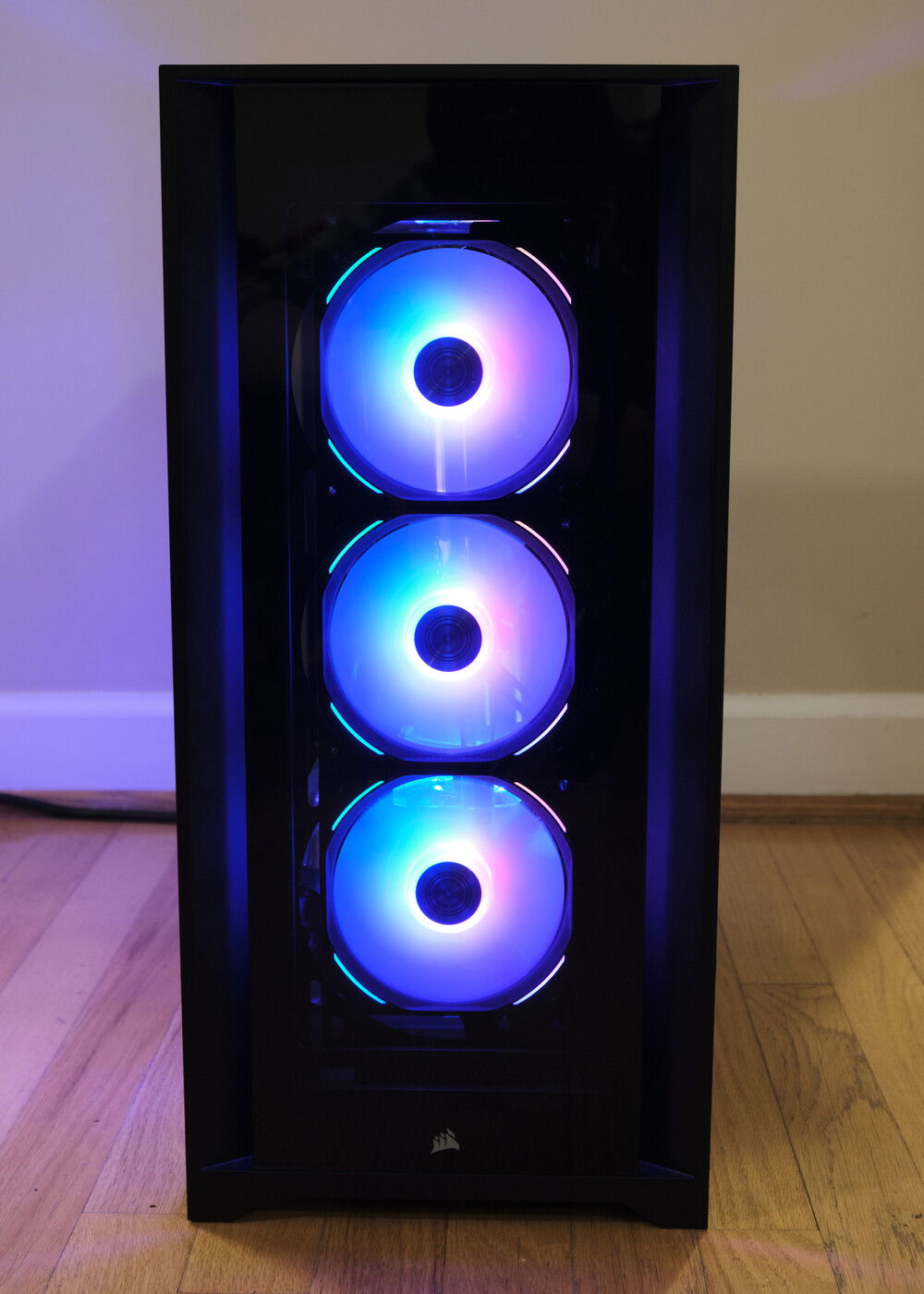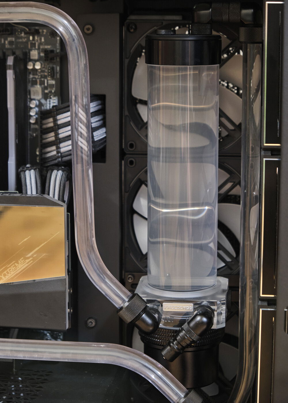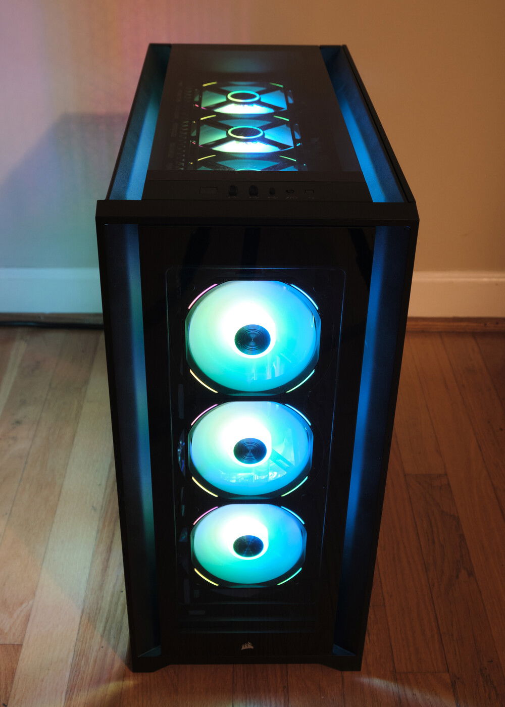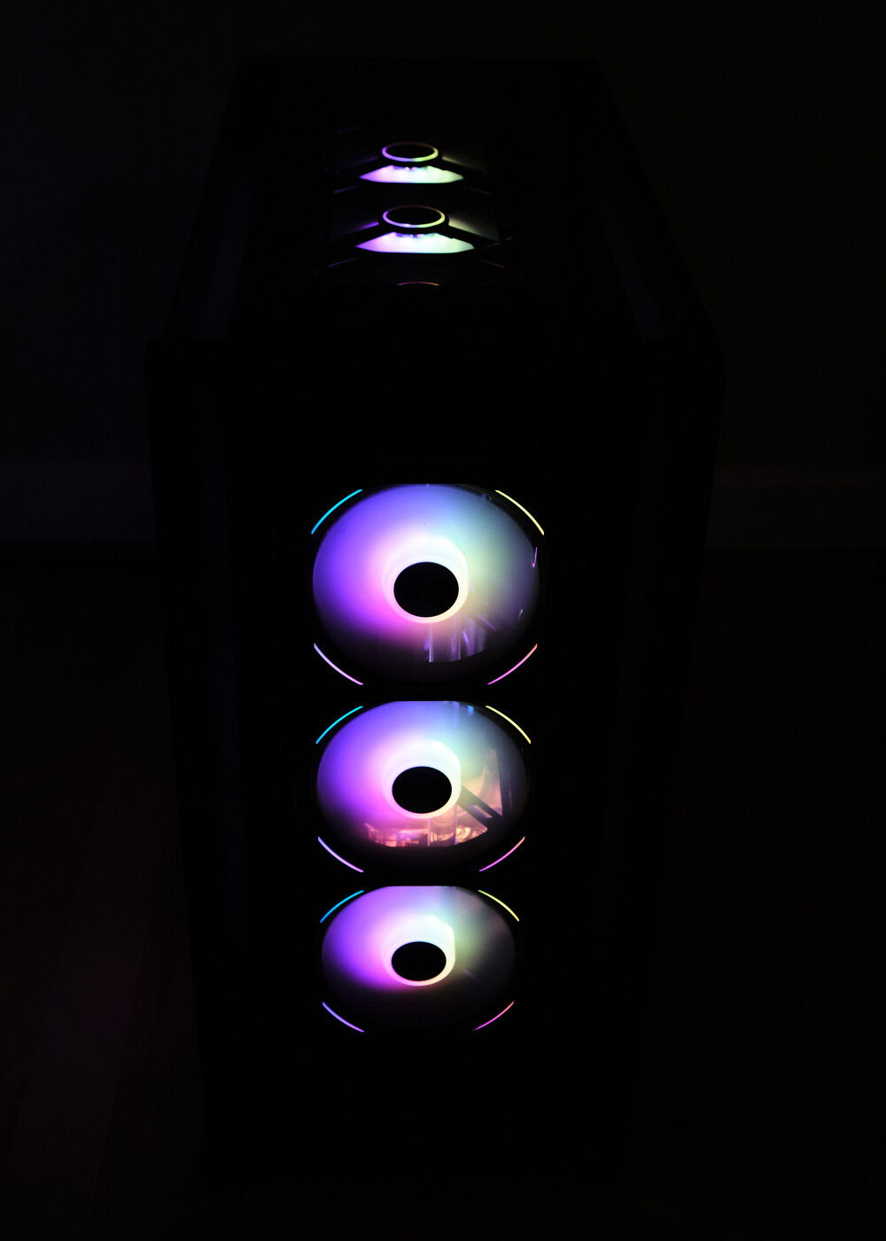 Client build. Wanted full RGB so I didn't even bother setting any lighting profiles. Coolant is a custom mix to be a slightly gray version of what EK Mystic Fog is. It consists of XSPC EC6 clear, a tad of EC6 white, and two drops of XSPC black dye. It came out pretty great in my opinion. It creates a bit of a psychedelic effect in the reservoir with the fan lighting behind it.