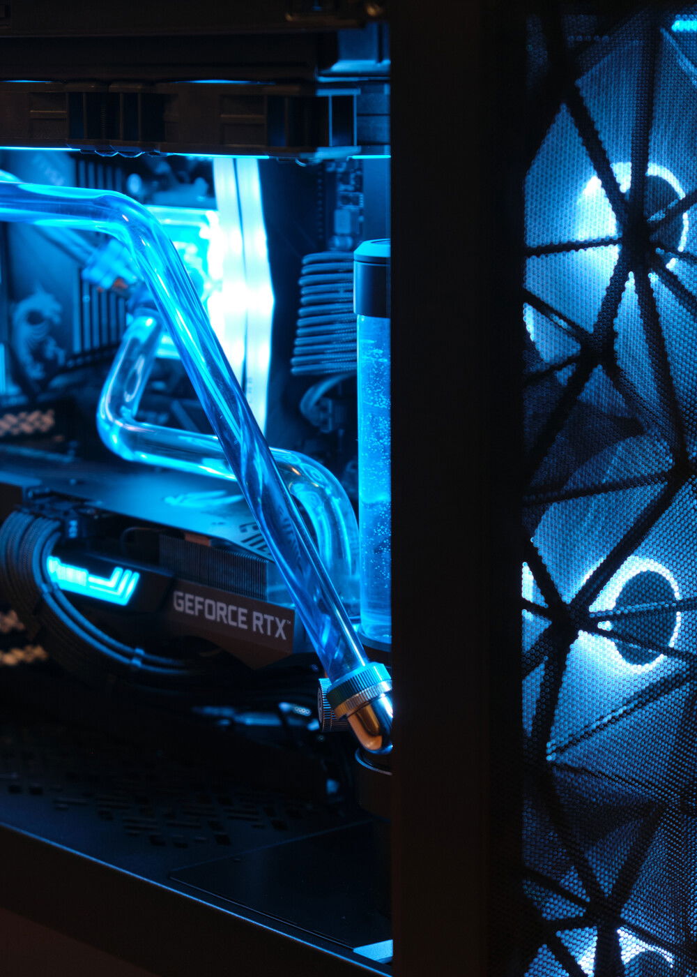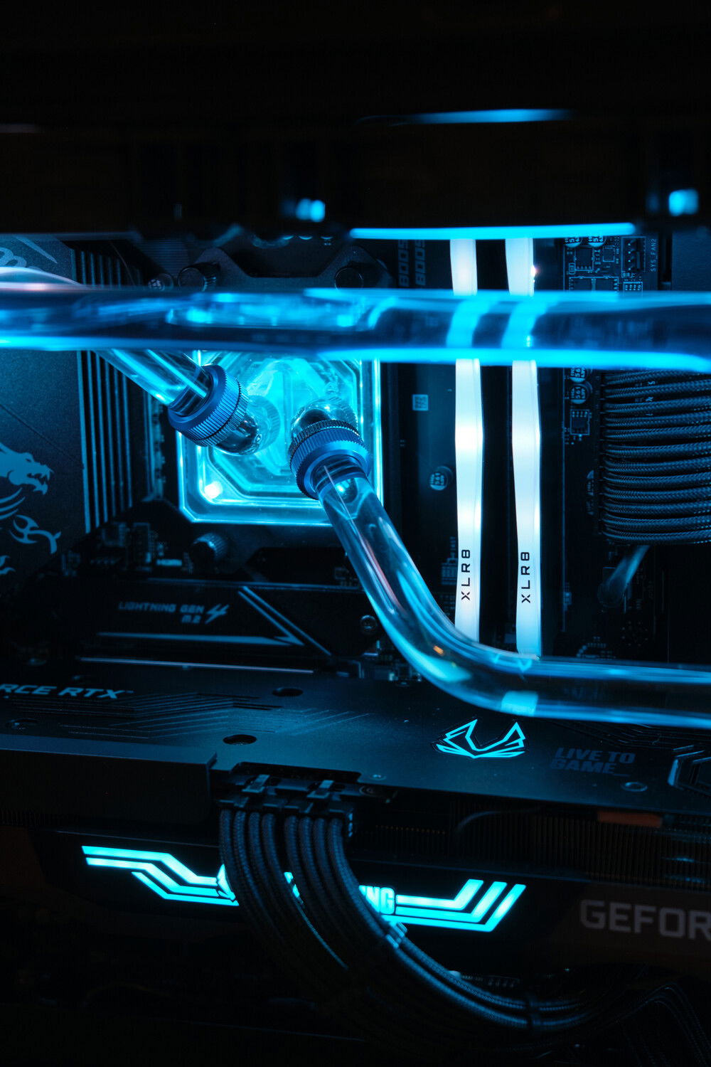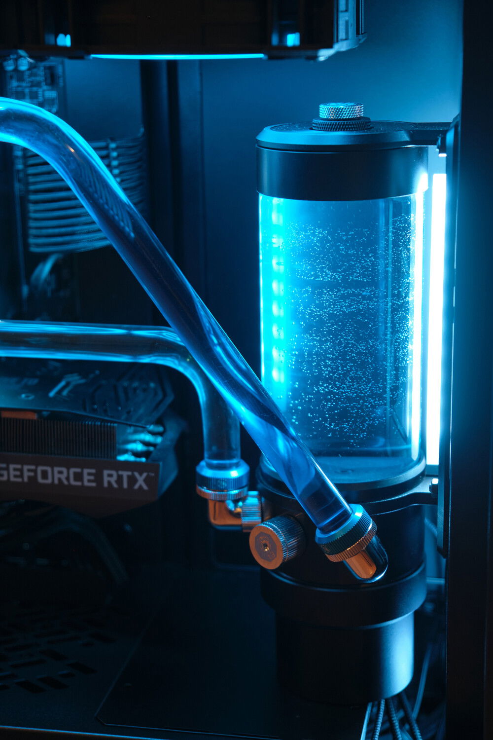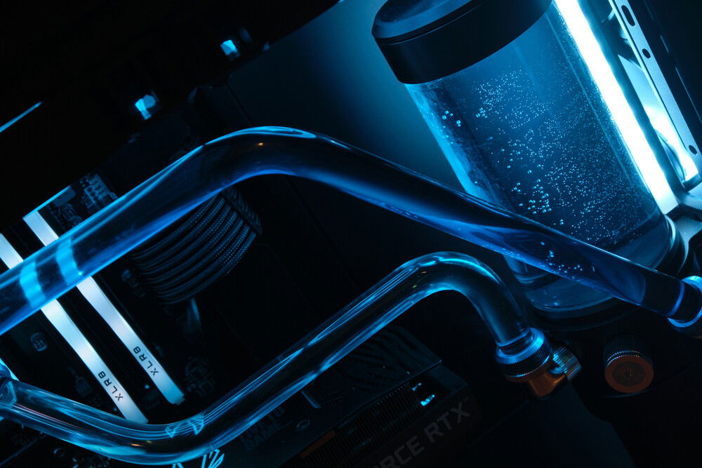 A single blue tube was used to create something of a reverse shadow. The further away from the components the tubes/coolant were, the darker they were.