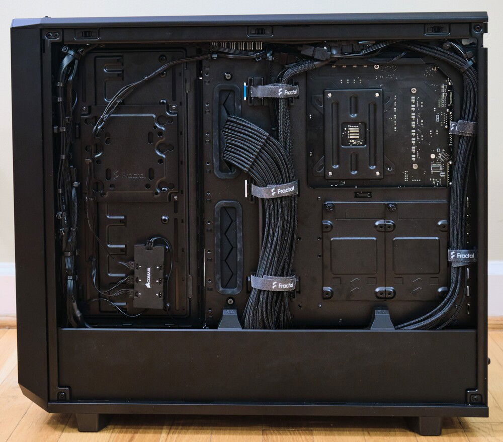 Several other small aluminum covers added as well over the bottom connectors on the motherboard, the connectors on the side of the GPU, and a cable bar over the cables on the side of the motherboard. I like cable bars like this and use them in nearly every build now as they cover up the cables that I want hidden while allowing me to control how I want the visible cables to show through. It's also way easier to replace just the bar if a change in build components requires a change in cutouts. If you do single slab covers over the whole mobo tray instead of modular ones, then you could have to replace the entire thing in a component swap. This cable bar has a small cutout to allow the 24 pin so it rounds over a bit better. It sits exactly flush with the GPU so I added a bit of foam to prevent scratches.