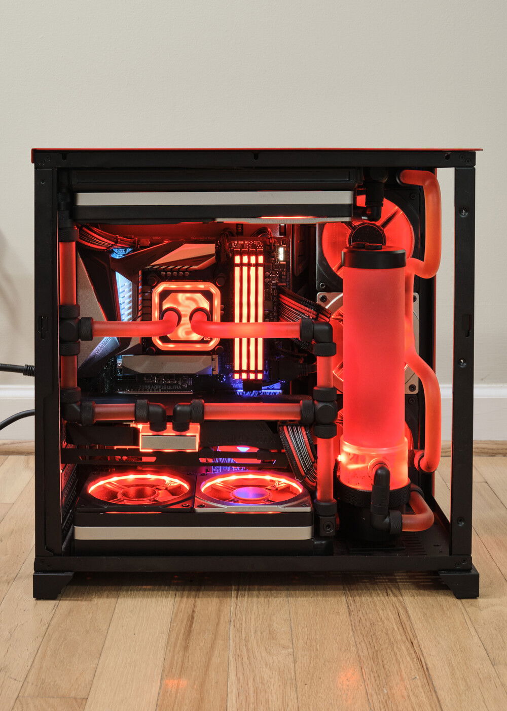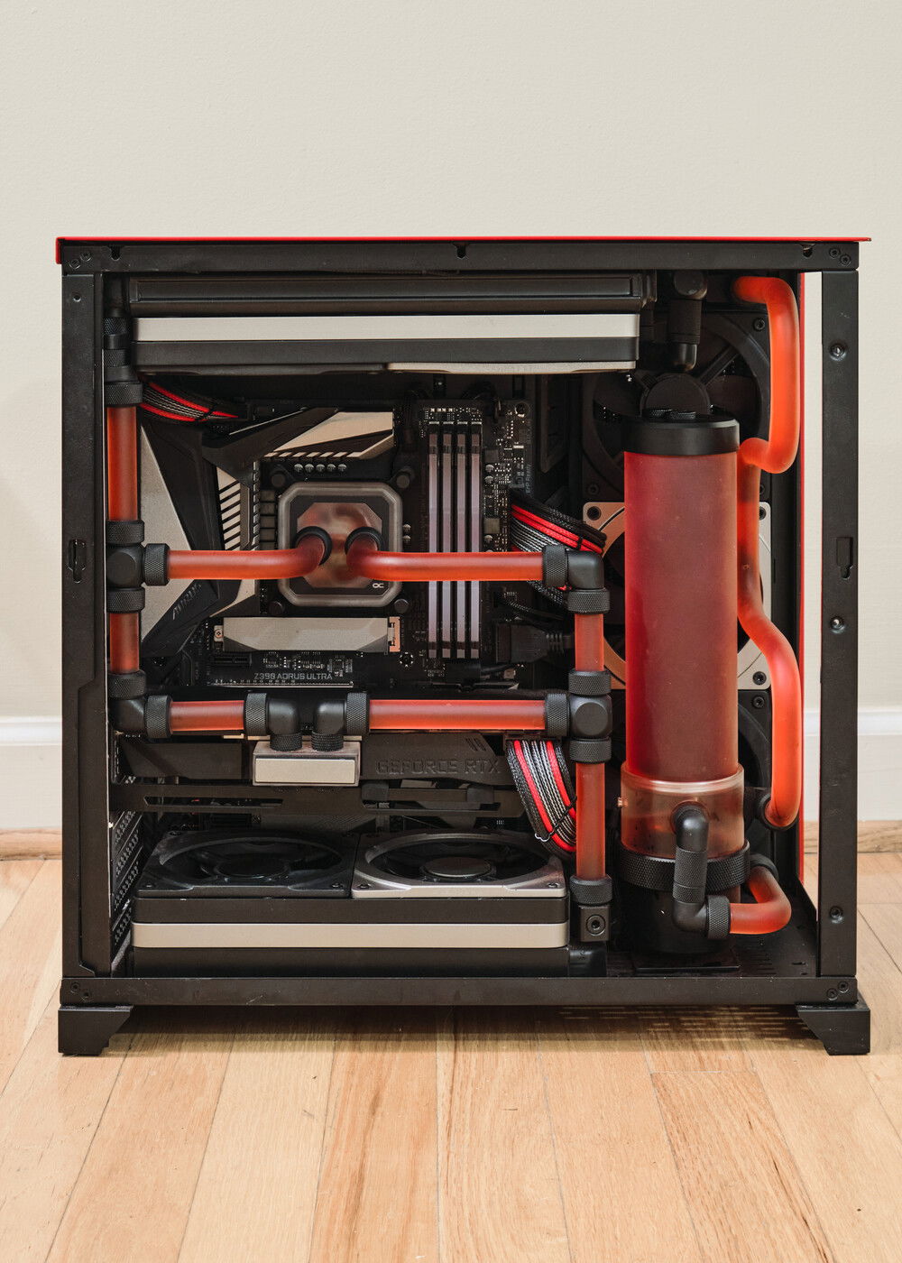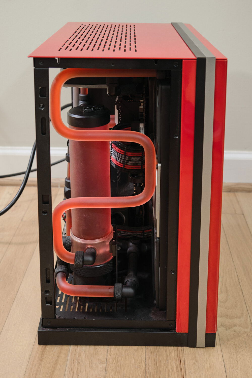 Everything in this build has been custom painted. It's been redone at least 5-6 times over the years as I was perfecting my custom red paint color. This was not a great case to do this with considering the front panel can't be removed. It's definitely taken on a bit of overspray in some areas over time, but hey, that's what side panels are for.