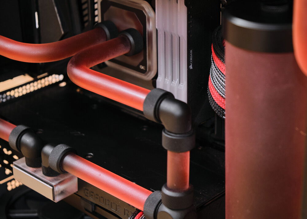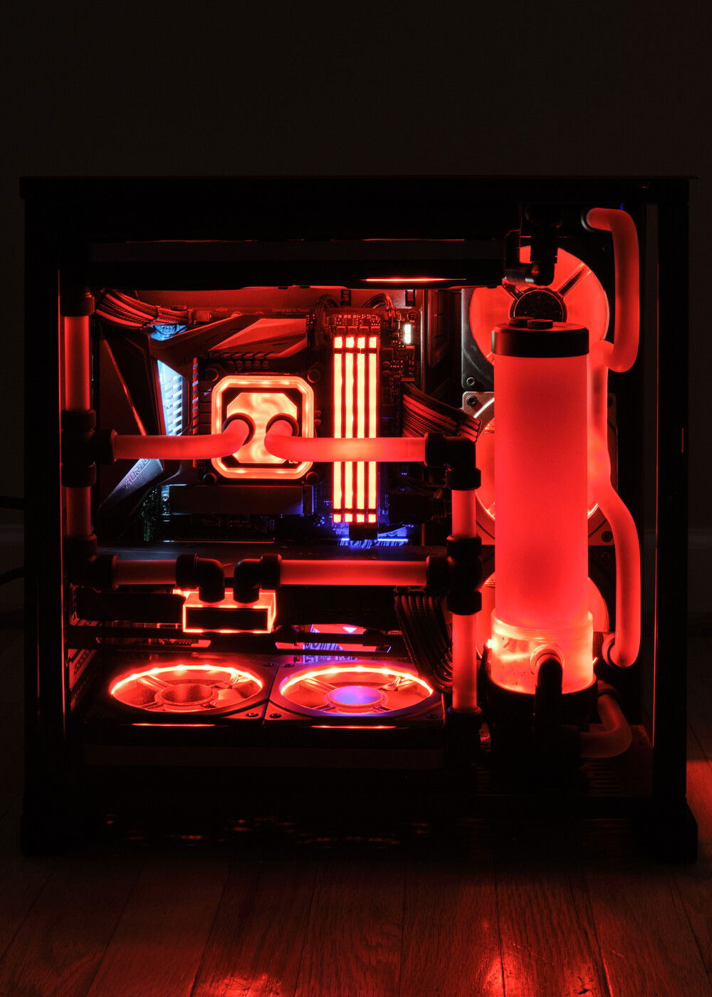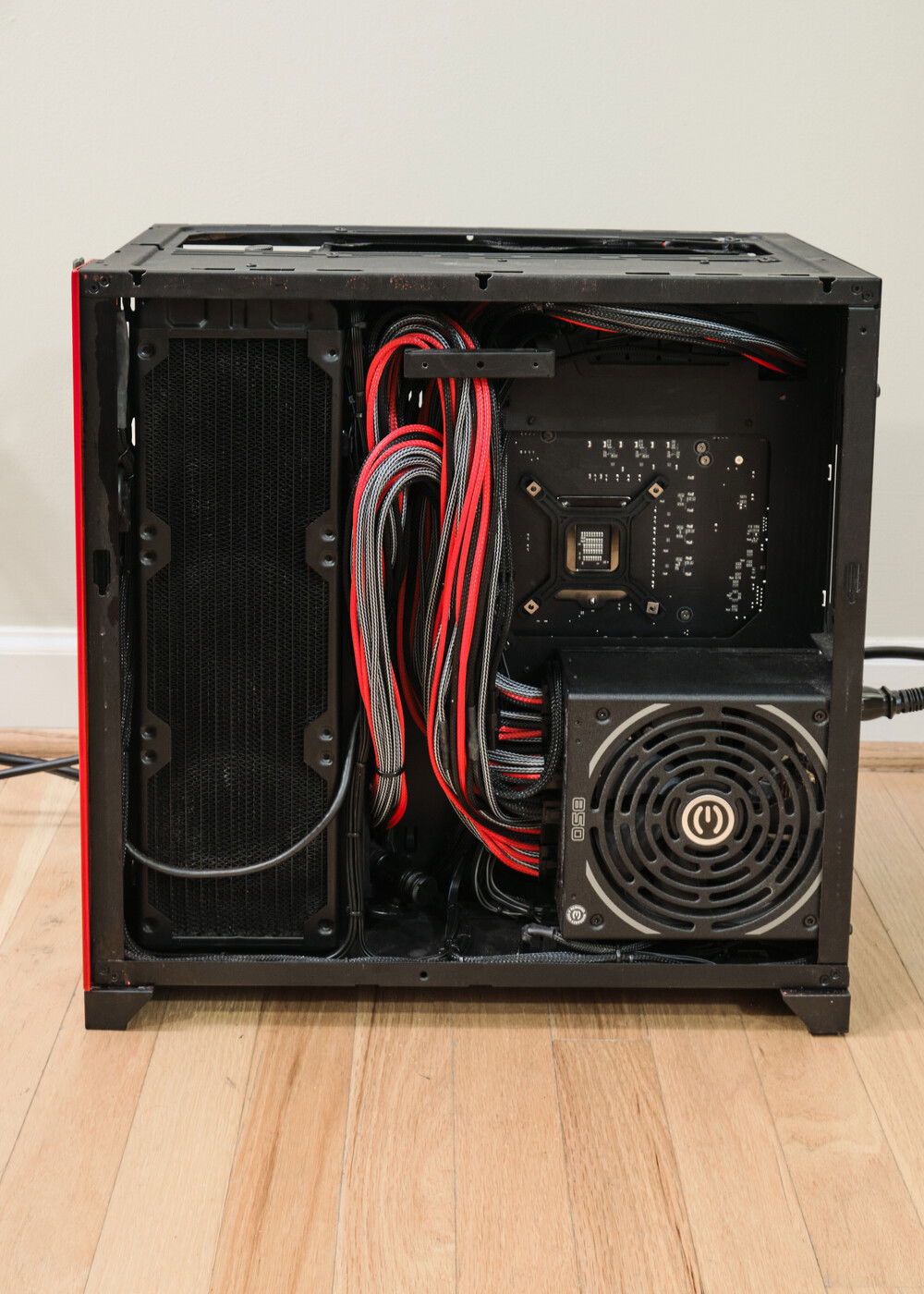 Everything in this build has been custom painted. It's been redone at least 5-6 times over the years as I was perfecting my custom red paint color. This was not a great case to do this with considering the front panel can't be removed. It's definitely taken on a bit of overspray in some areas over time, but hey, that's what side panels are for.