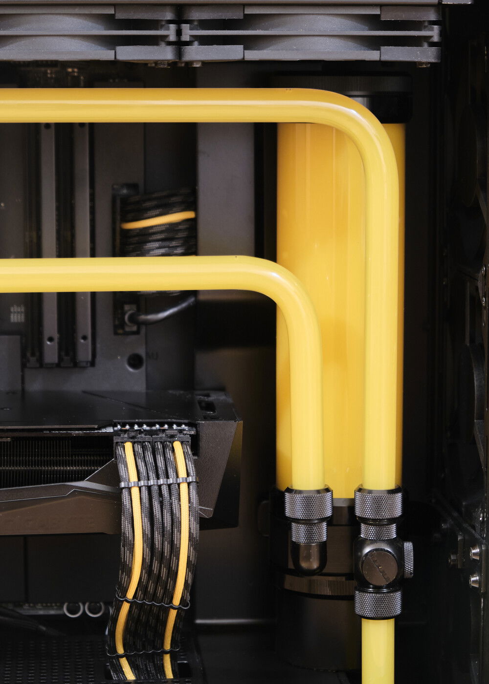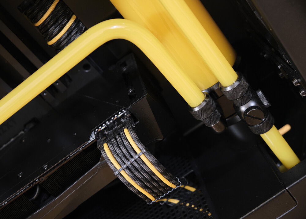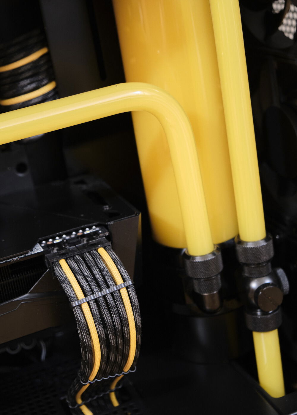 Customer build. Same customer as the black and gold P400 with the modded front and top panels. We didn't want to go full gold or full yellow so we went somewhere in between, chose the paracord color, then matched the coolant to that.