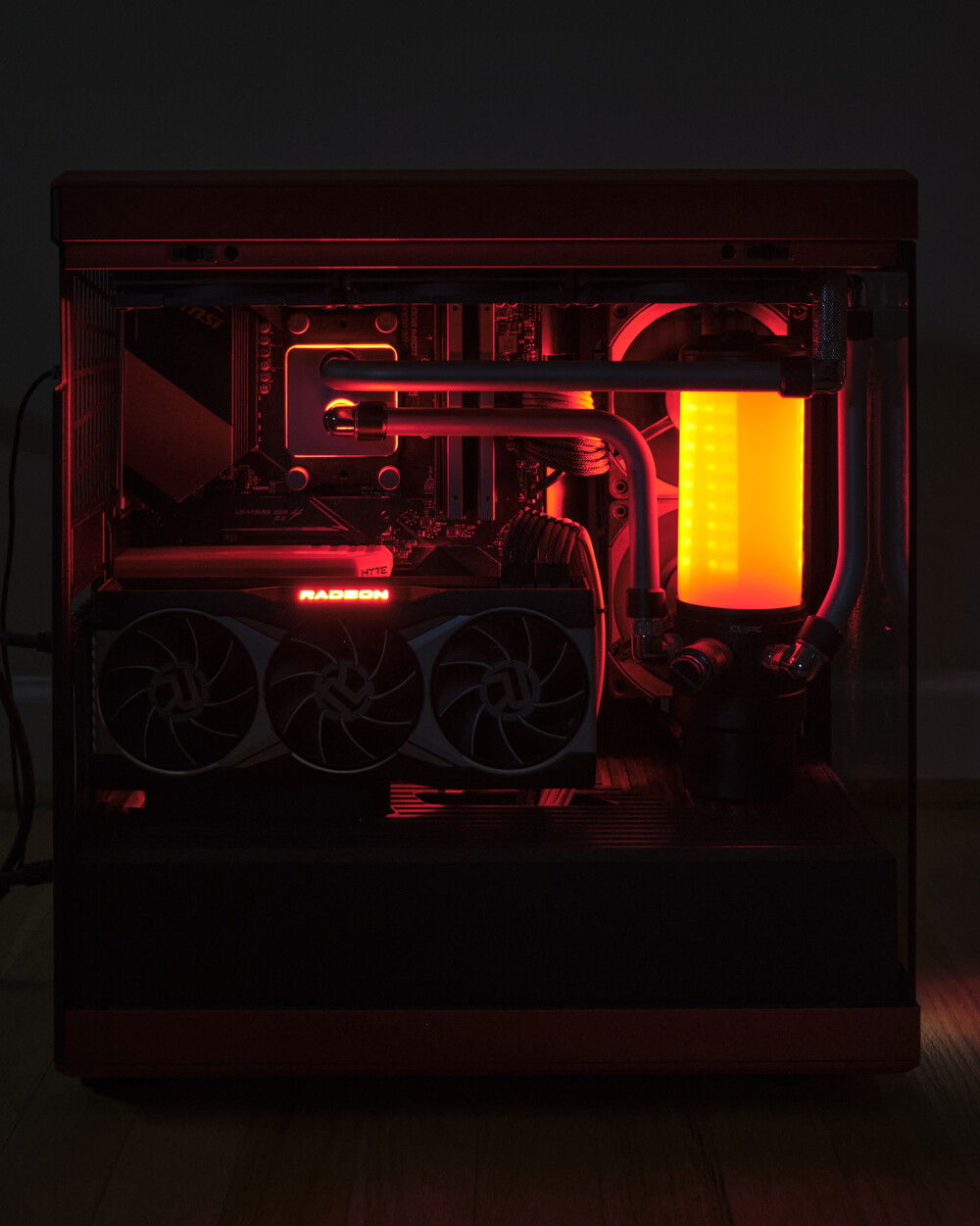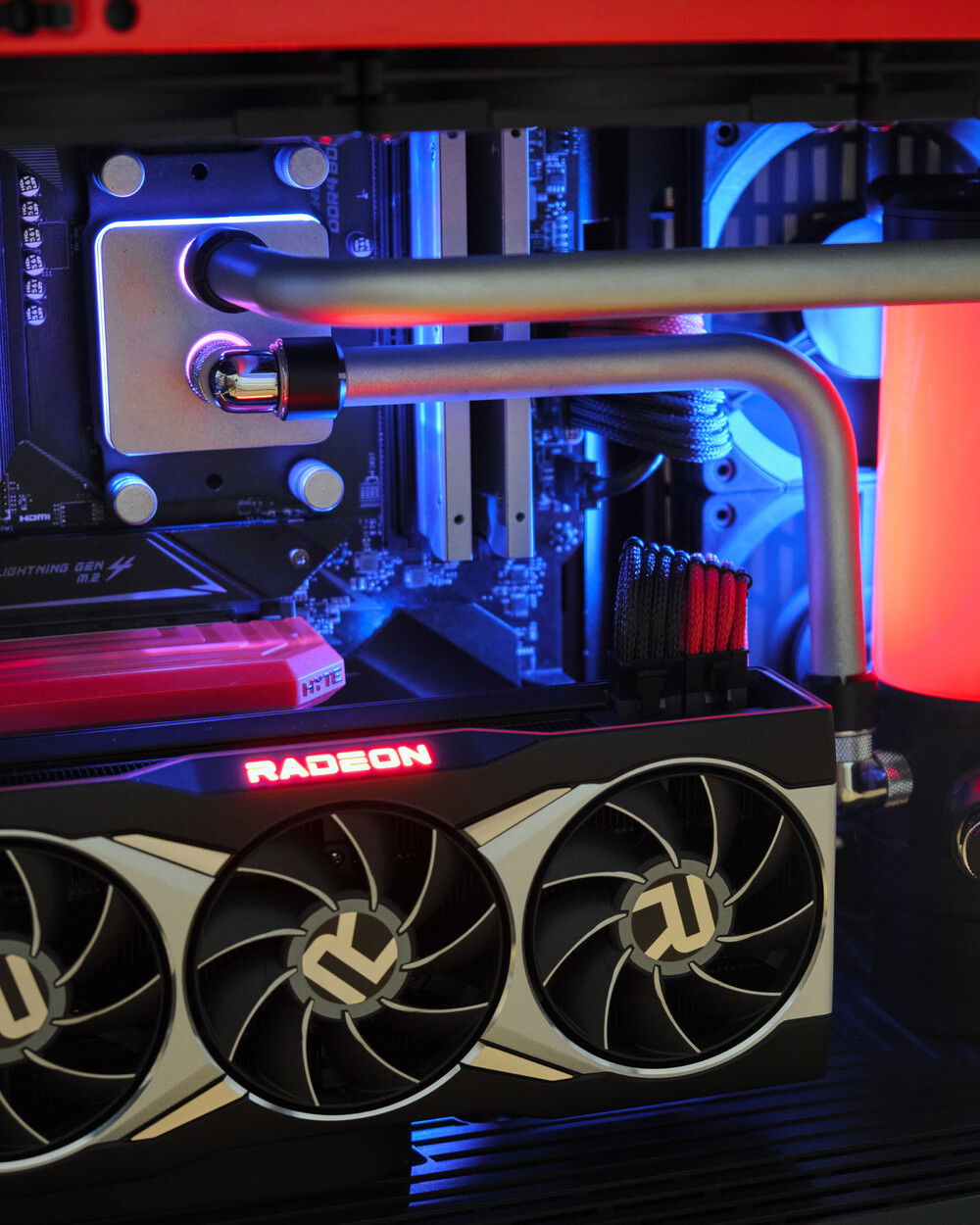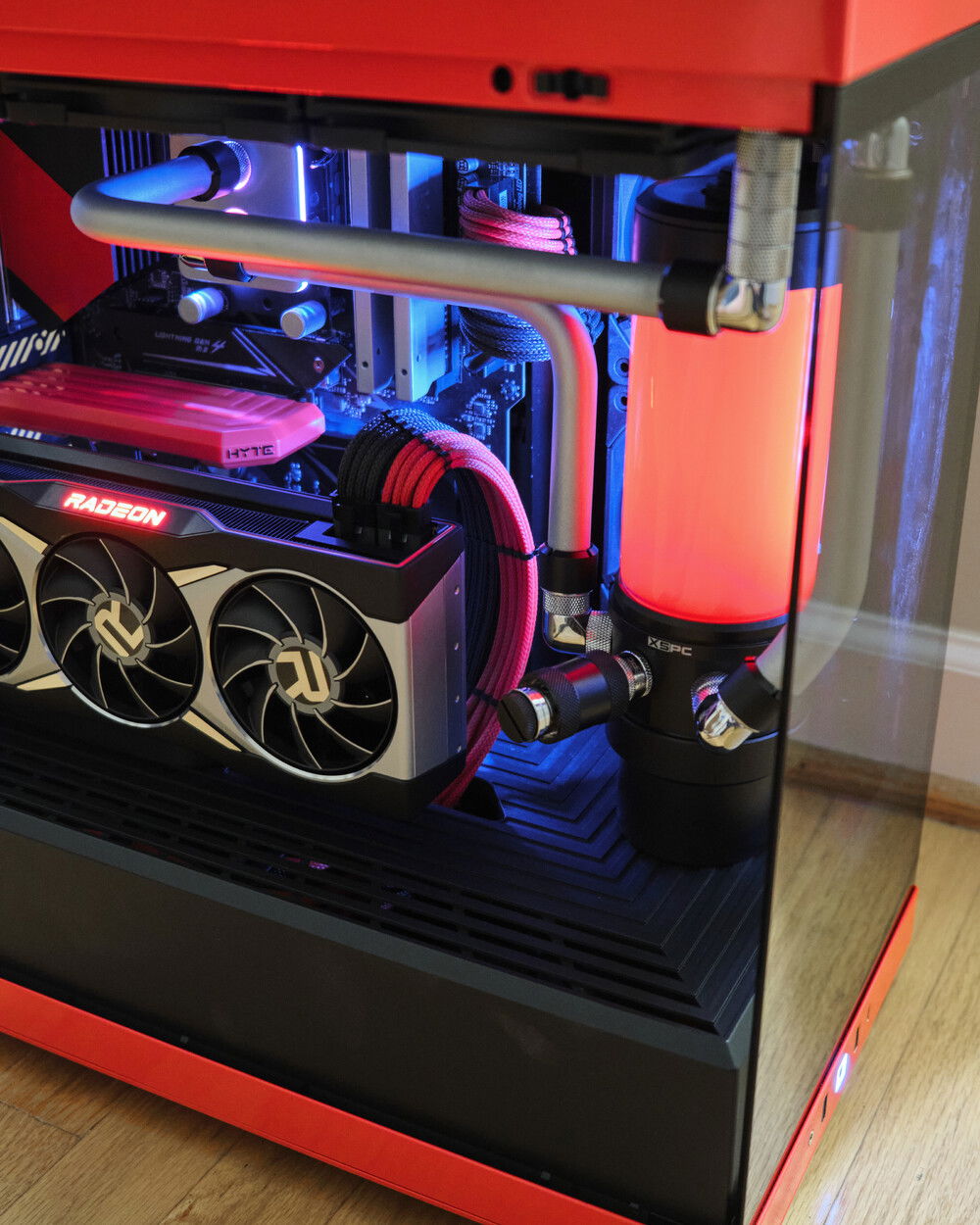 The tubing is painted to match the finish of the reference 6900XT. This is done with silver paint and a frosted clear coat. This is the same finish as EKWB's Satin Titanium fittings. If you ever want that finish but don't want the EK parts, that's all you have to do. You will want to color match to the EK parts specifically as opposed to the 6900XT in this case, but the actual finish is the same.