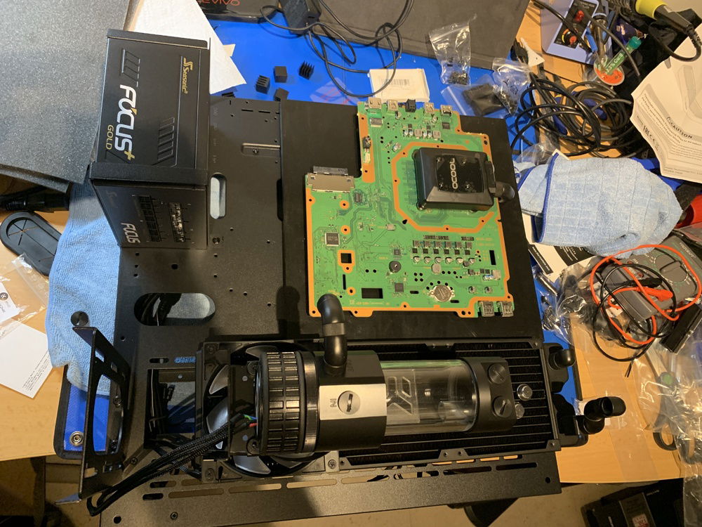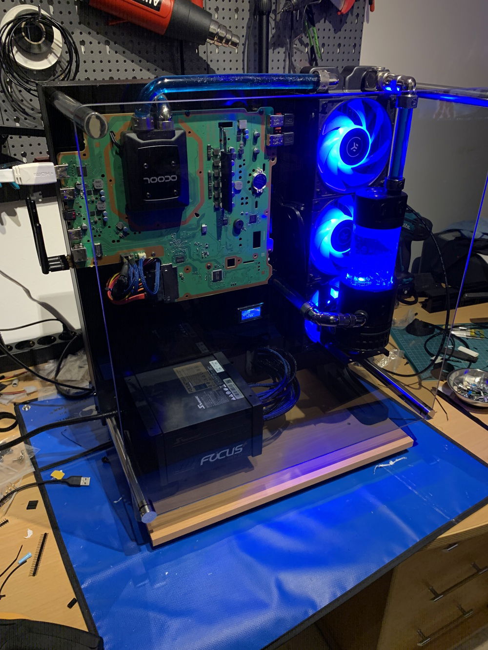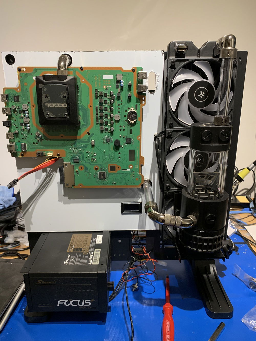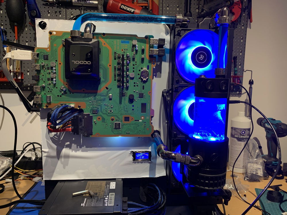 I had the idea for a watercooled PS4 quite while in my mind and so i decided to do this as my 1st real casemod. This goal was to build a cool looking watercooled PS4 Pro with a custom loop. The only functional trade-off was the BluRay drive which did not fit into my case probably.