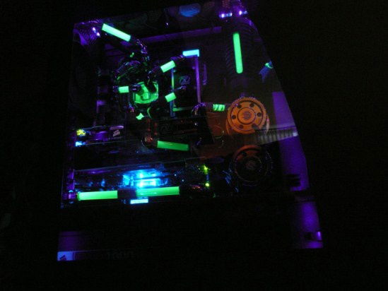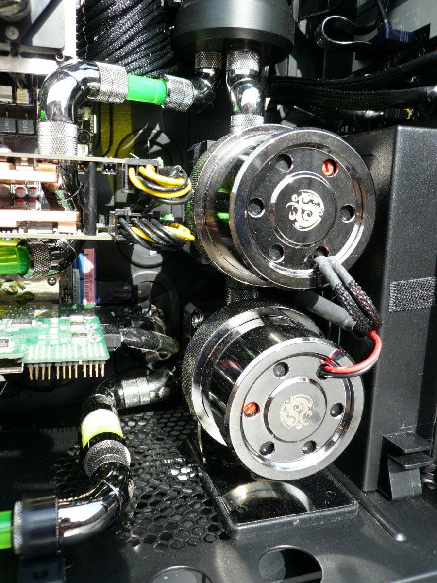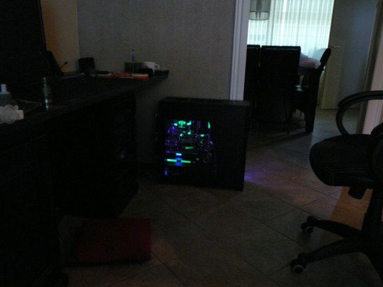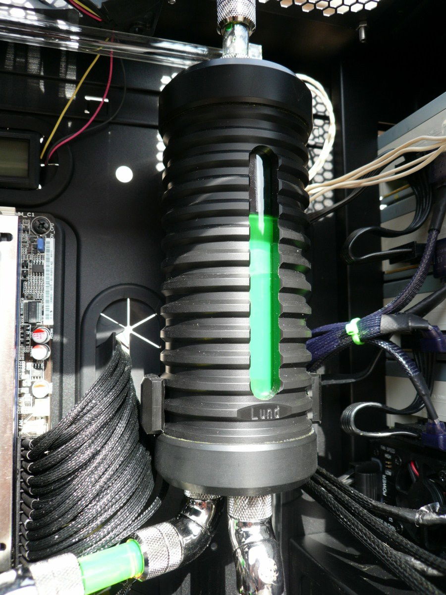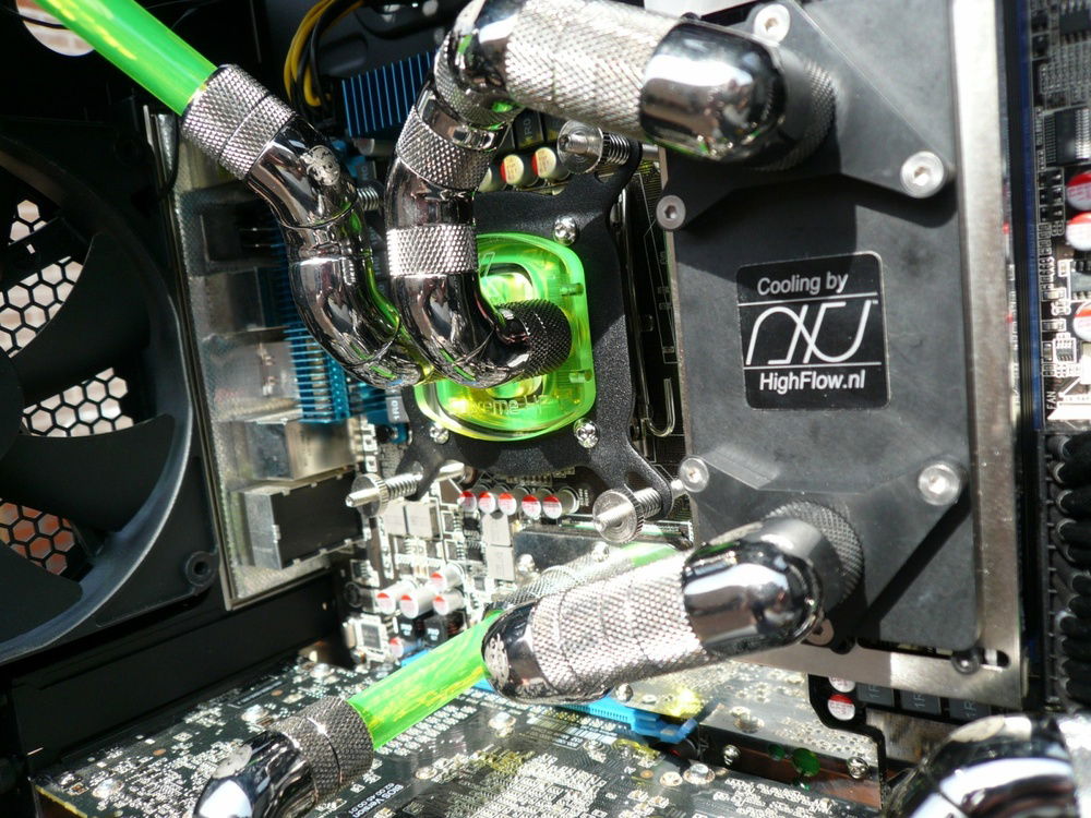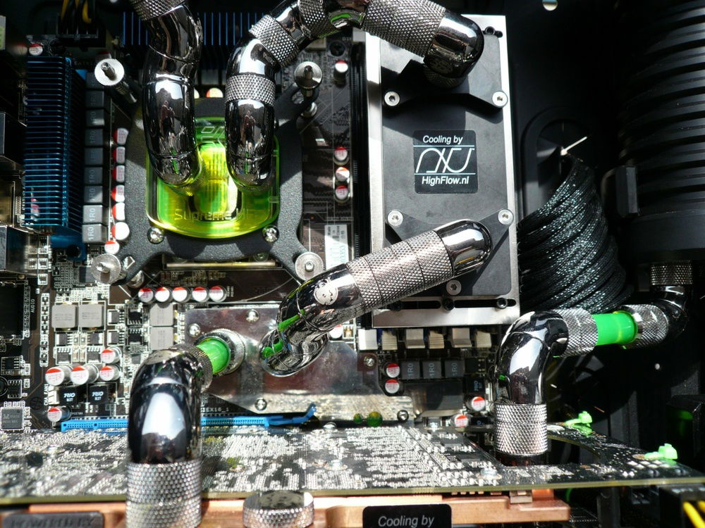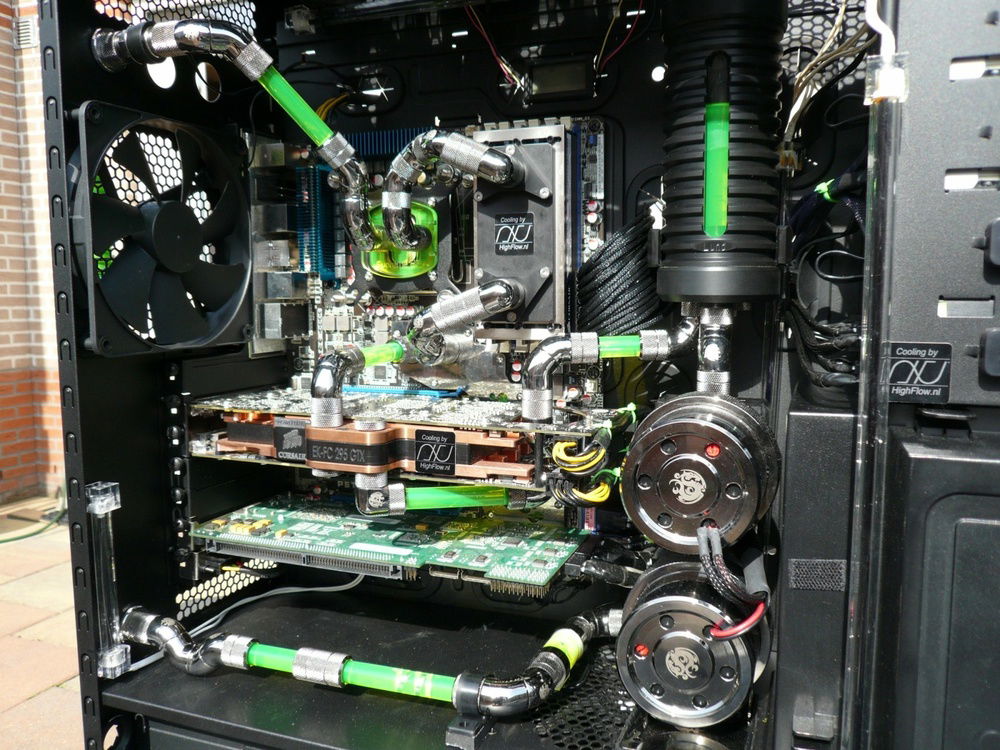 Here the fever really started. Started with this build in February 2010. Loved the space i had in the Dual Stacker, but saw it as a challenge to build it all in one case. My eye fell on the Corsair 800D. That’s when the idea of the Aquacomputer Airplex 1080 popped up. Why not a huge radiator beneath my floor, there where it’s 5-8 degrees cooler then in the living room. And 9 x 120mm Scythe Gentle Typhoon totally silent, far far away from me. Project finished in July 2010