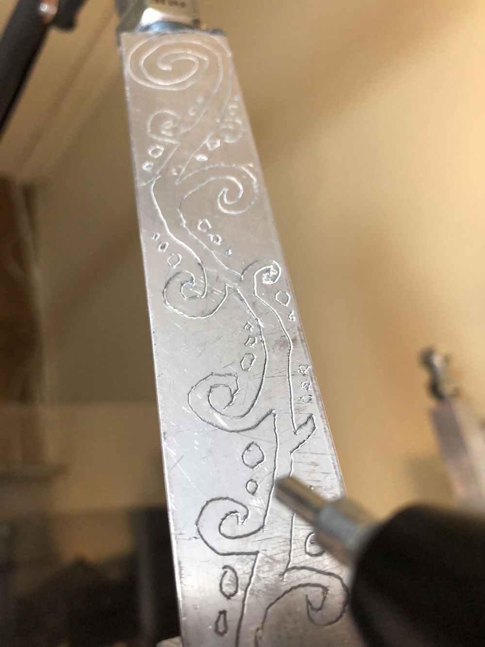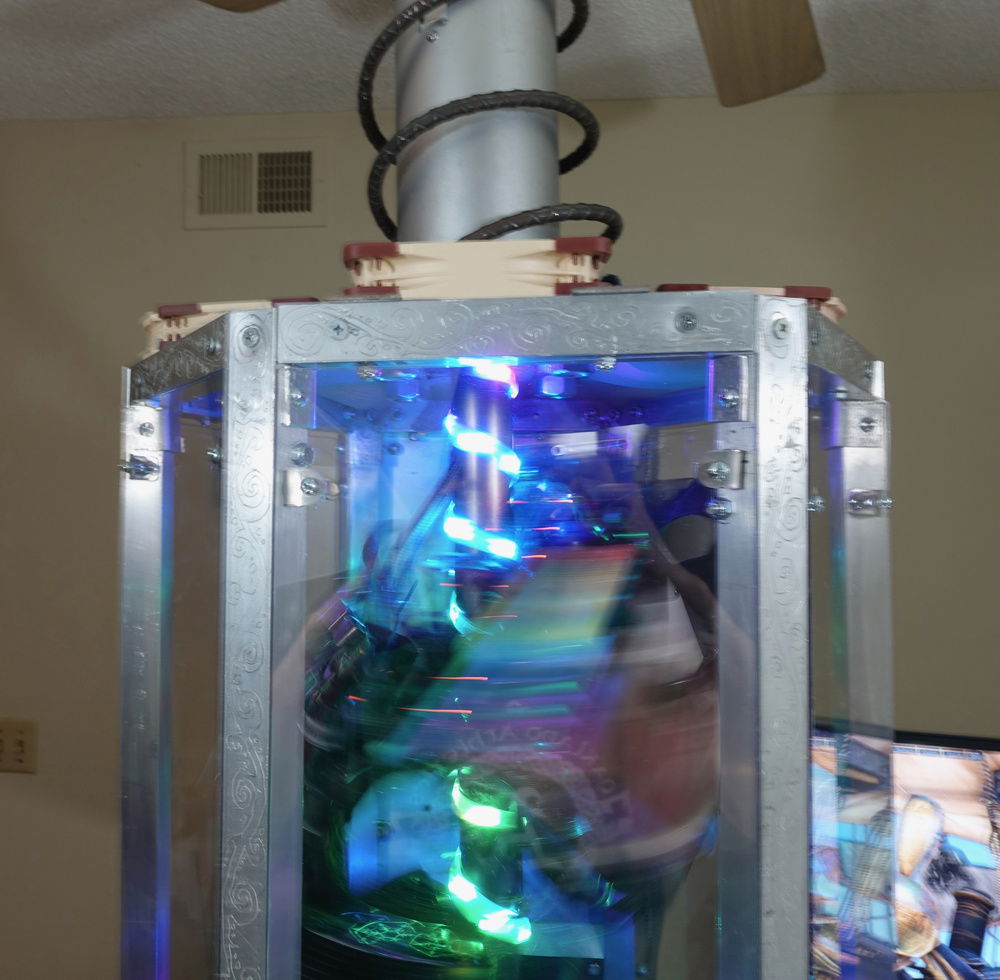 I wrapped the RGB strip around the center pole expecting a barbershop pole type effect. But I also got the cool Aurora Borealis type color flashes off the silver steel back case wall. A really nice surprise. I had a lot of fun bending rebar for support the components and to make the slip ring stove pipe on top look less loony. Engraving the outward facing square pipe Aluminum frame pieces was hard work but turned out better than I thought it would. I don't know why more people don't do it to their cases, since it's not hard to do and has a nice subtle look. It's hard to do artfully, but as long as you don't paint it, most people won't notice how rough it is.