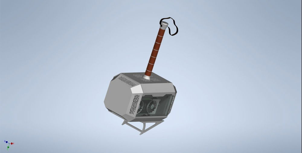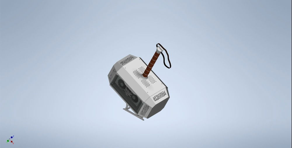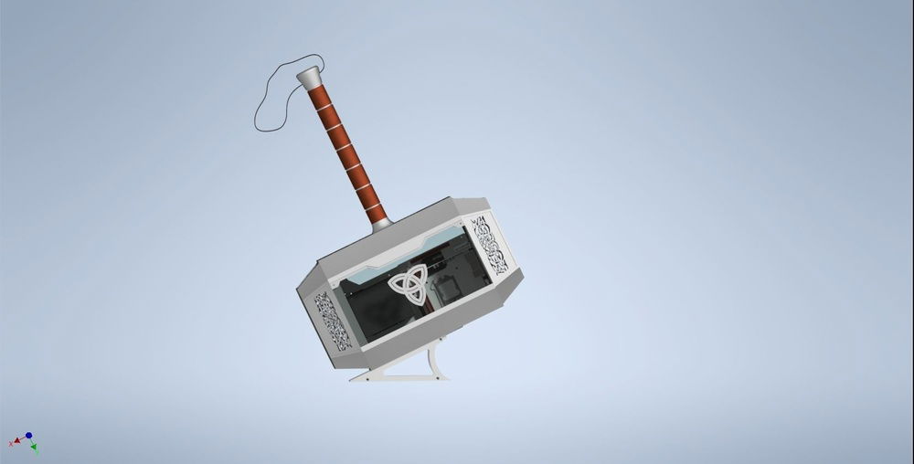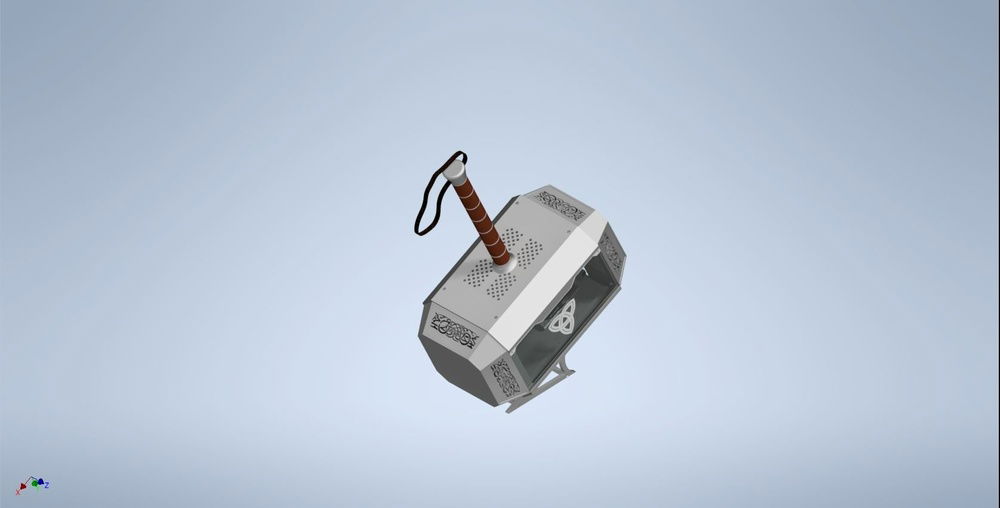 I use Inventor to create 3d sketch. This case uses 3D printed pieces on the outside, along with the aluminum frame inside, the hammer handle will be made of wood and a strap. The most difficult part is the sole for this hammer in an inclined position of 30 degrees, to be like in the comic I will use concrete to pour into a block that looks like stone.