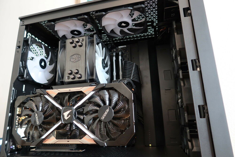 I know the vertical GPU mount is not the best option for cooling because this 1080Ti is known to be a real furnace, and it is really close to the side panel and to the CPU cooler. But it was just so delightful to see it from the fans side.