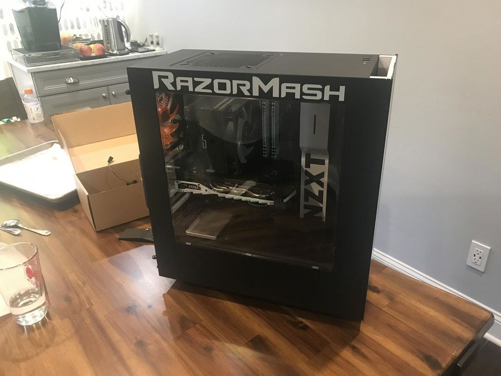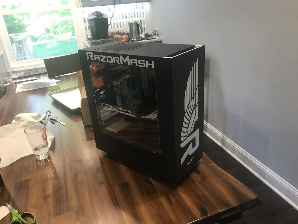 The theme came from his desire to advertise his twitch channel (Razormash) "like Ninja." Hence the side panel and front panel.
