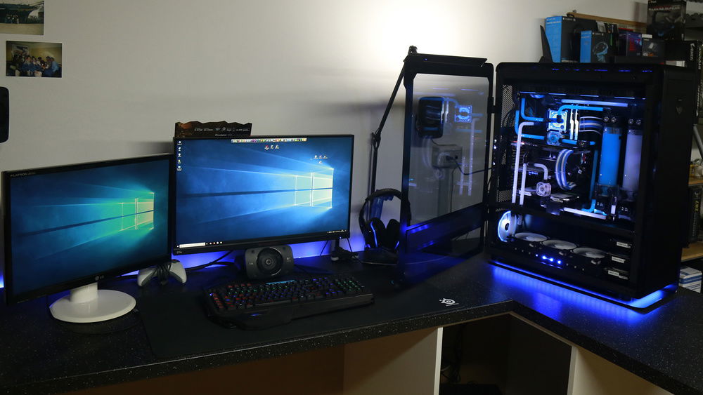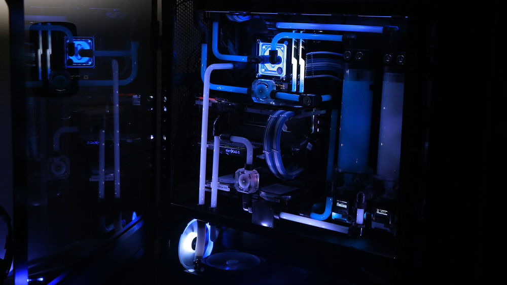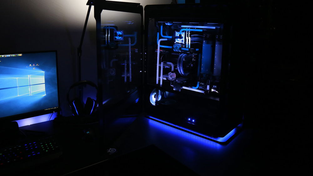 I used a [b]double [/b][b]custom loop[/b], one (blu) for [b]cpu only[/b], and one (white) for [b]mainboard/vga combo[/b], with top EK components, like Radiator Pe, Velocity D-RGB Waterblock, EK-FC1080 GTX for vga and hard tube. I used two D5 Next RGB (from aquacomputer) too. I had, of course, an eye on the RGB part :)
