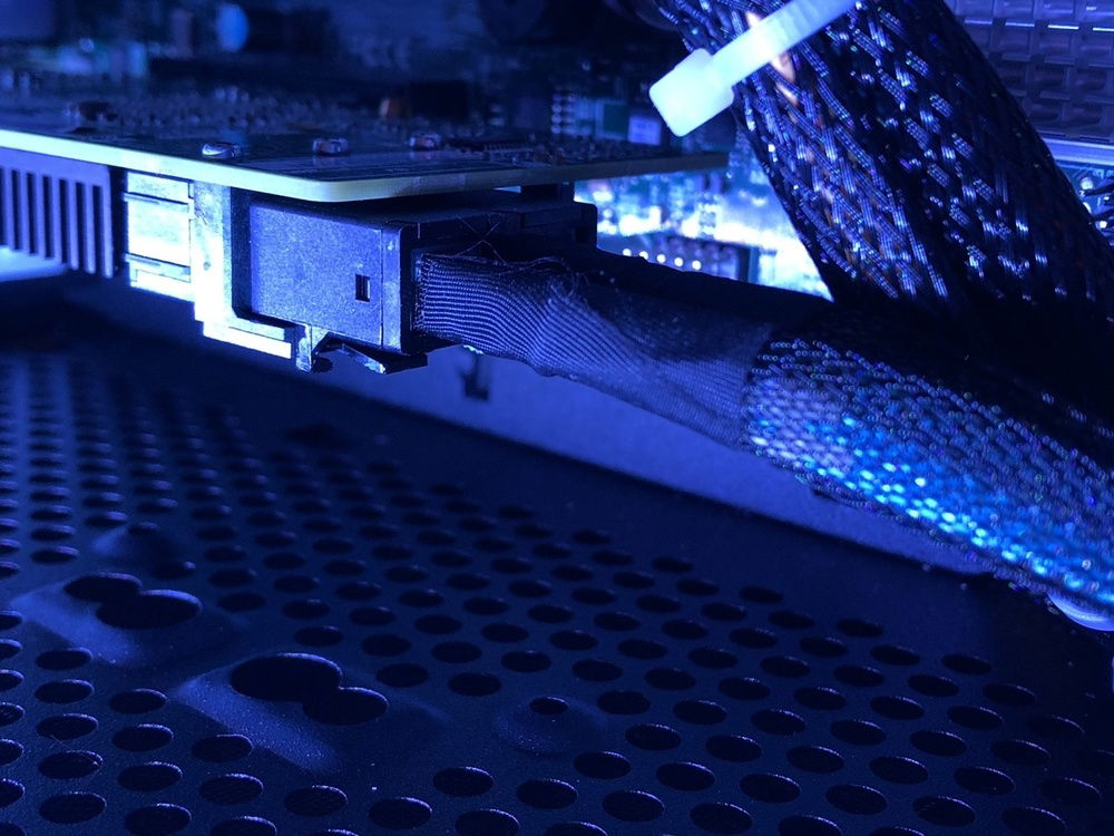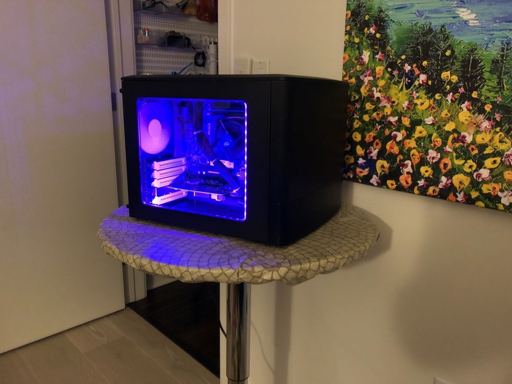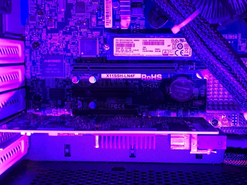 Since the GPU is only used for (en|de|trans)coding video, a vertical mount is easy! No video output plugged into the card, so unconventional mounting positions are fine