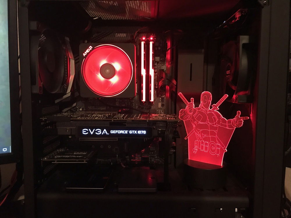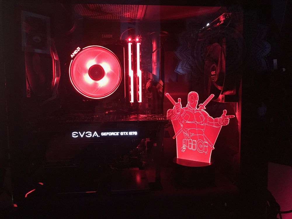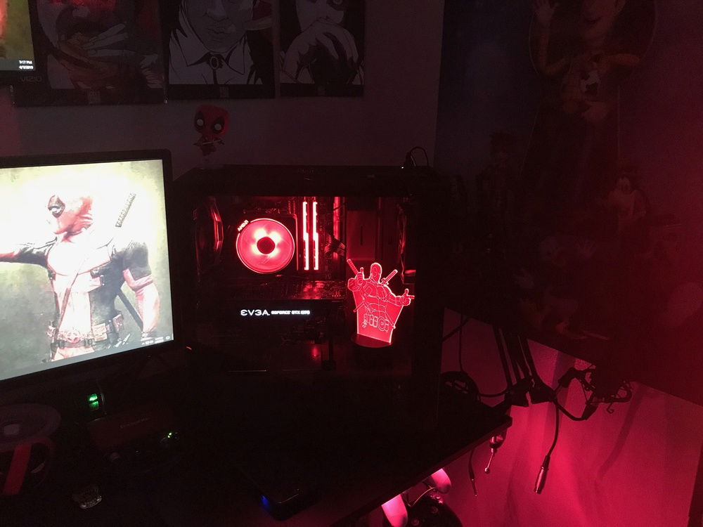 I have loved Deadpool ever since reading the comics as a teenager. His humor always resonated with me and so I wanted to pay homage to him with this Deadpool inspired build. I went so far as putting a Deadpool 3D Lamp inside of the case. This rig is also connected to a 42 inch Vizio TV as well but don't have a way to add it.
