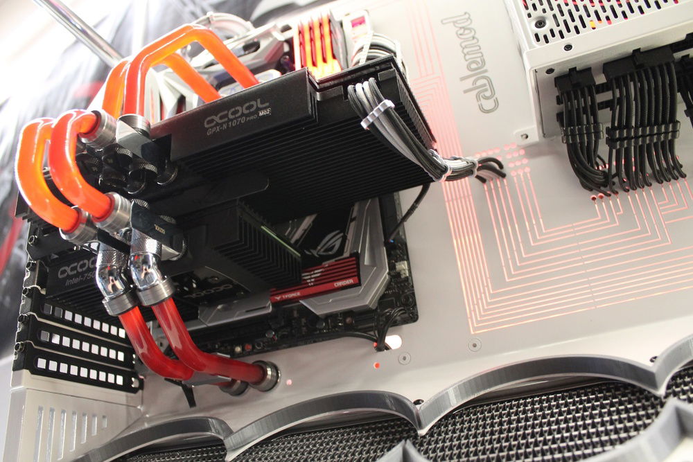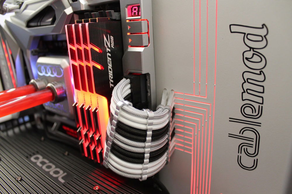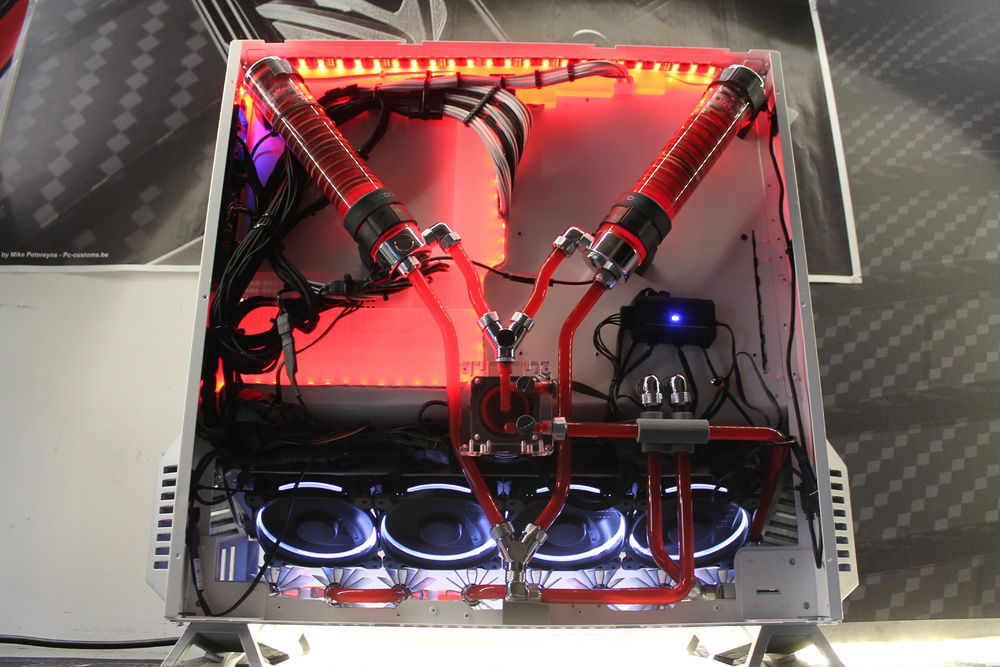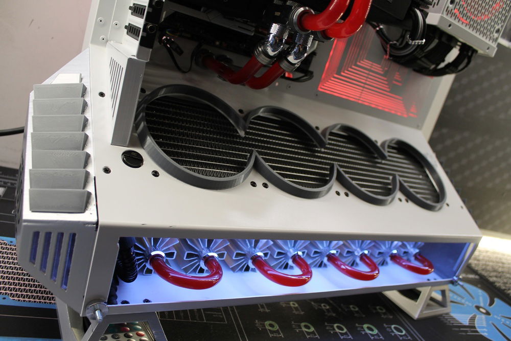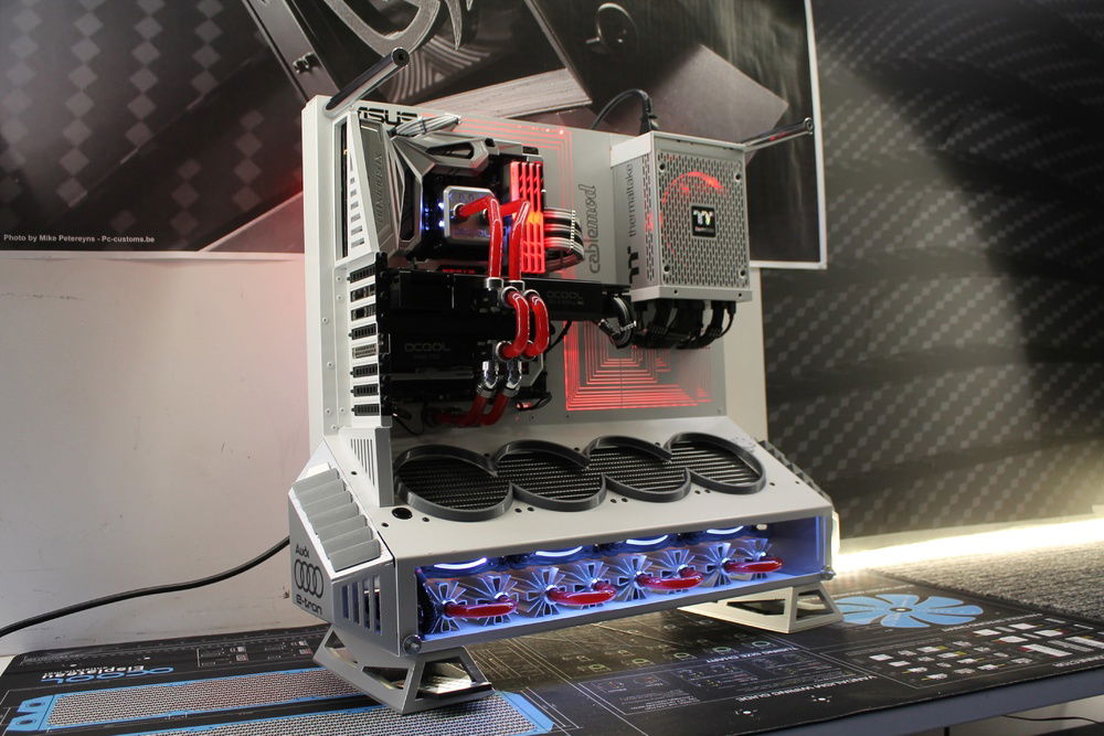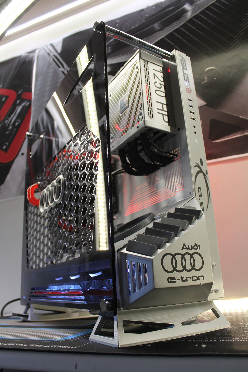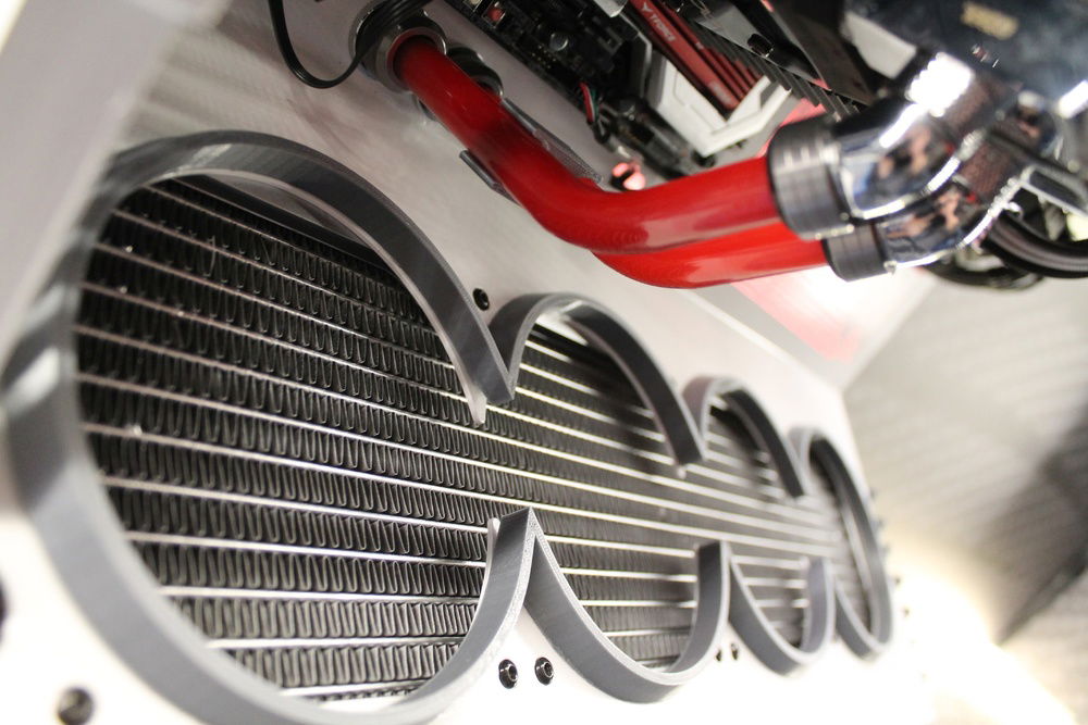 Because I love Audi and drive one myself, i thought it would be cool to have a Audi themed case mod for daily use... so I did. Because this project was sponsored by Alphacool and they realy liked it they wanted it to show it in there suite on CES 2018 where it was welcomed by all the tech reviewers and enthusiasts. I still hade half of a TT coreP5 chassis somewhere so i thought to use that as base and designed a custom laser cut plate to use in the front. In the plate i designed holes and lines where the power cables would come out and the lines were like electrical circuit board lines lol. In the bottom i used several heat sinks/radiators to resemble the intercooler of the Audi, I also designed the 4 rings like the logo and used that to put the fans and 480mm radiator under. further i made some 3D printed feet's and details as some self made vinyl stickers. The front window was laser cut out of 5mm acrylic and resembled the front grill of the car. The mod was doped with the name E-tron as it's doesn't run on gasoline haha ;-) Hope you like it guys ..... cheers