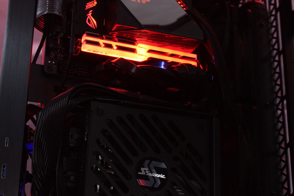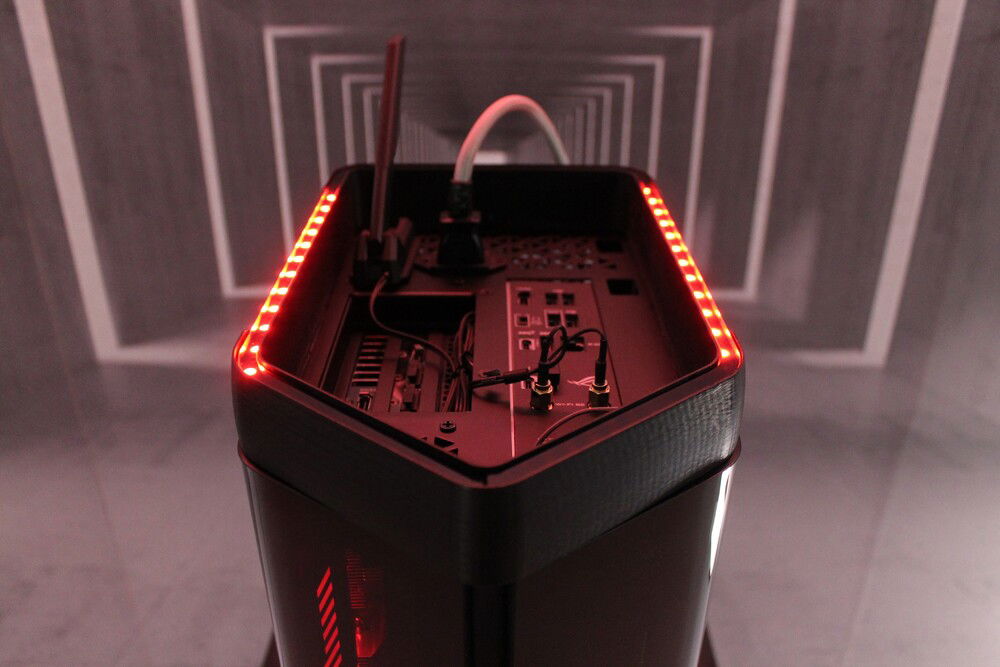 Flipped the internal structure of the case (downside UP) for better airflow and accessibility to the IO. 3D printed a custom top cover with integrated ARGB led strip for more overall symmetry of the lightning effect. No crazy water-cooling but just all ROG components in there purest form. I swapped the pci-ex raiser cable that came with the case for a cablemod pci-ex 4.0 raiser cable.
