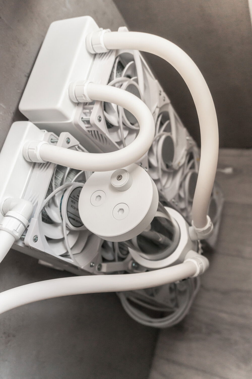 The components for the loop are partly new from China, partly used from local marketplace in Belarus. Fittings, adapters from Barrow, Bykski CR-RD480RC-TK60-V2 and Bykski CR-RD480RC-TN-V2 radiators (repainted), EKWB EK-XRES 140 Revo D5 PWM pump (repainted), IceMan Cooler ICE-CT3 CPU waterblock (repainted), Bykski N-RTX3090H-X-V2 GPU waterblock (repainted). I spent a long time choosing QDC fittings, because Barrow or Bykski are cutting the flow a lot and can leak a little. In the end, I found industrial hydraulic fittings FIRG Flat Face LSQ-FF-02PF-G1/4, which look 1 in 1 like expensive Koolance. They don't cut the flow and costs $35 for two pieces, very good (I also repainted them white). To attach the radiators to the table, I used 3D printed mount. Ingenious and simple.