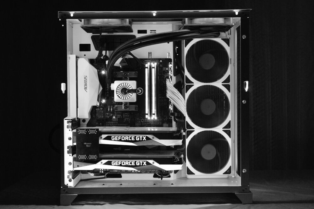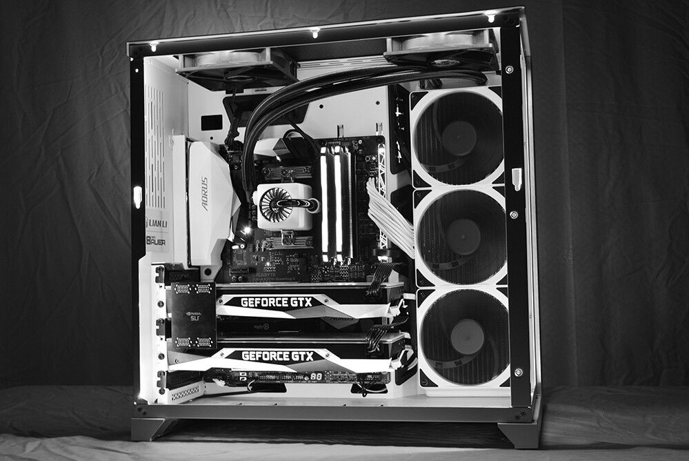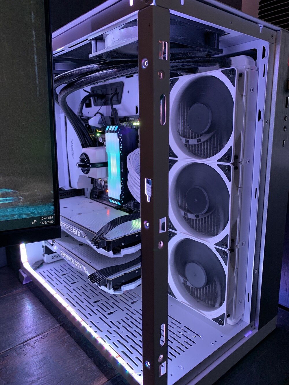 Whiteout presets a classic black and white build with a twist. Custom painted 1080 ti's are the main center peace, catching the viewers first glance. With the rest of the build subtilty complementing them. Whiteout holds holds a ryzen 7 1800x, placed in a Gigabyte gaming K5 motherboard within the Lian Li PC-o11 Dynamic in white. Currently a v2 is in progress of being built, with a ryzen 7 3800xt, RTX 3080 and full hard line water cooling. The V2 will display some custom case mods never seen before within the community.