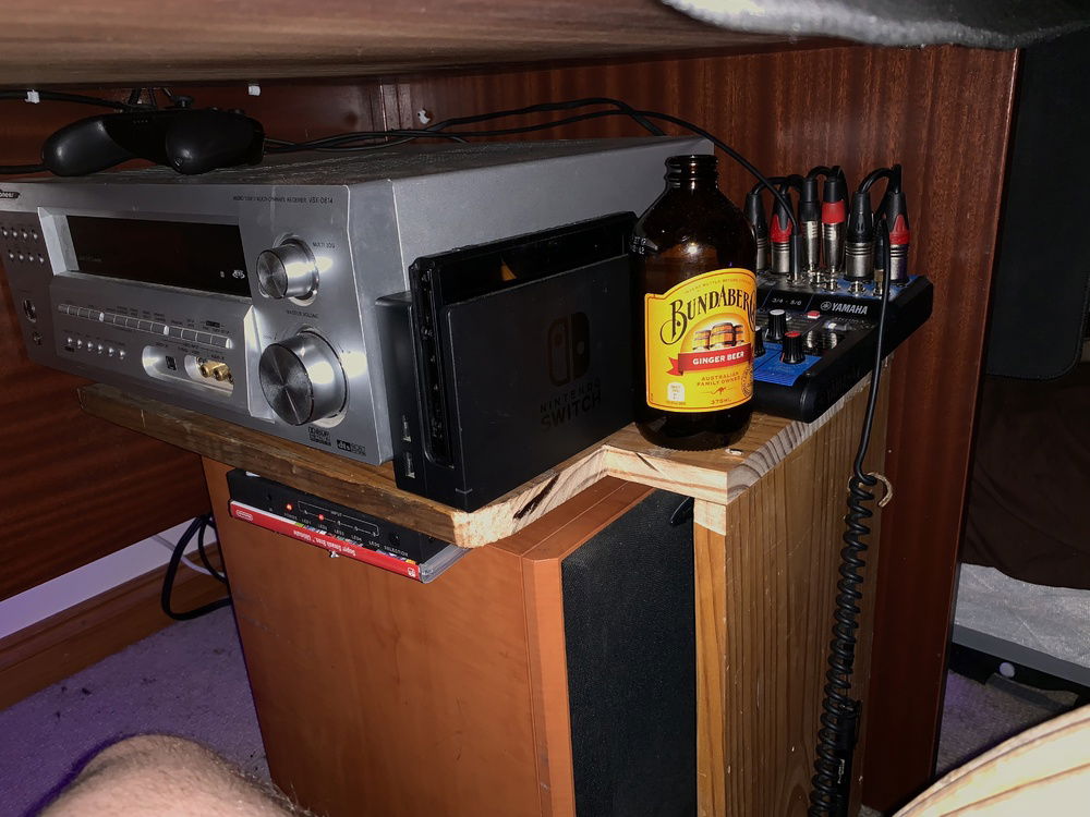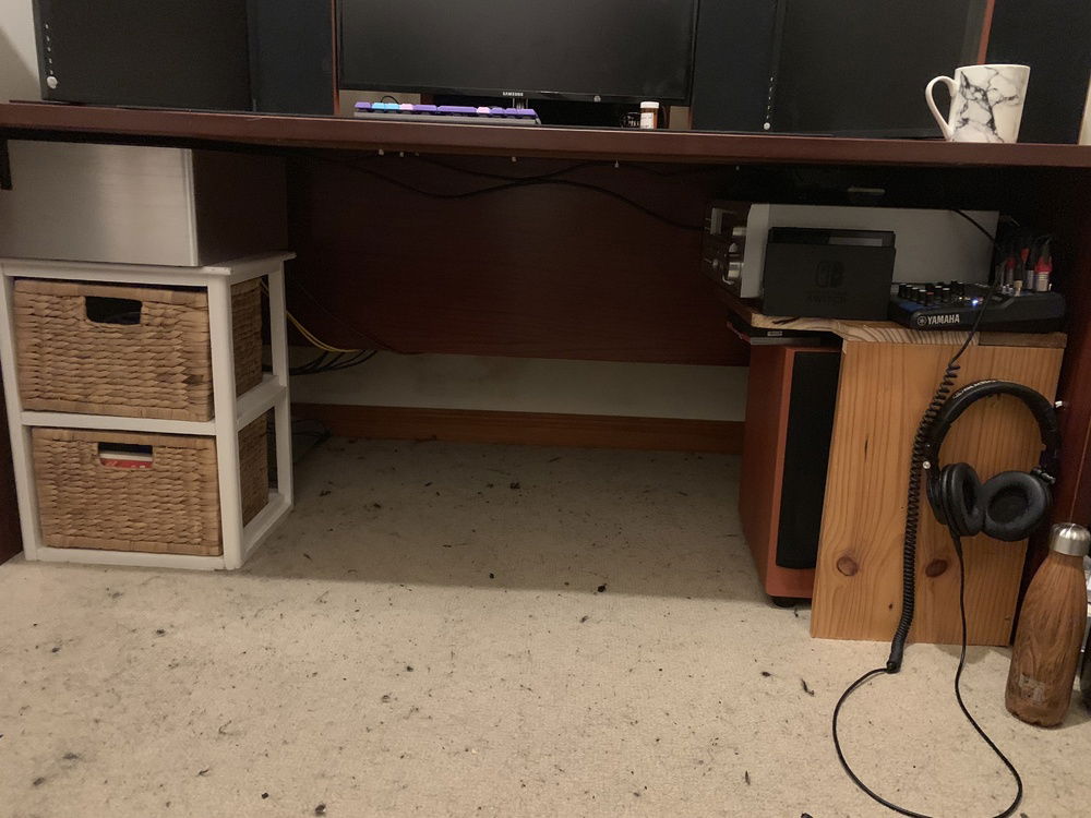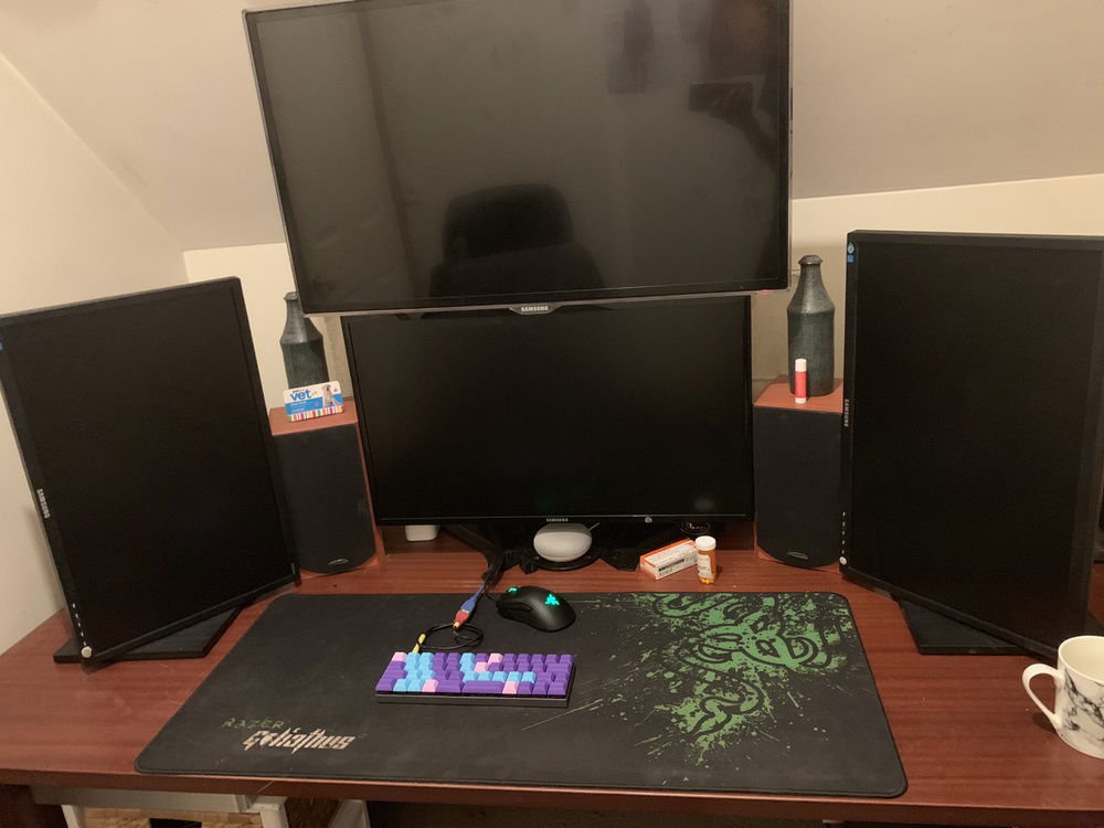 Monitors are Samsungs 22 Bussiness monitors, I used this setup to play some racing games. The big TV screen above is a 32 oled i used for nintendo switch and cable tv. With surround sound it was a sweet setup