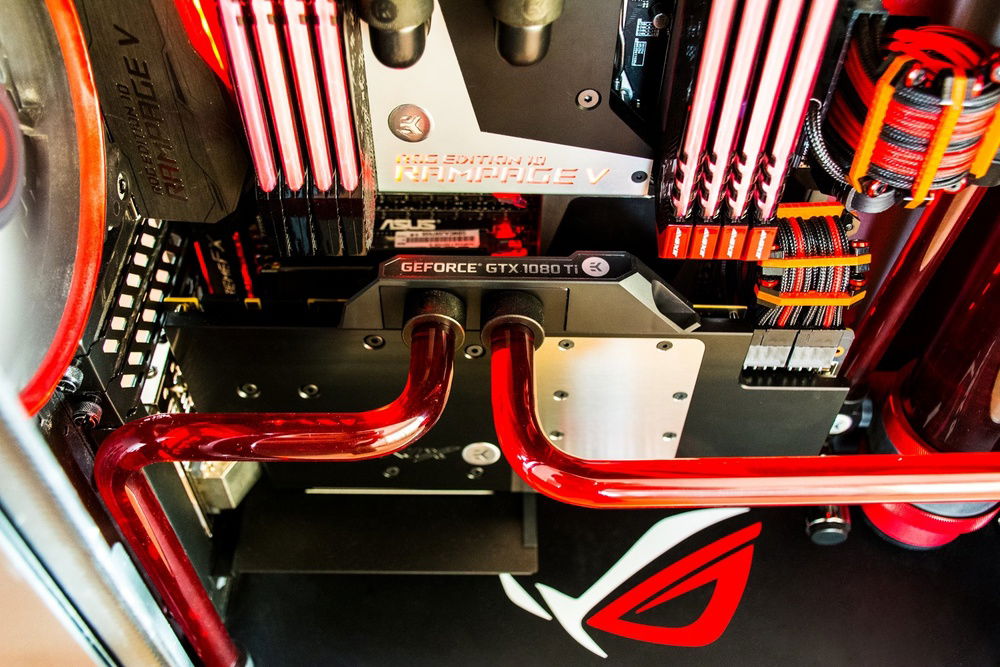 Specs: Intel® Core™ i7-6950X Processor Extreme Edition ASUS ROG Rampage V Edition 10 Avexir ROG Red Tesla 2666MHz 64GB (8 x 8GB) NVIDIA GeForce GTX 1080 Ti ROG Strix Corsair AX1500i PSU Corsair 900D Custom watercooling parts by EK Water Blocks