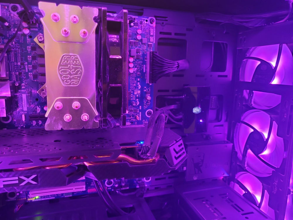 Some back story on this build. This build first started as a Lenovo ThinkCentre that had a i5 3570. I bought a GTX 1050, Better power supply (An adapter because of the proprietary port),and a i7 3770 for an actually really good budget build for around only $335. I payed $100 for the Thinkcentre from a school selling their computers, $100 For the GTX 1050 Refurbished, $35 for a EVGA 500W BR Brand New, And a Used i7 3770 for $100 from a friend that was selling his old parts. It performed well but I was actually a little bottle necked by the 1050 because of the low VRAM. So I bought a RX 580 for $160 And thought I was done, but man was I wrong. Sadly, the motherboard died. I Still have no clue why but it did. I checked the parts and they all seemed to be fine but found out later that the ram died so I decided to buy a Intel DH77KC motherboard for $60, A Cooler Master MasterBox Pro 5 RGB for $60, A Cooler Master Hyper 212 EVO $25, 8gb of Samsung ram for $60, and an SSD from Kingston for $65. I put it all together and it worked great. Overall the i7 still performs very well and I can play any games at 1080p 60FPS. After finding out that it all worked out I bought An LED strip and the RGB Controller from Cooler Master and Purpled it up. So far I am very Proud of this build for it being my first build. Overall It turned out to be around $600 total. I'm planning on Going full AMD with this build in the future with Ryzen 7 and possibly Vega. I would love to hear your guy's ideas on what to do next!