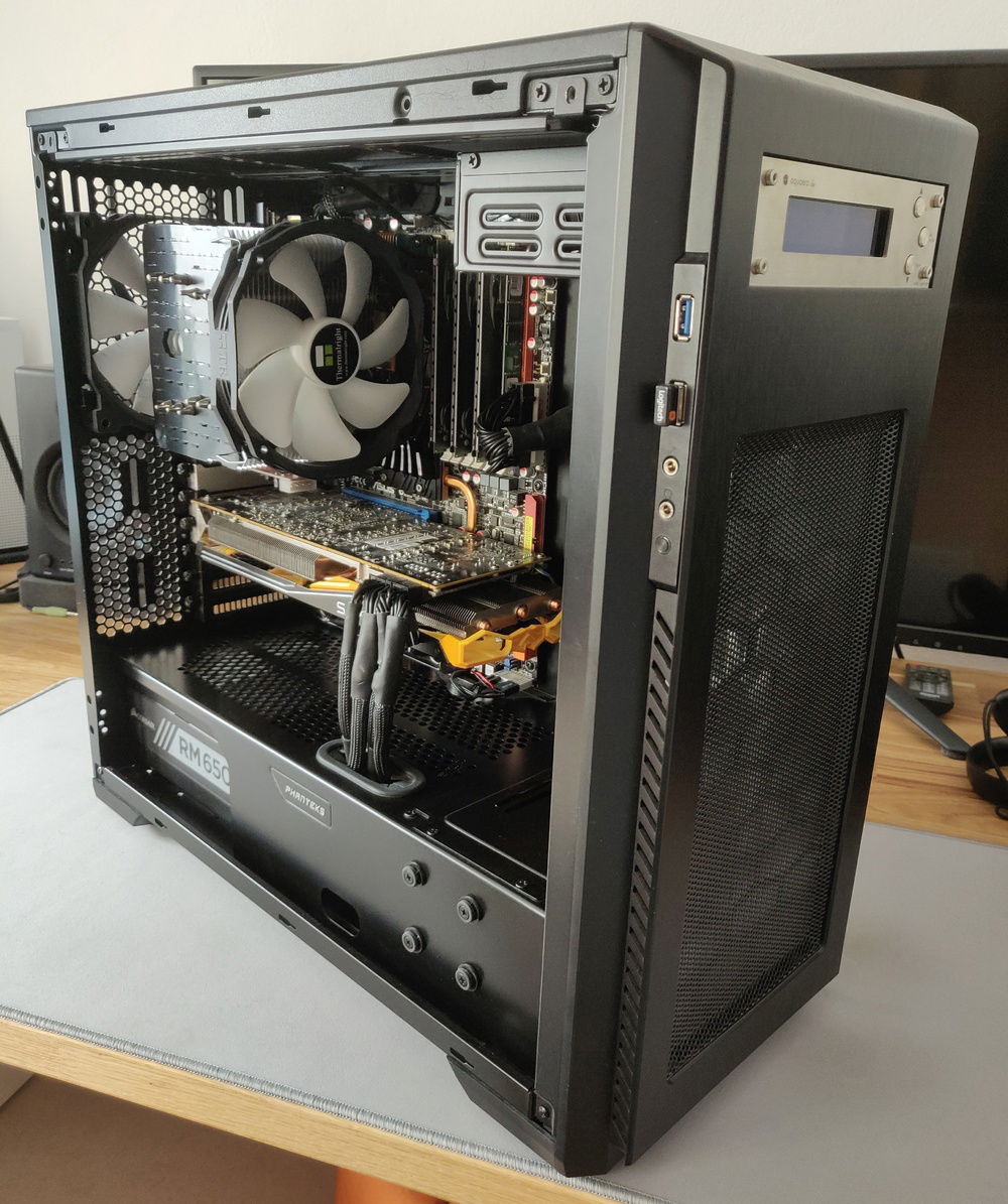 This was one of the first builds I put together from the ground up. I think it was #2 or #3. Back in 2015, LGA1366 hexcores were all the rage in used builds (because Ryzen 5 wasn't a thing yet) and I wanted in. Got an X5650 for a few bucks off ebay, a P6T Deluxe for too much locally, threw in some collection of generic ram. Modded the bios, overclocked, built wild constructions for vrm cooling so I could get just a few more MHz for benchmarks... At some point I shifted the build's focus to being a quiet semi-workstation I could leave running overnight to do rendering or whatever. Dialed back the OC, slapped on a Macho, a few other changes, swapped through like half a dozen videocards (560Ti to 660 to something something to 760x2 to 780Ti to 290X now) and here we are now.