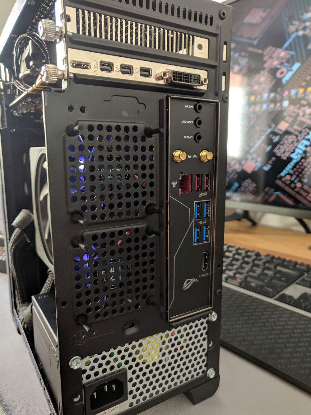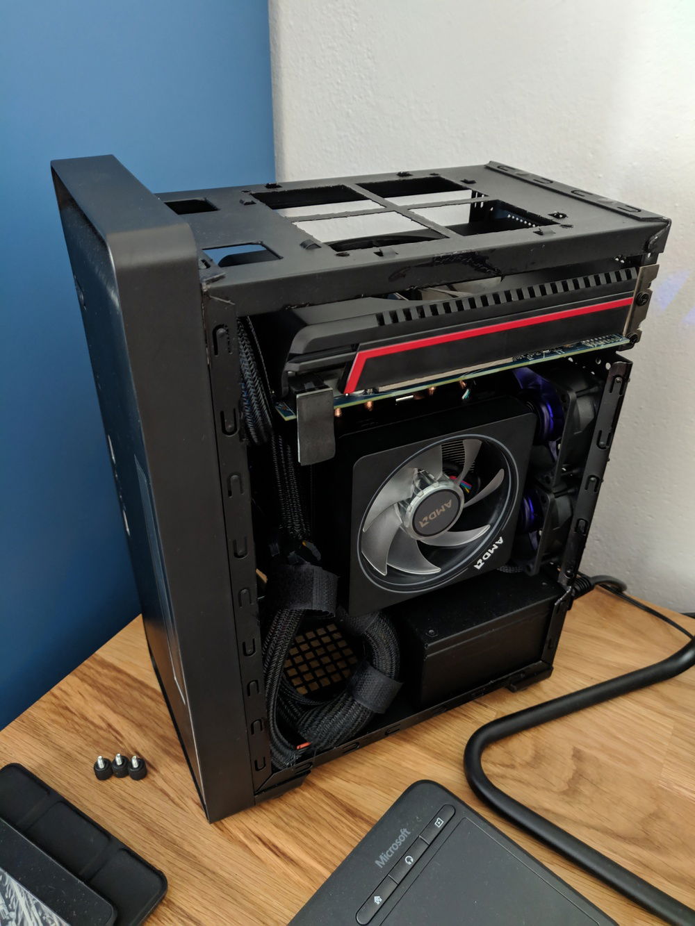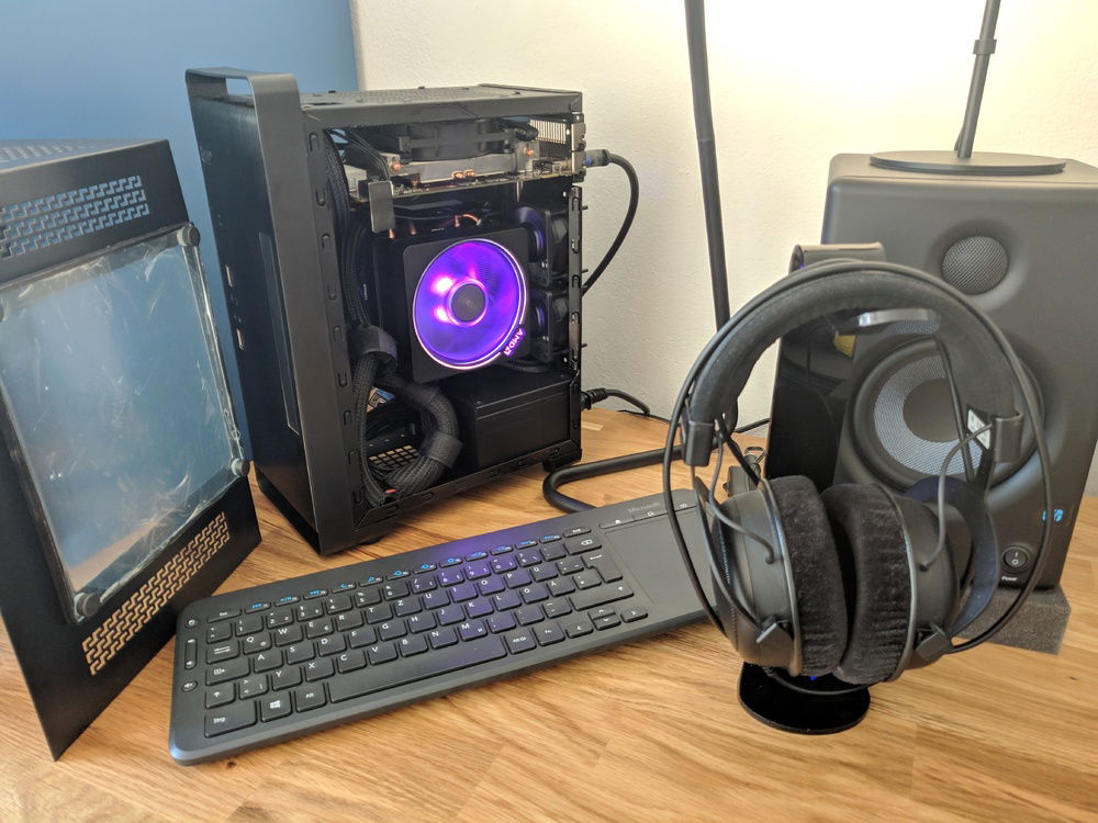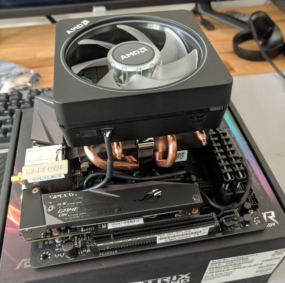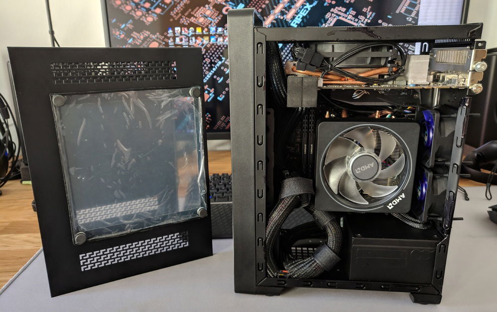 After usually building larger ATX and µATX builds, I wanted to get back down to ITX size again and see how much I could cram into a tiny case. Well, not as tiny as some of the premium SFF options anyway. B450 ITX board leaves upgrade options for higher core count CPU later on (Ryzen 3000 should free up the 1700 currently running in my main rig). GPU is the toughest to get right here. The dimensions are tightly constrained, length cannot exceed 200mm, height cannot exceed 115mm. Even worse, if the PCIE power plug(s) point towards the side panel, height cannot exceed 113mm AND even then you still can't fit the power plugs directly, but will need to use very low profile adapters. I found some U-turn 6pin adapters on moddiy.com that served the purpose as they only add 7mm towards the sidepanel, which technically is still about 2-3mm too much, but since their outer face is foam, there's a little wiggle room. Even then though, the whole motherboard+tray are flexing a tad when the sidepanel is fully on.