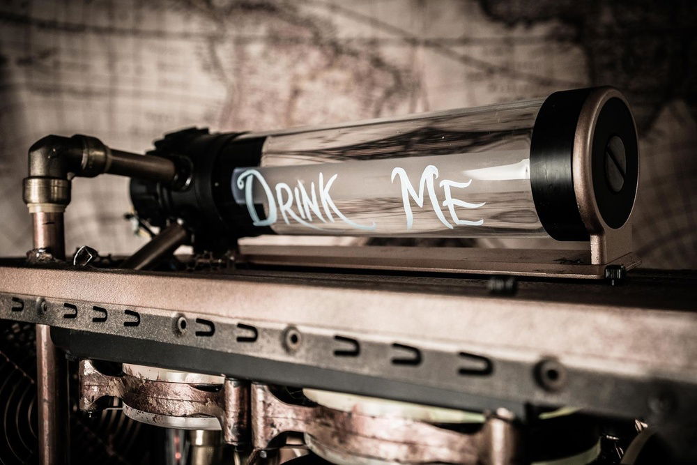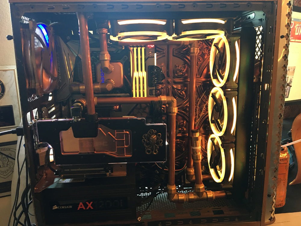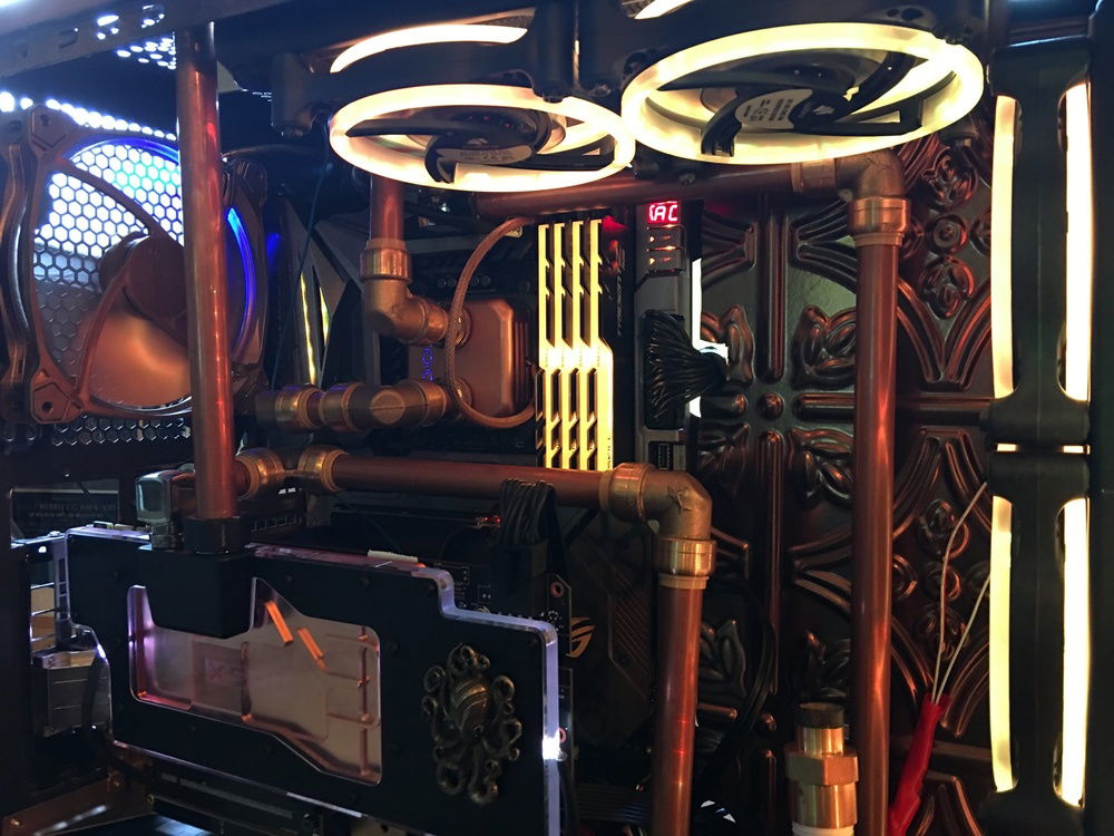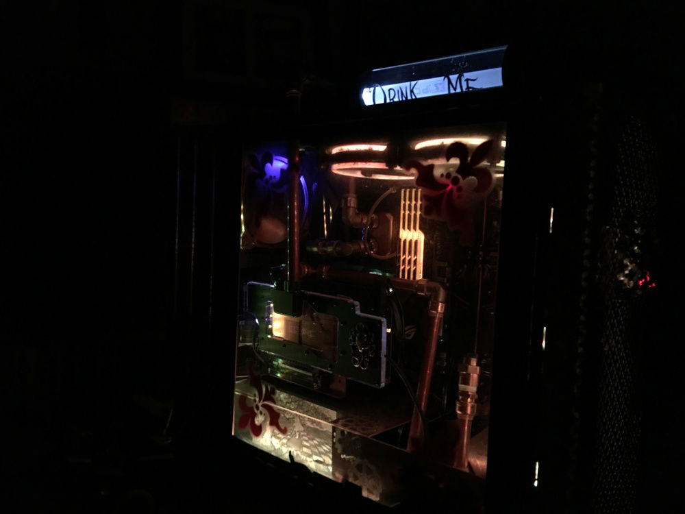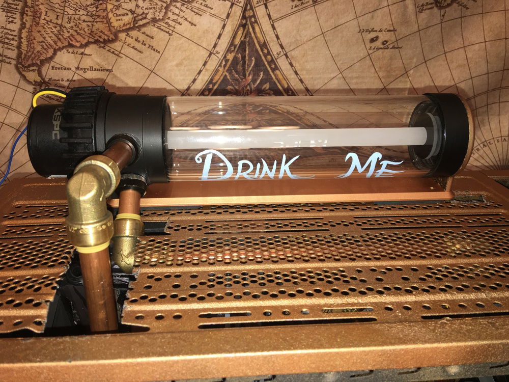 I want to incorporate Alice in Wonderland and Steampunk into the build and thought the best way to do that was to use one half-inch copper tubing along with the push to connect fittings by Sharkbite. I also painted the case to make it look more antiqued and added a decorative backdrop inside the case to bring the exterior and interior together. The lighting effect is meant to incorporate an Edison bulb glow to the interior.