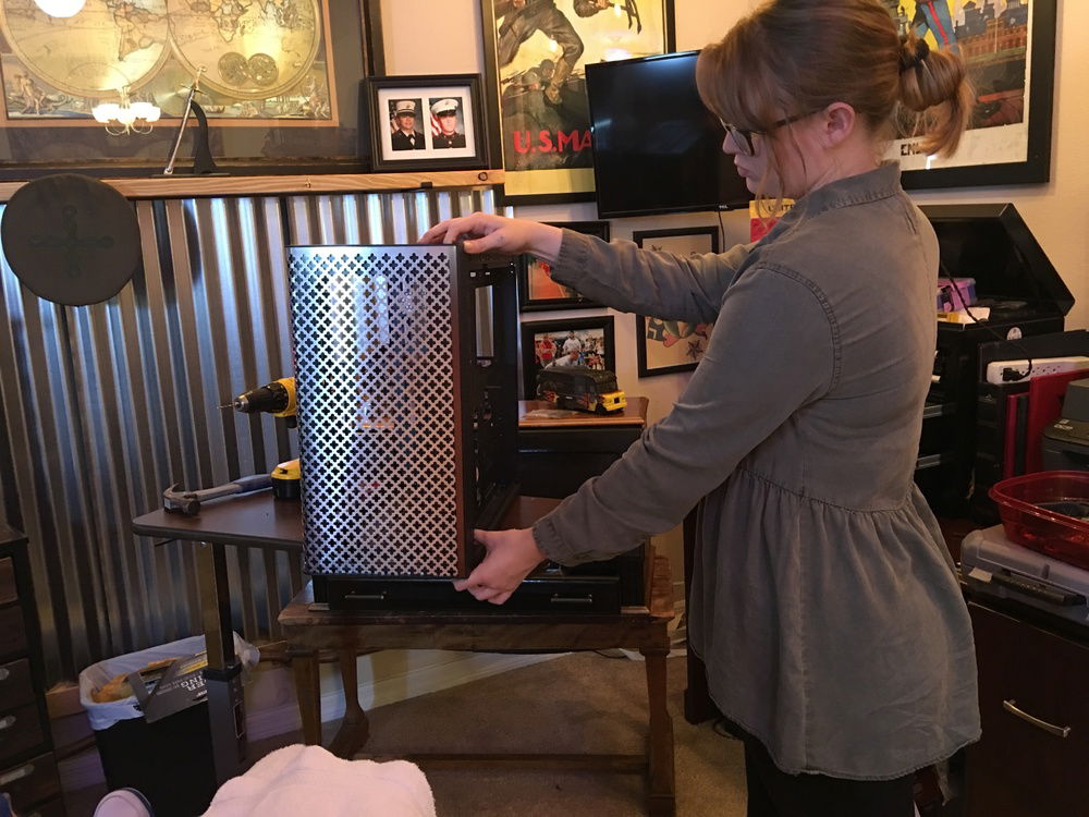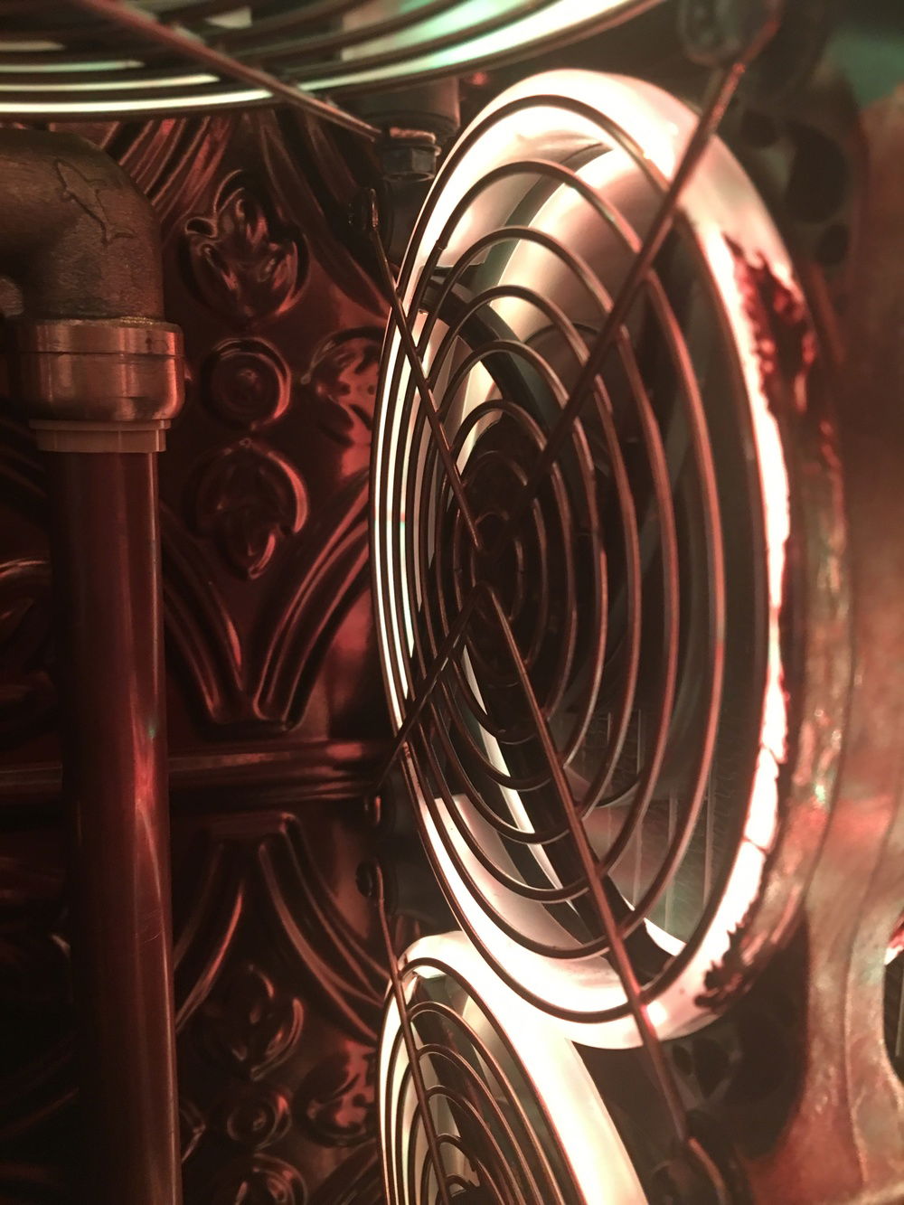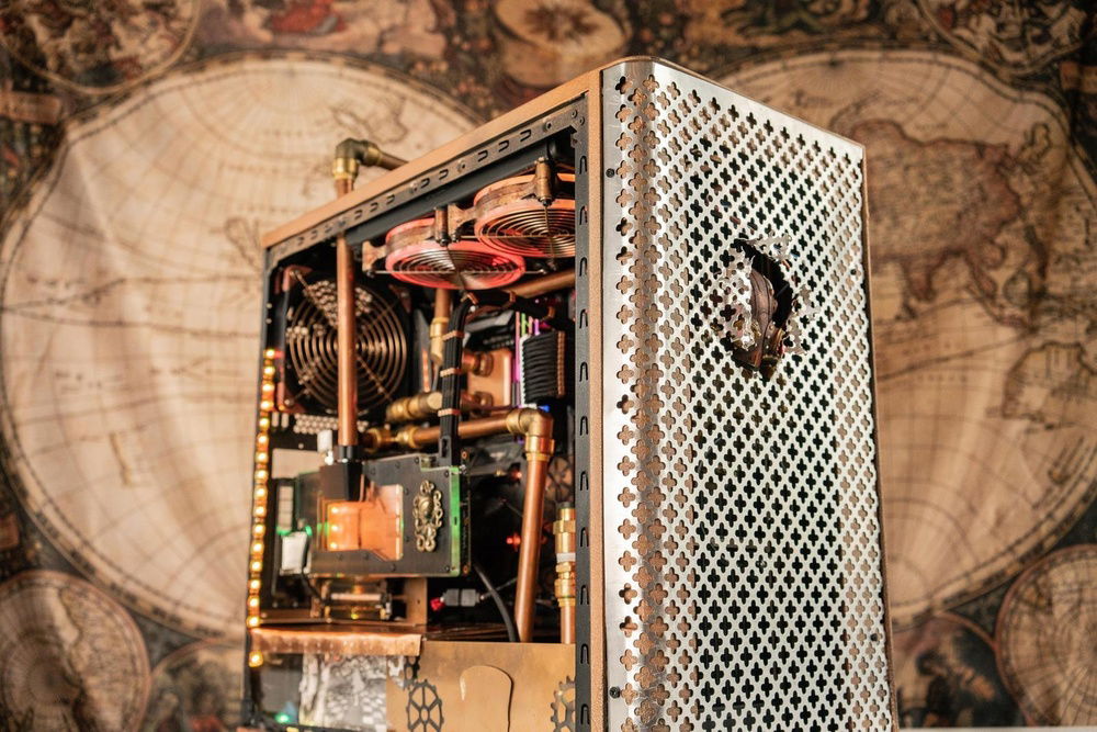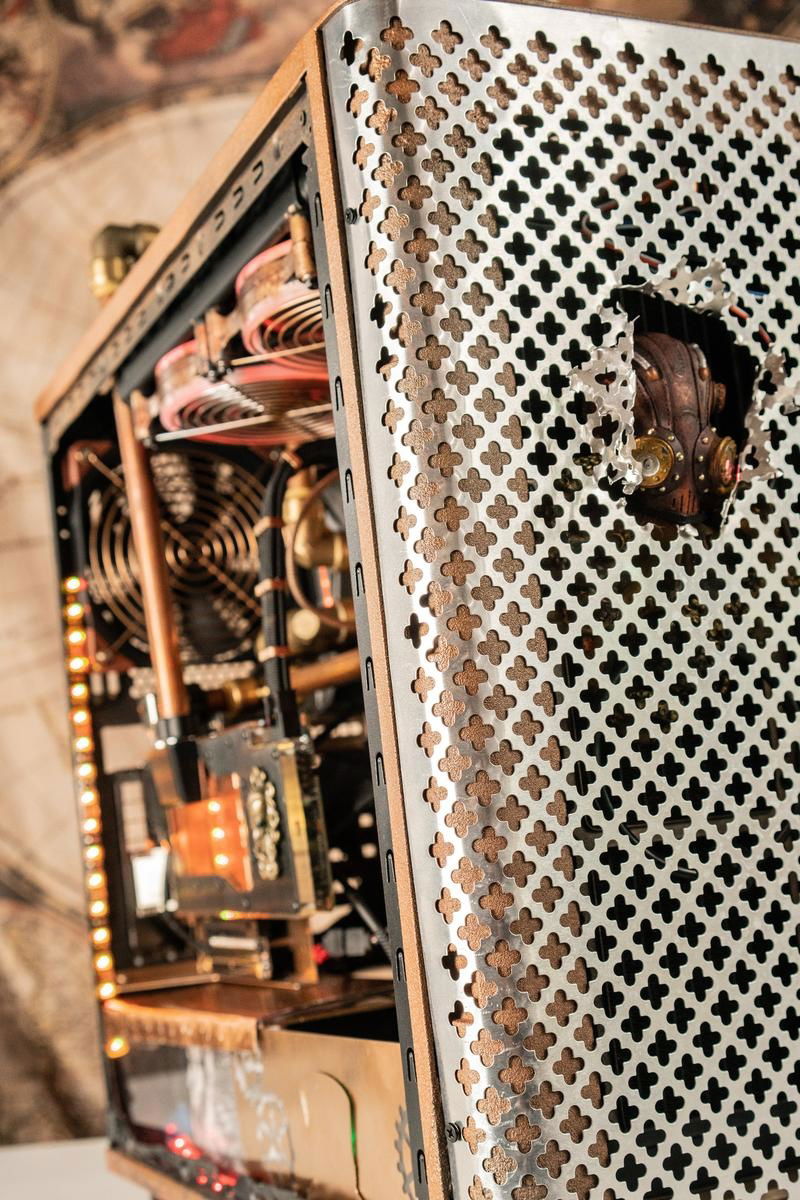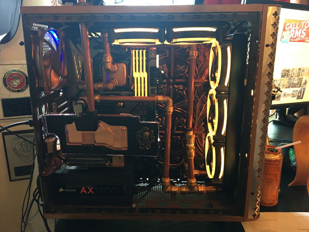I want to incorporate Alice in Wonderland and Steampunk into the build and thought the best way to do that was to use one half-inch copper tubing along with the push to connect fittings by Sharkbite. I also painted the case to make it look more antiqued and added a decorative backdrop inside the case to bring the exterior and interior together. The lighting effect is meant to incorporate an Edison bulb glow to the interior.