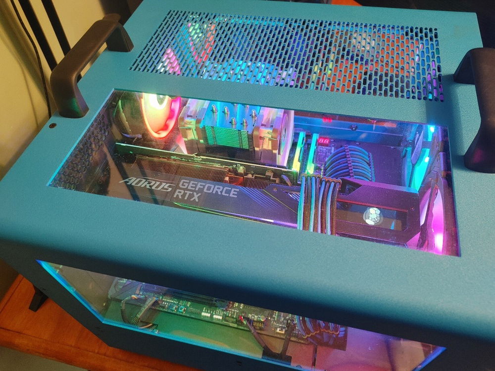 It sits on a Uplift 900 two leg Sit/Stand desk frame with custom built wood desktop surface.