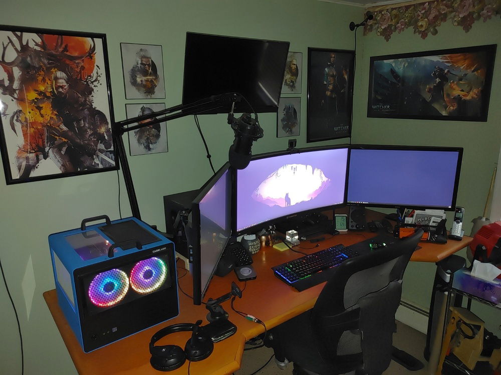 The monitors are on 3 Amazon Basics monitor arms that are attached to the desk. I've put grommets through the desk in spots and have a shelf below where I house cables, powerstrips, modem/router, etc...