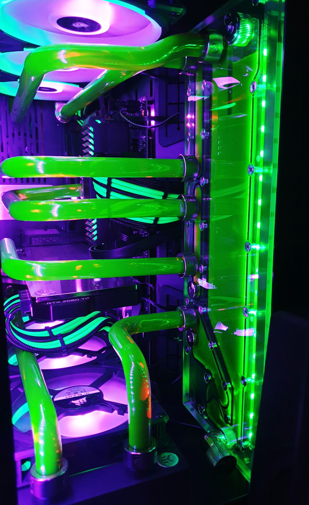 I used custom CableMod Green UV reactive cables and Acid Green UV reactive coolant from EKWB. To add this glowing effect I've added CableMod Widebeam Hybrid UV led strip. Joker lamp is from AliExpress.