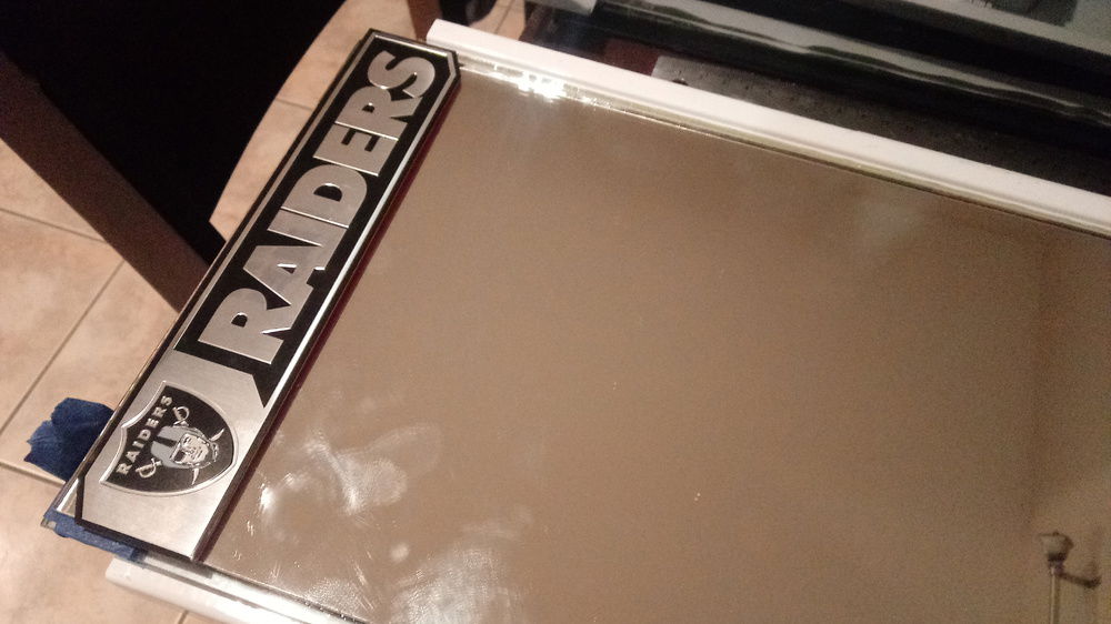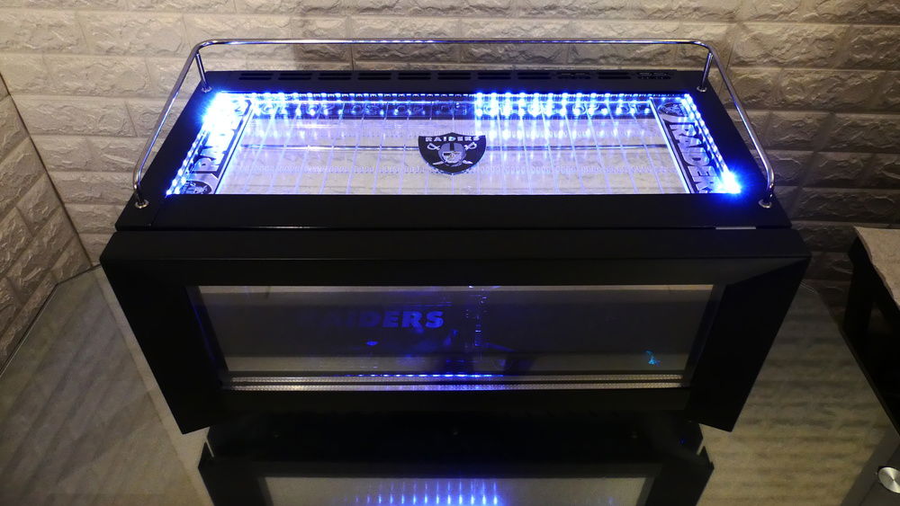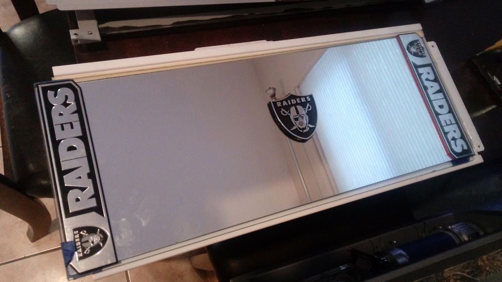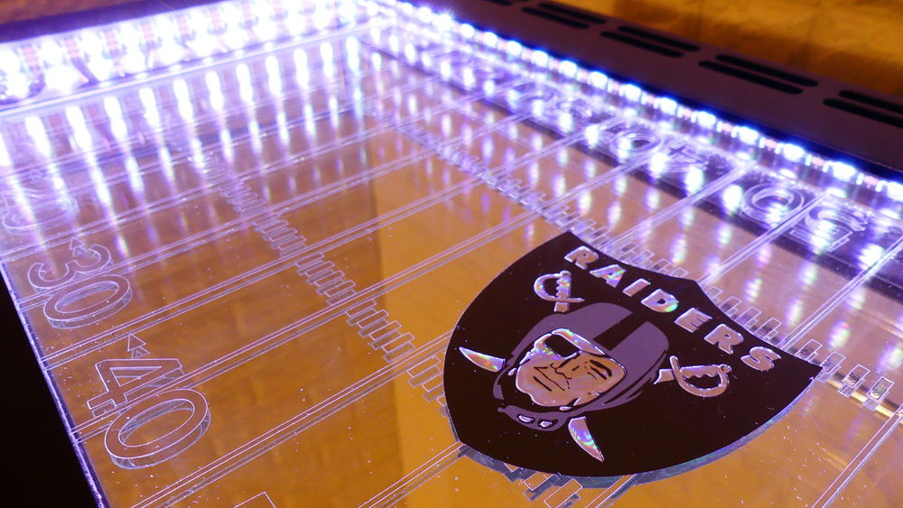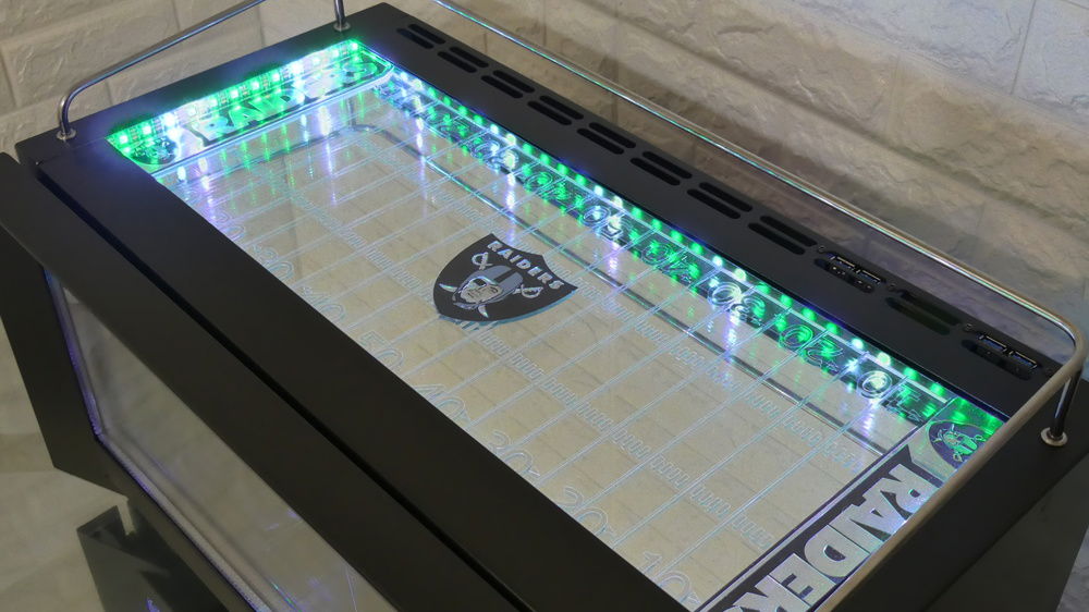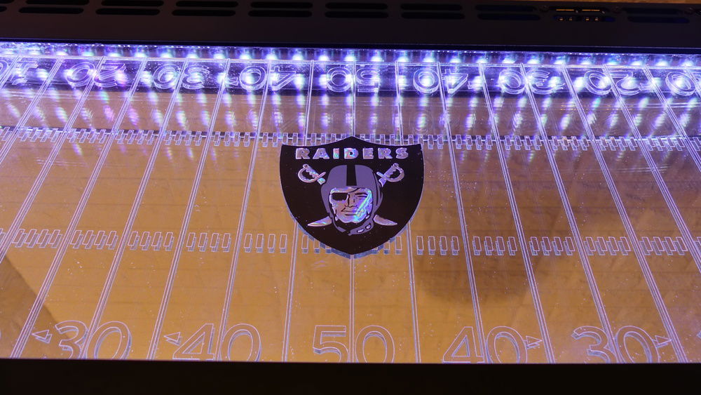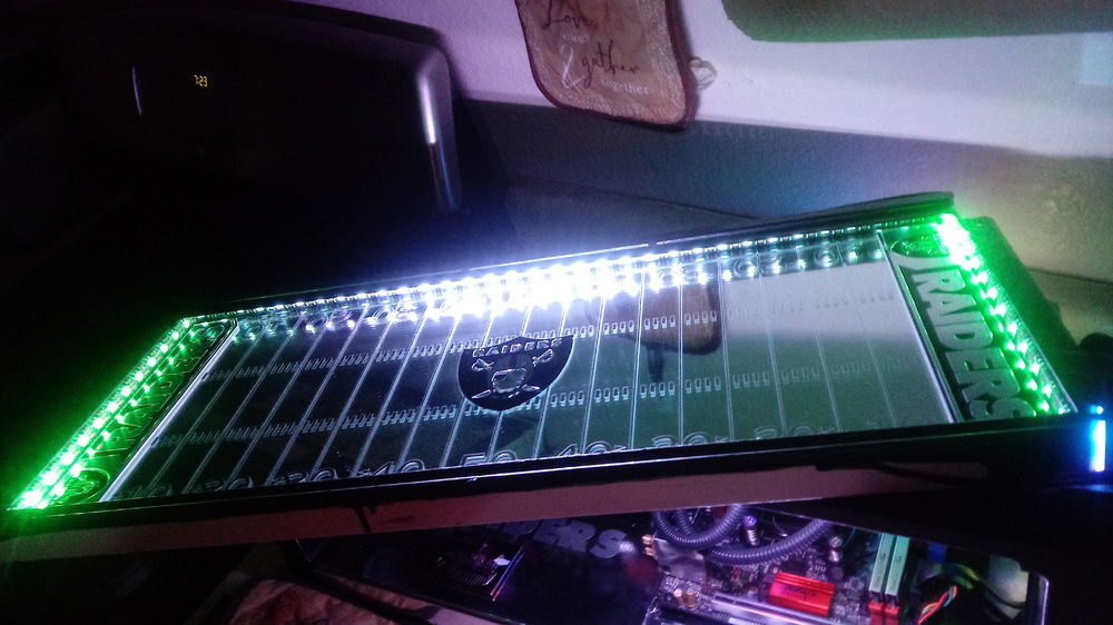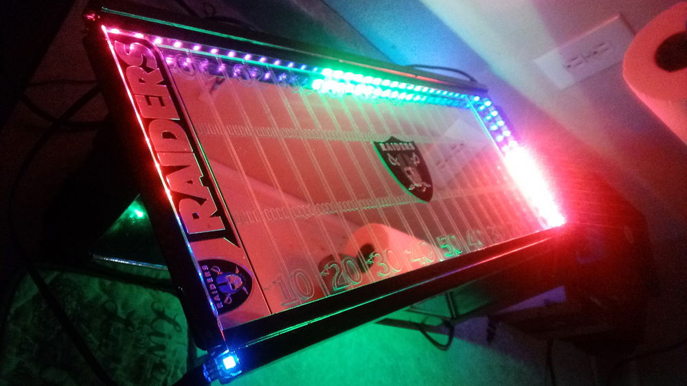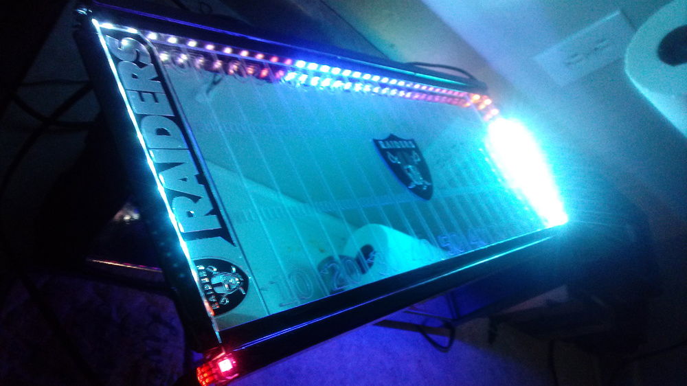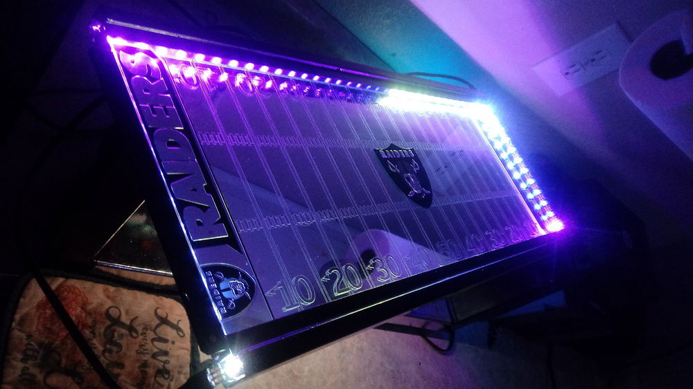 This came with a white top which I removed and added clear glass. Beneath is a mirror with chrome vinyl decal I had cut and installed with 2 truck emblems as end zones and a reflective decal for center field. The interior is surrounded by 2 5v RGB 100mm LRC2.0 strips