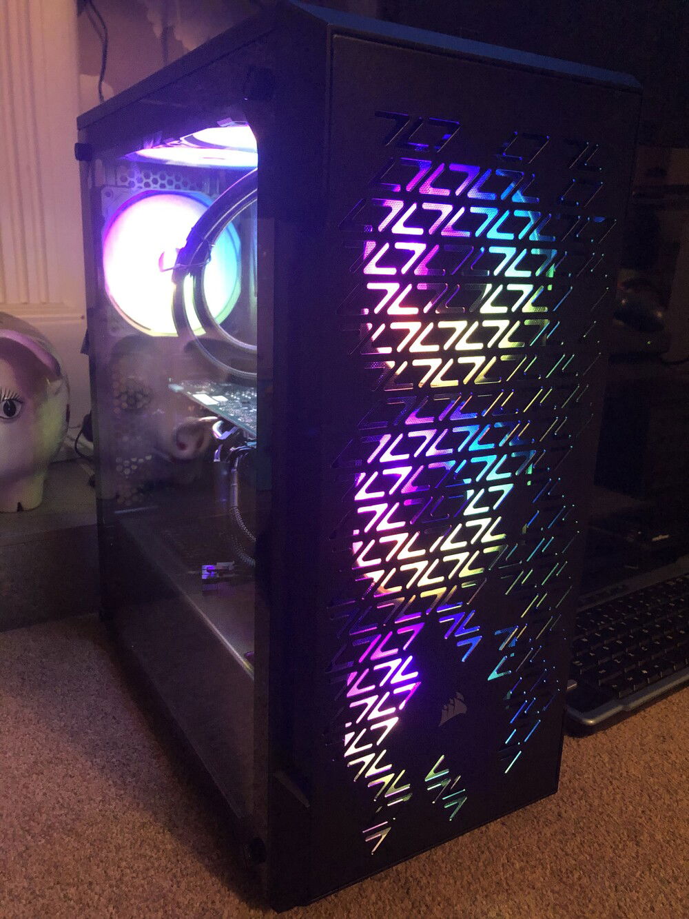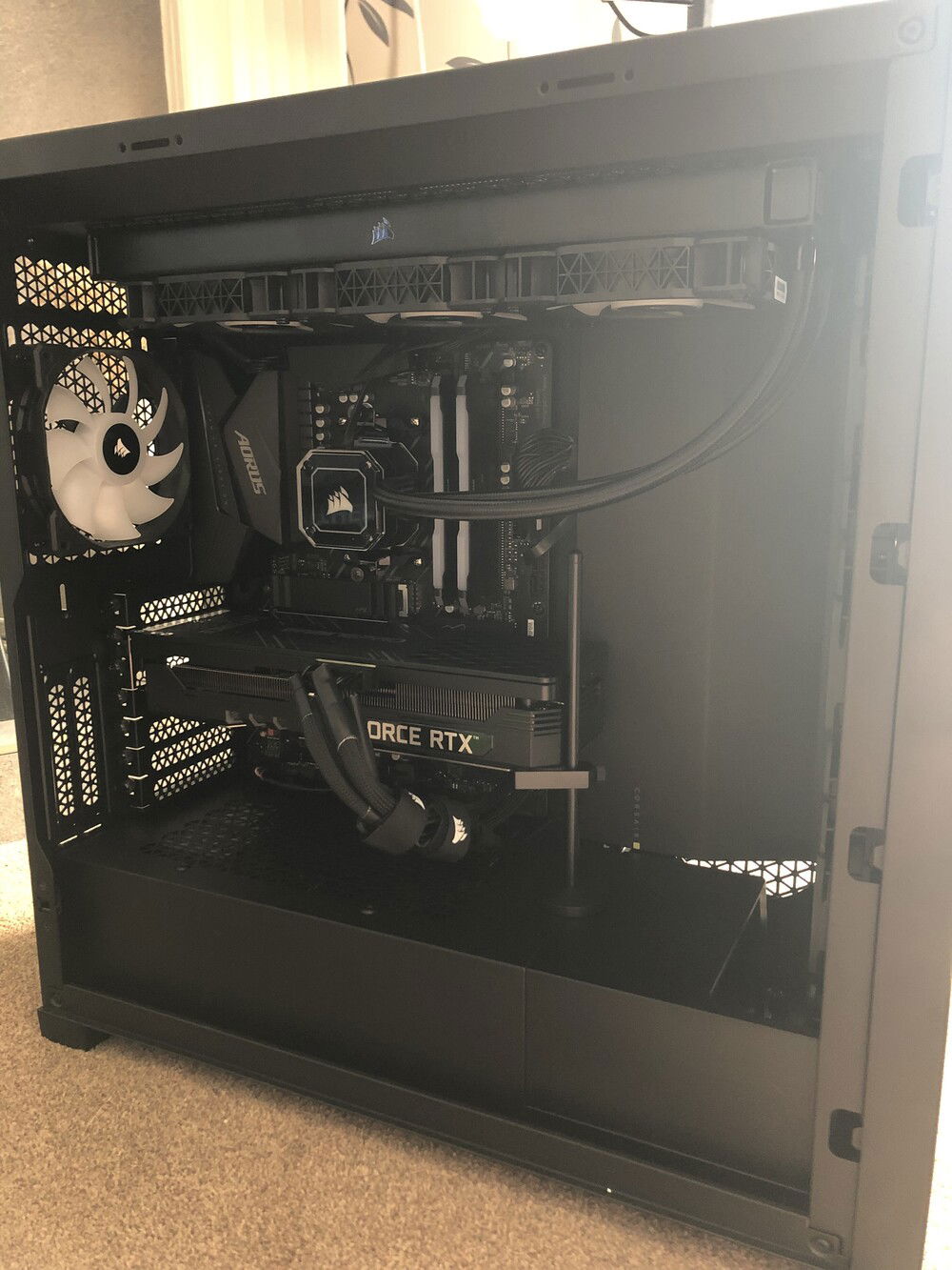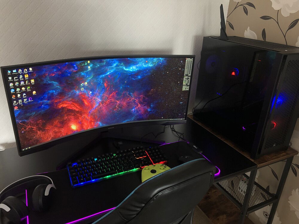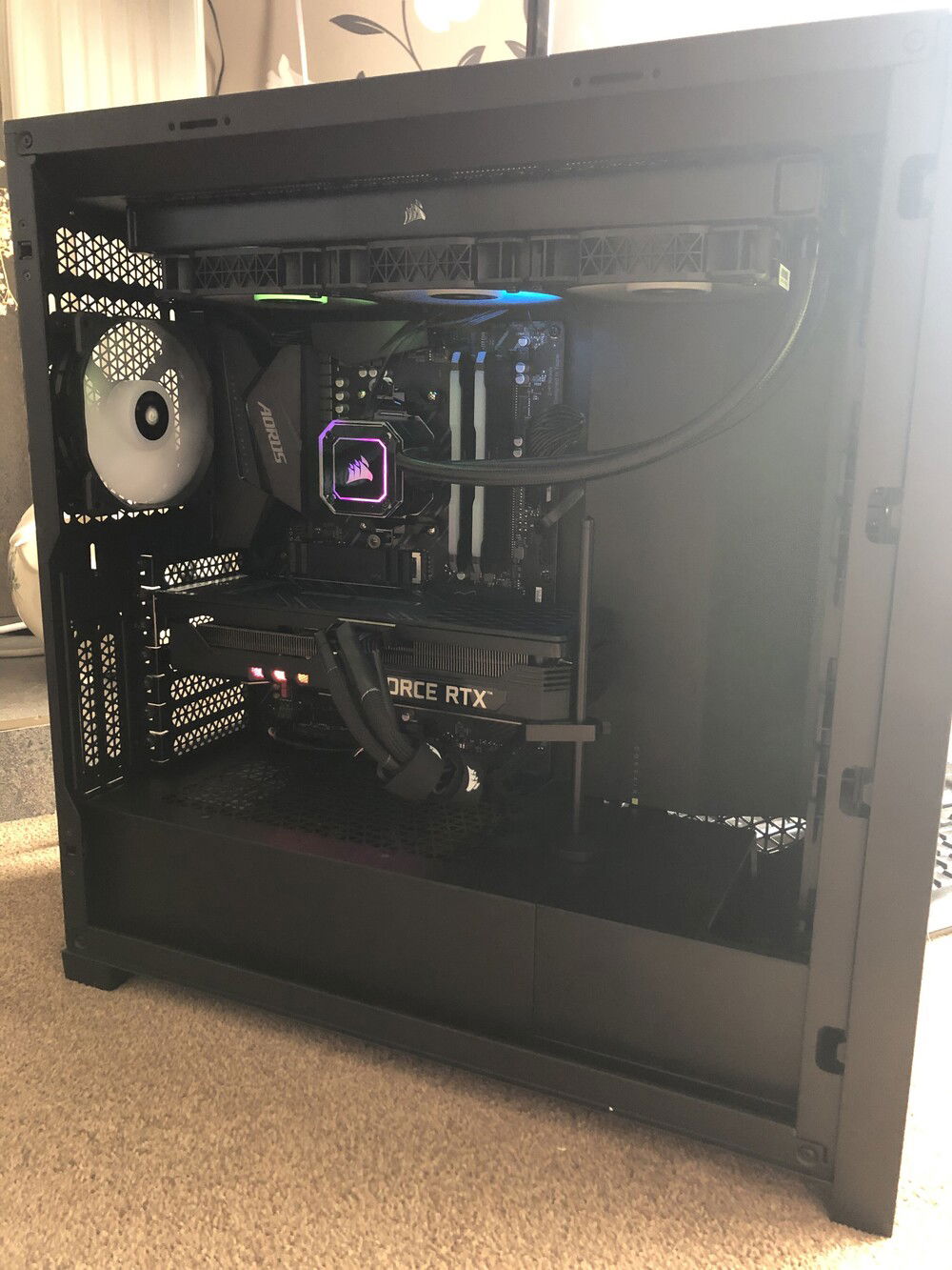 This is a Gaming system I built for my brother last summer. He originally ordered the Corsair 220T RGB which I built his system in but when he managed to get a new GPU it was too long for that case so I switched his build into the Corsair 4000D Airflow. Also swapped his Corsair H100i Elite Capellix for the H150i version with the extra space the case upgrade provided. He's since upgraded to a Ryzen 7 5800X3D and a Gigabyte GeForce RTX 3090 Gaming OC so I shall snap some more pics next time I see him. The Ultra-Wide Quad HD monitor by the way is a Samsung G5 Odyssey 34" G55T.