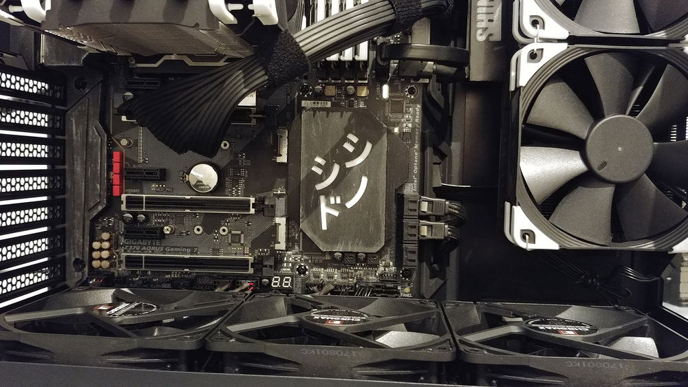 I have fans blowing air from the bottom of the case to the top, and normally I would say that it gives the case nice airflow, except for the PCI-E extension cable that blocks some of the airflow to the CPU cooler. What I really wanted to do is mount the PCI-E cable on the bottom PCI-E slot and have it wrap around the back to the GPU so that the cable isn't visible. That angle is a bit too tight, and the hole to small, so for now this is my solution.