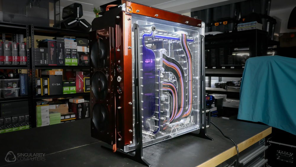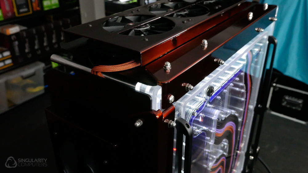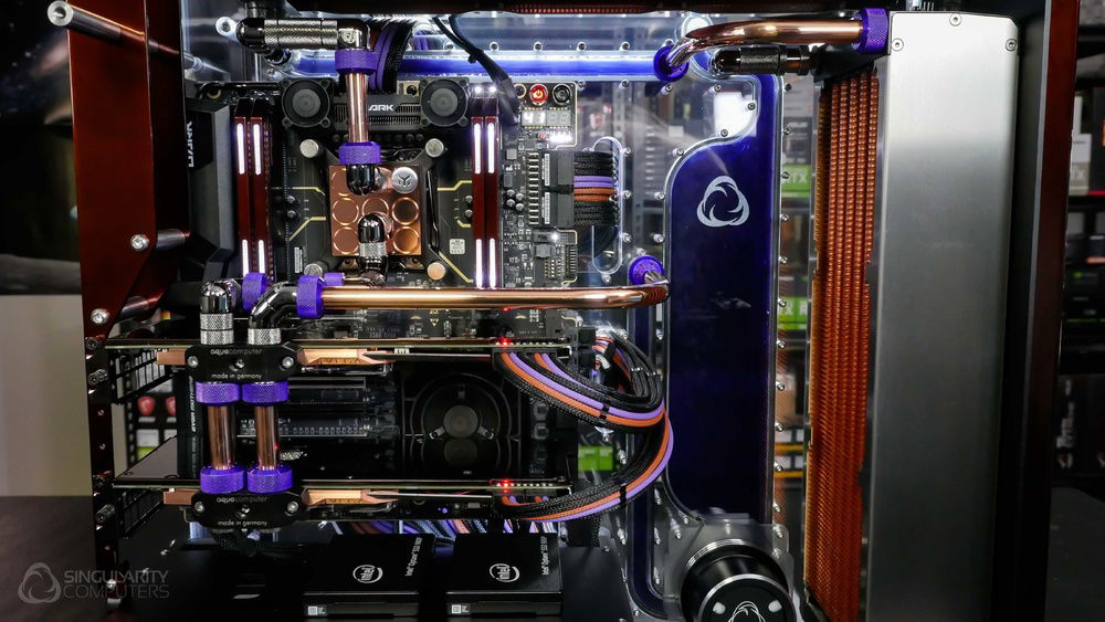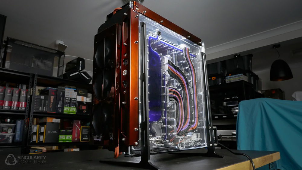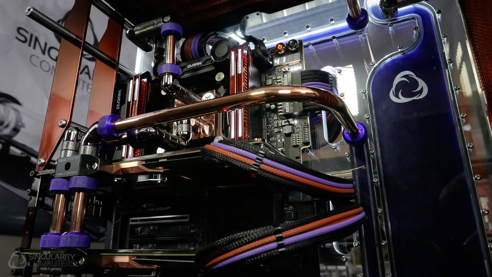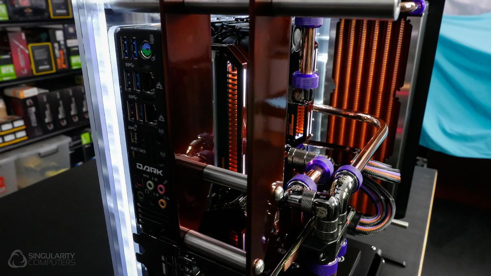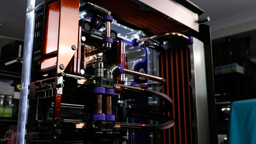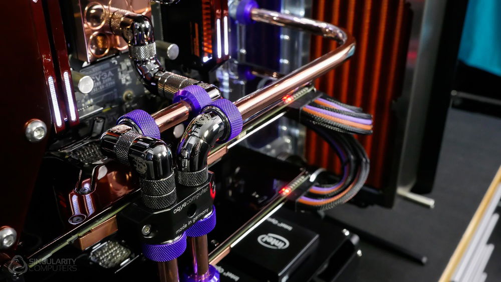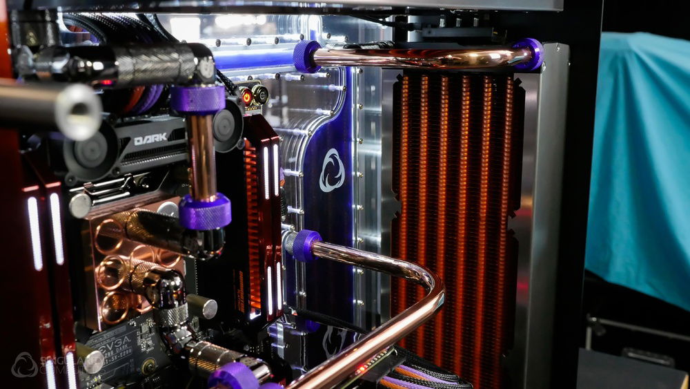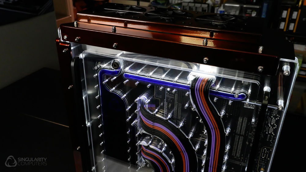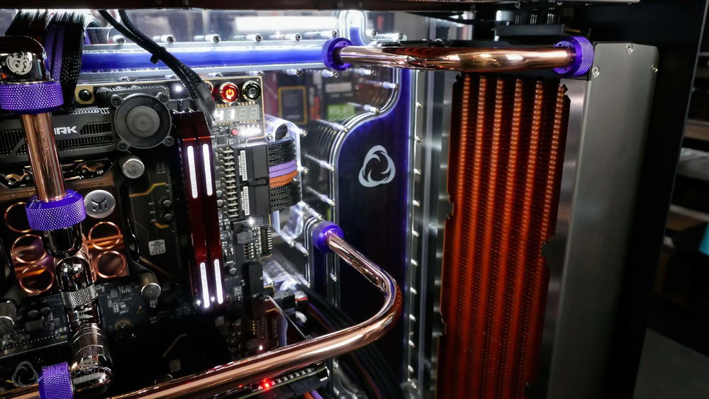 From the team who created Spectre we bring you Copperiedus. A customized Spectre 1.0 with custom external fan shrouds for the externally mounted fans. This allowed us to install radiators thicker than 60mm. Copper water-blocks, radiator fins and tube. The rest of the copper colored components are done in DNA Virtual Chrome paint and a few different Candy colors to achieve the copper special effect. Finished off with MDPC-X Sleeve and Mayhems coolant.