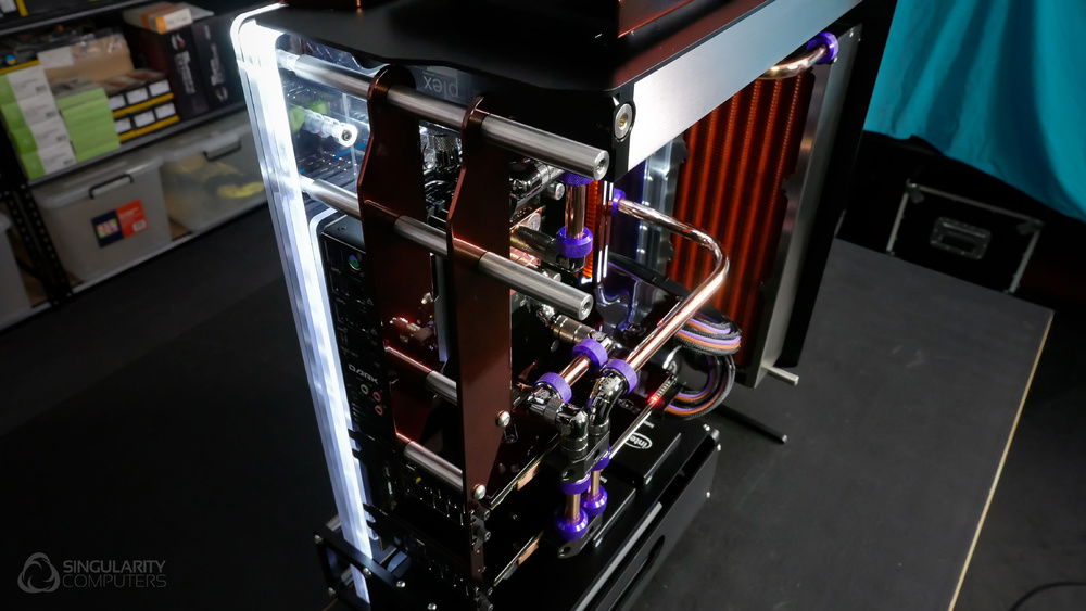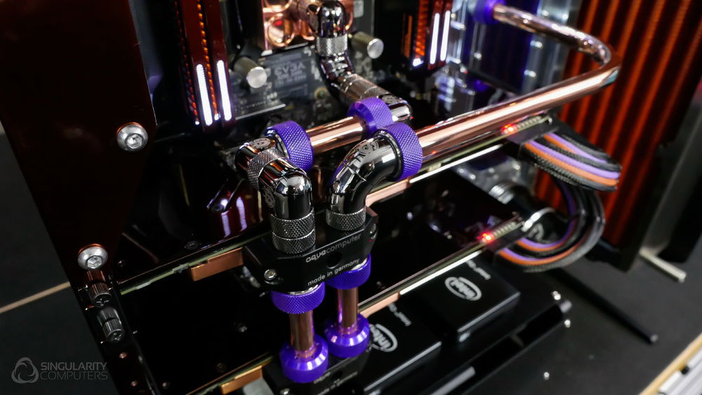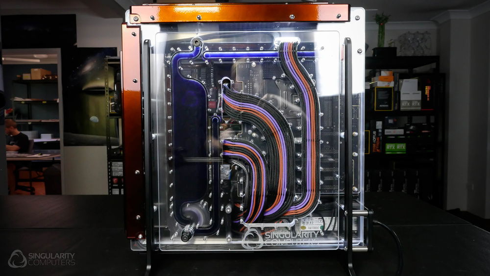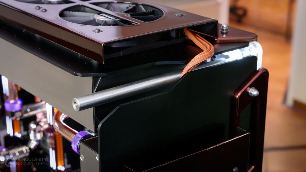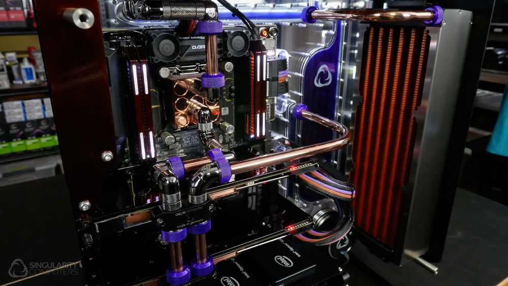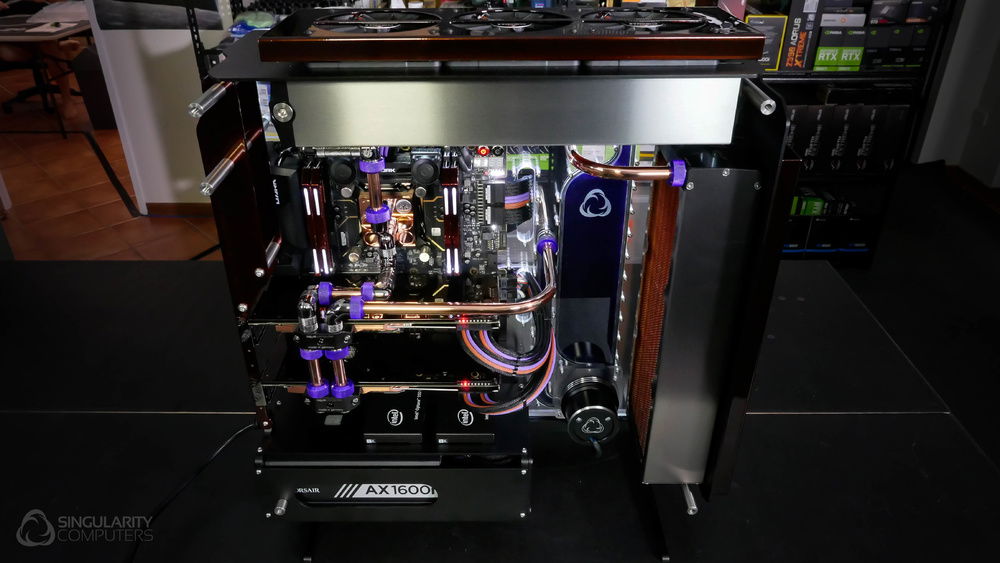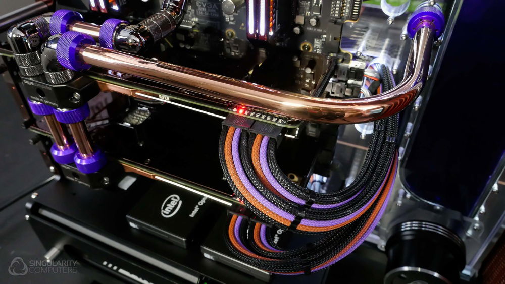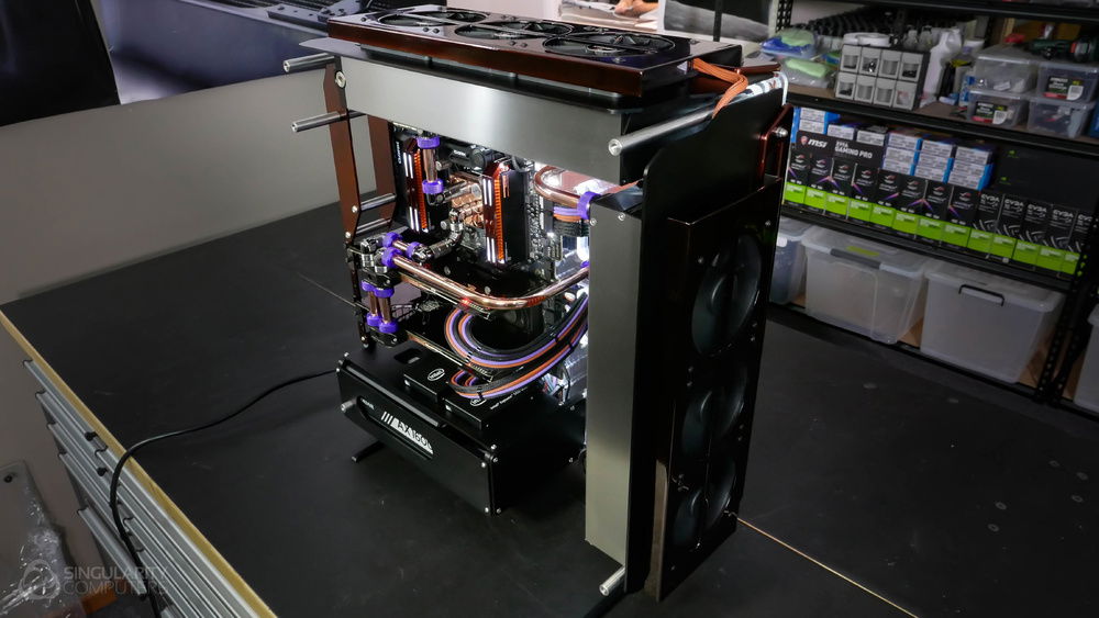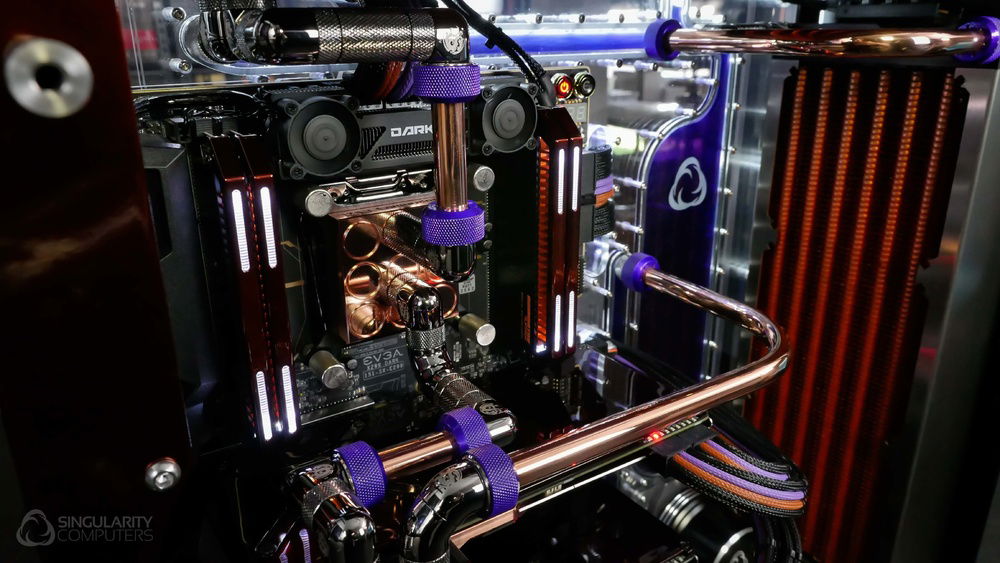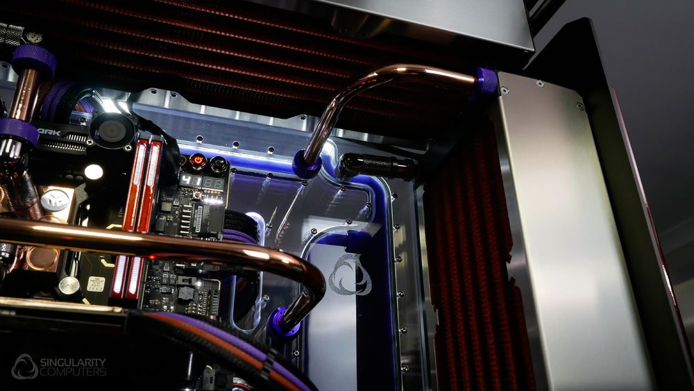 From the team who created Spectre we bring you Copperiedus. A customized Spectre 1.0 with custom external fan shrouds for the externally mounted fans. This allowed us to install radiators thicker than 60mm. Copper water-blocks, radiator fins and tube. The rest of the copper colored components are done in DNA Virtual Chrome paint and a few different Candy colors to achieve the copper special effect. Finished off with MDPC-X Sleeve and Mayhems coolant.