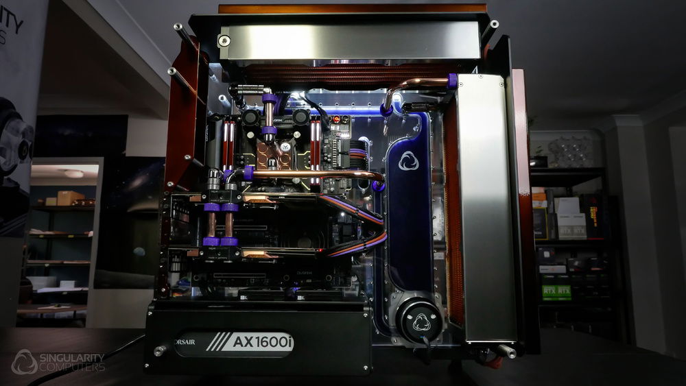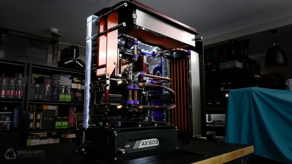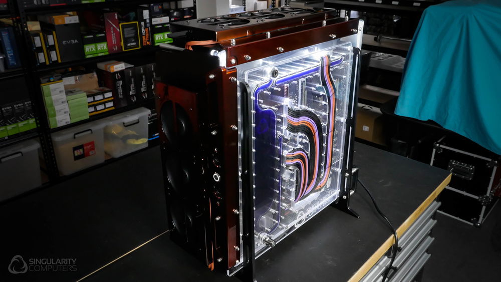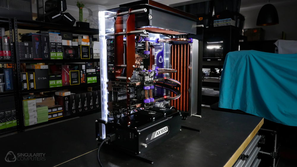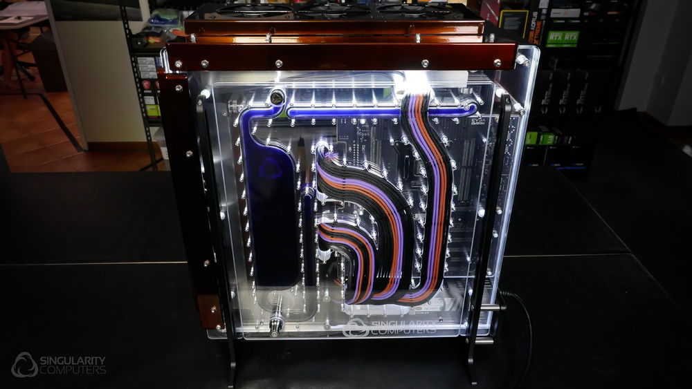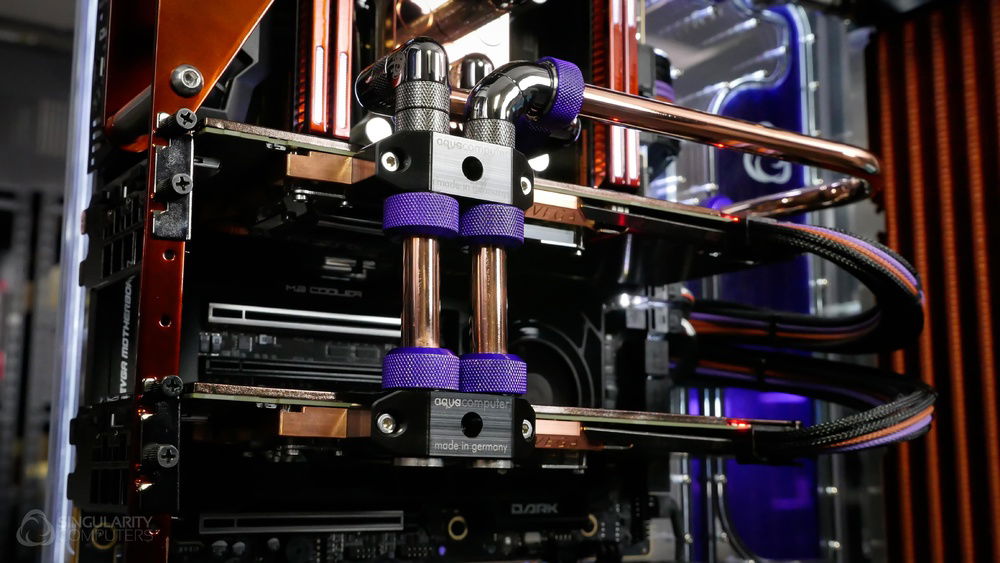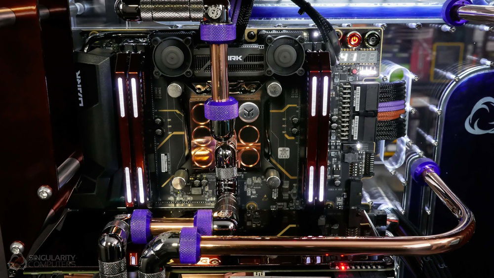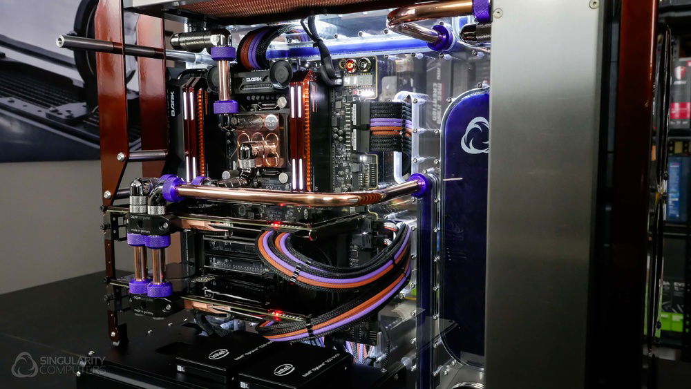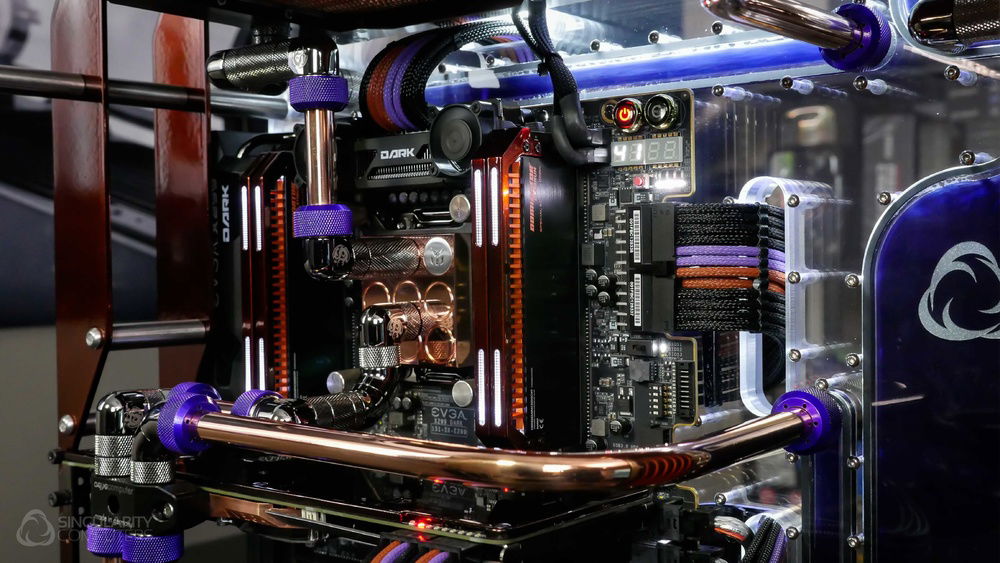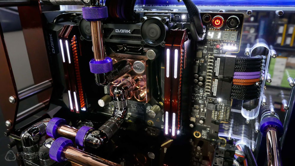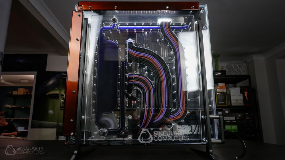 From the team who created Spectre we bring you Copperiedus. A customized Spectre 1.0 with custom external fan shrouds for the externally mounted fans. This allowed us to install radiators thicker than 60mm. Copper water-blocks, radiator fins and tube. The rest of the copper colored components are done in DNA Virtual Chrome paint and a few different Candy colors to achieve the copper special effect. Finished off with MDPC-X Sleeve and Mayhems coolant.