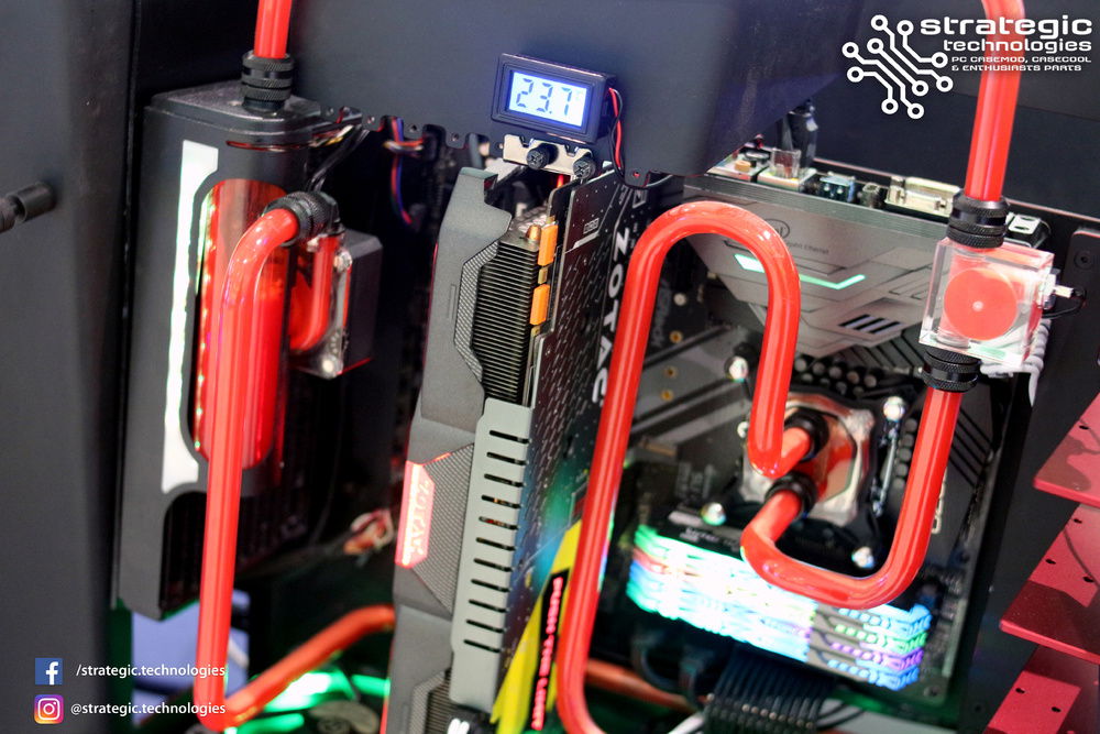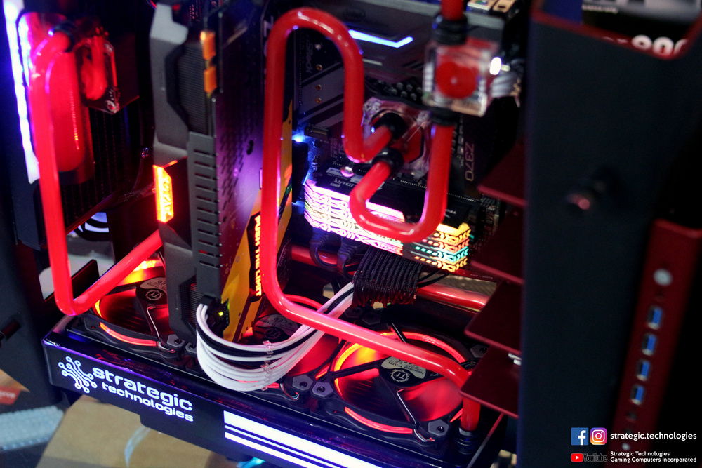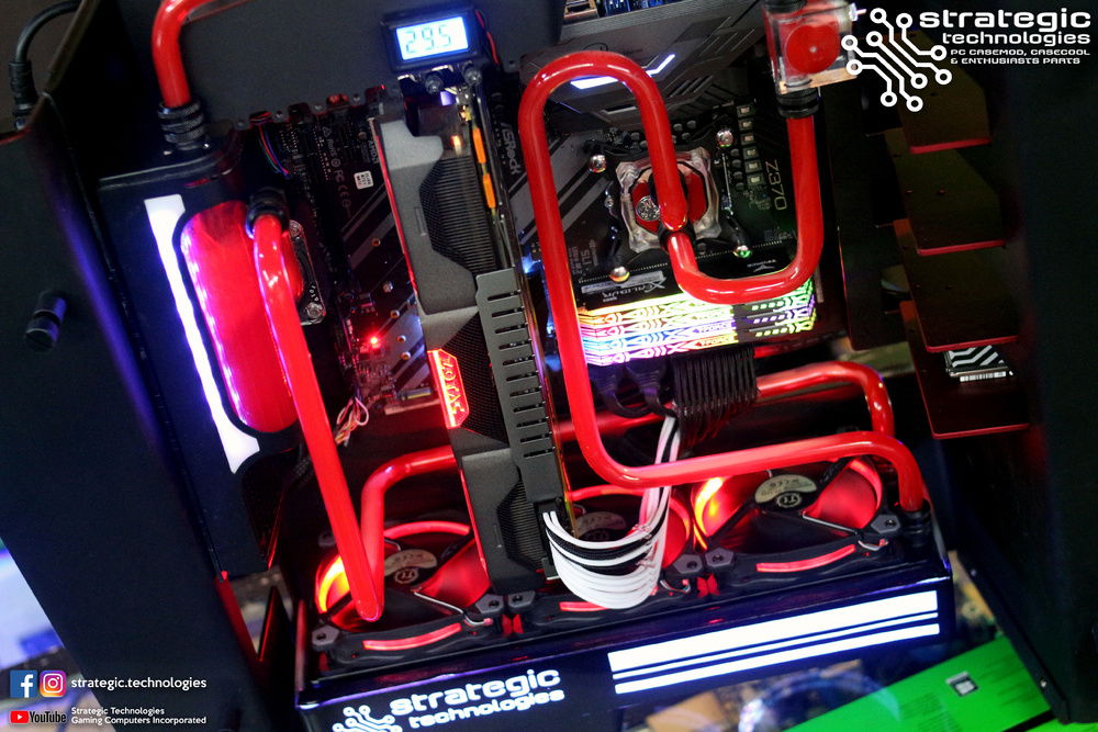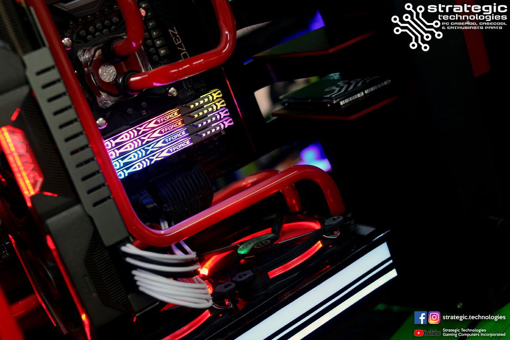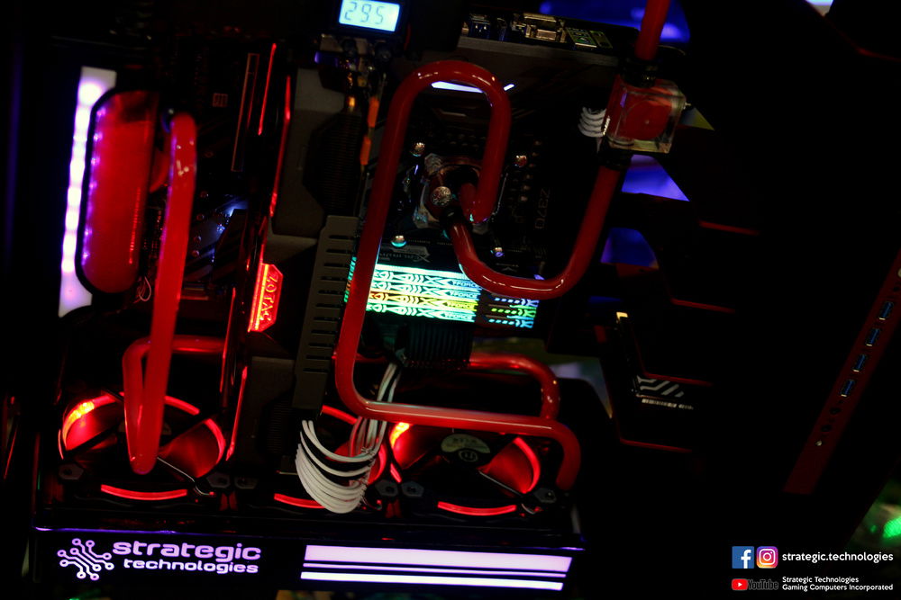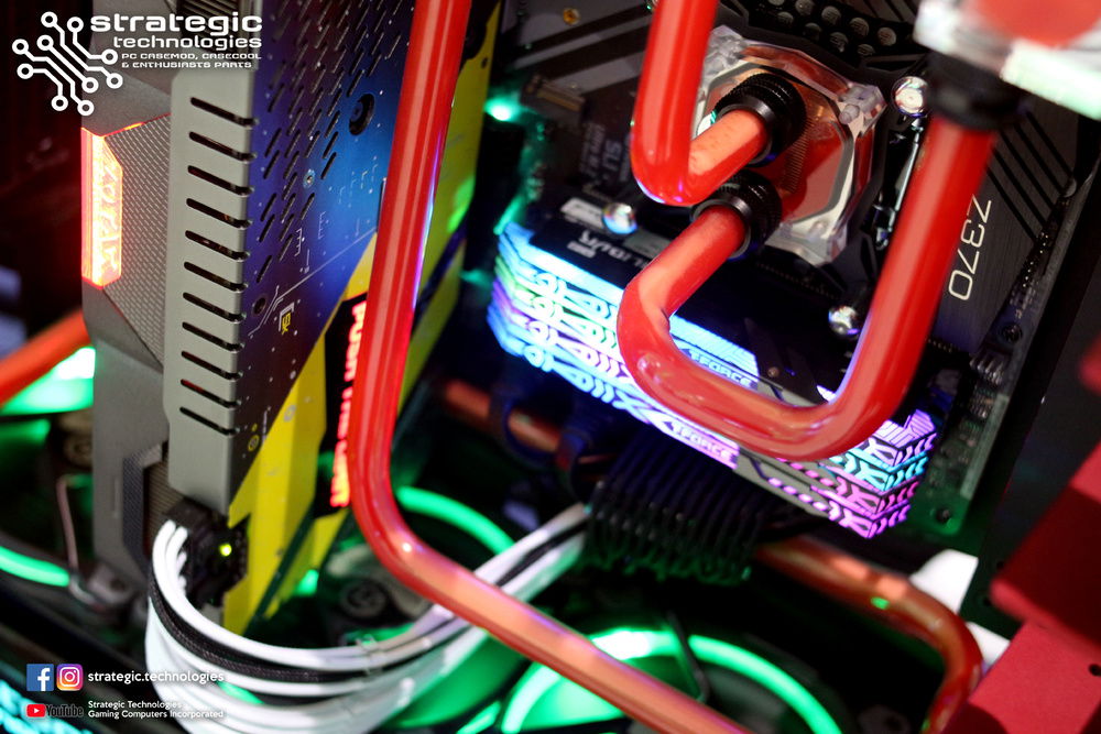 Prestige Edition modified pass-through reservoir and radiator with 5 Volts RGB LED addressable lighting Custom acrylic 280mm radiator mounting Custom radiator shroud with 5 Volts RGB LED addressable lighting