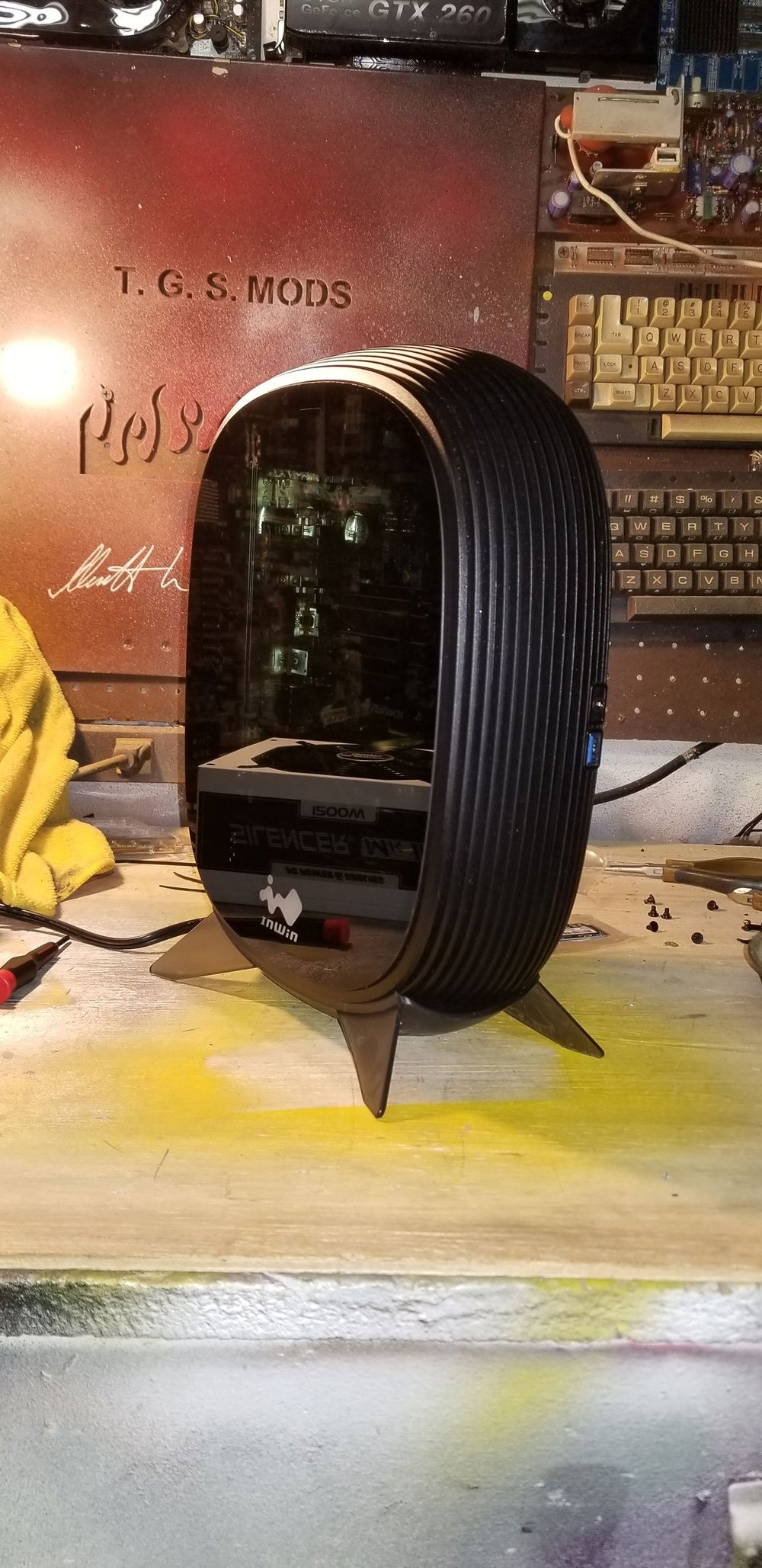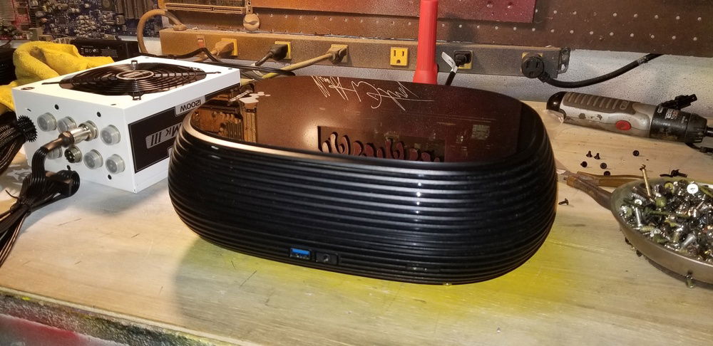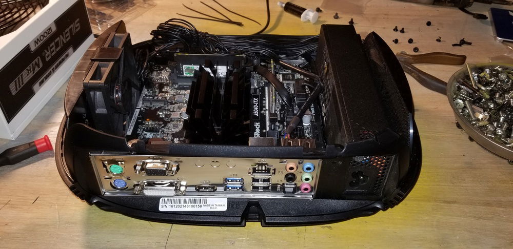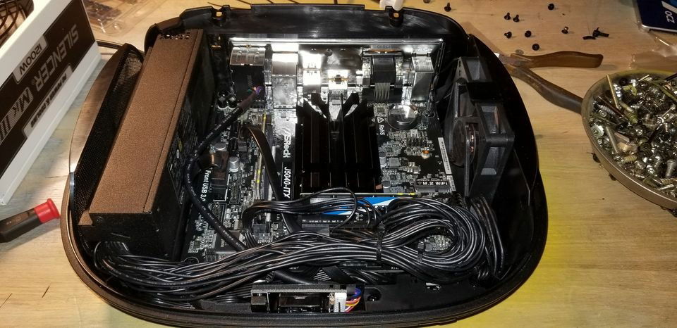 Basic Ultra low power Asrock ITX with imbedded with Pentium Quad core. Only 8GB of DDR4-2400 SoDimms, a 120GB SSD and a build in 200 watt PSU. Literally only used for watching TV