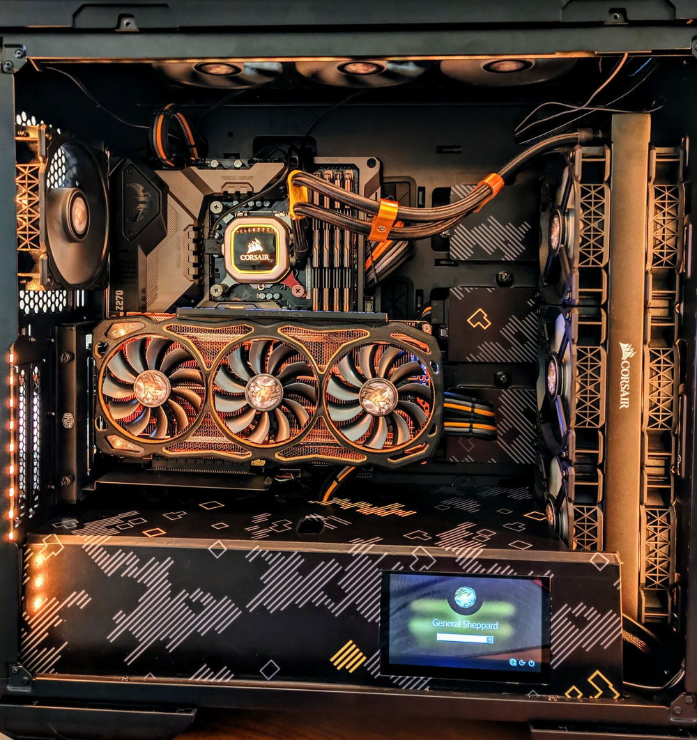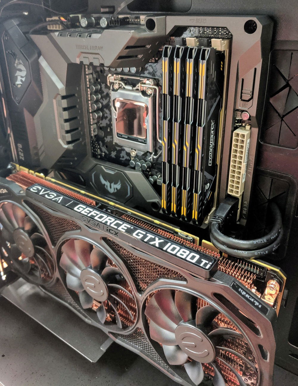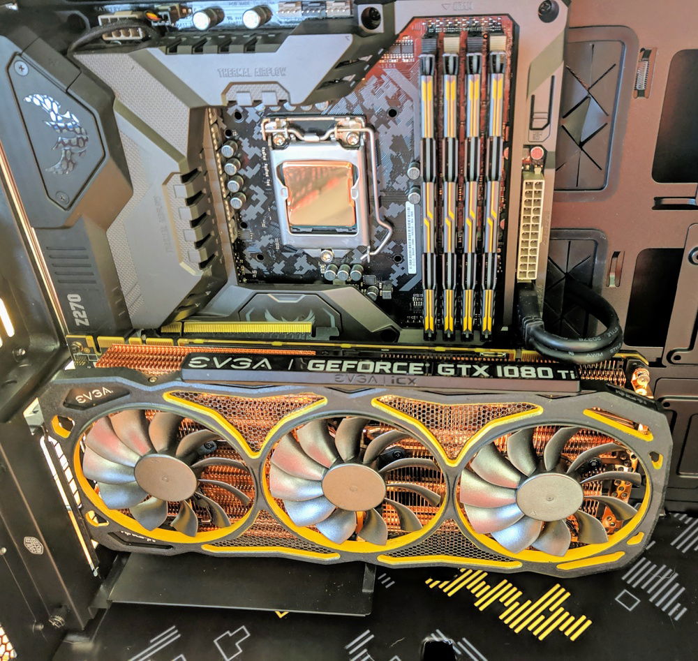 - Graphics Card: EVGA GTX 1080 Ti Kingpin with Liquid Metal, 11GB GDDR5, Custom Painted w/ Cooler Master Vertical GPU Mount