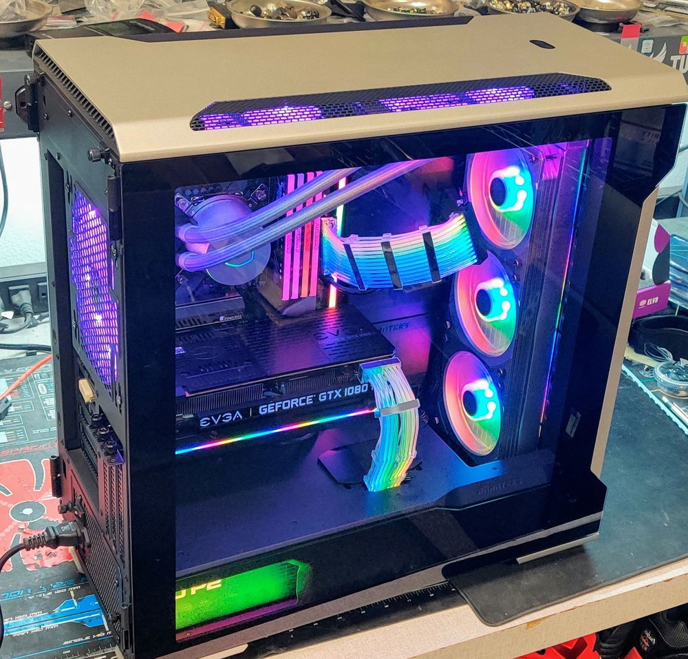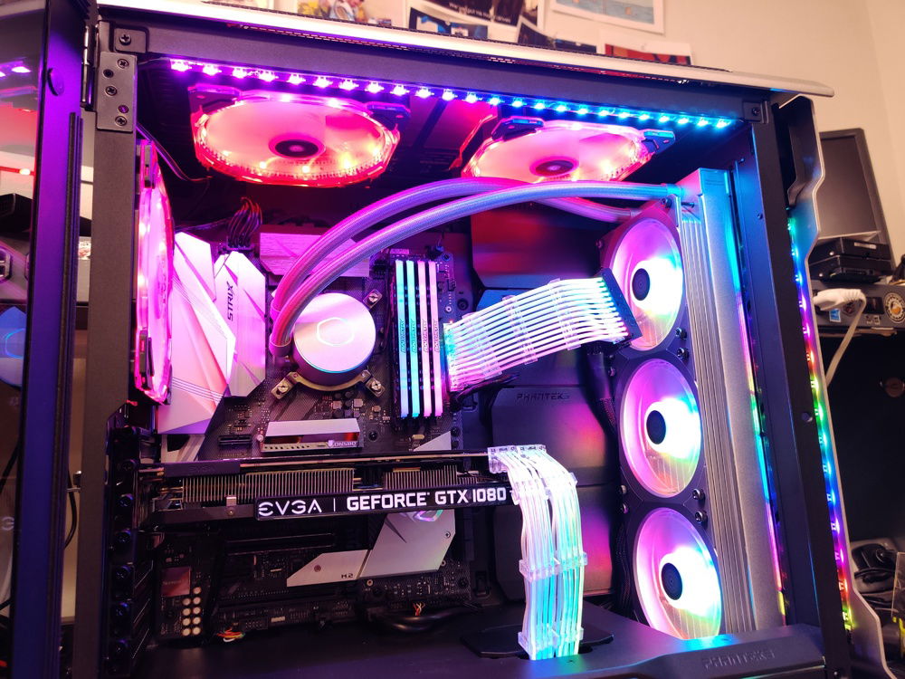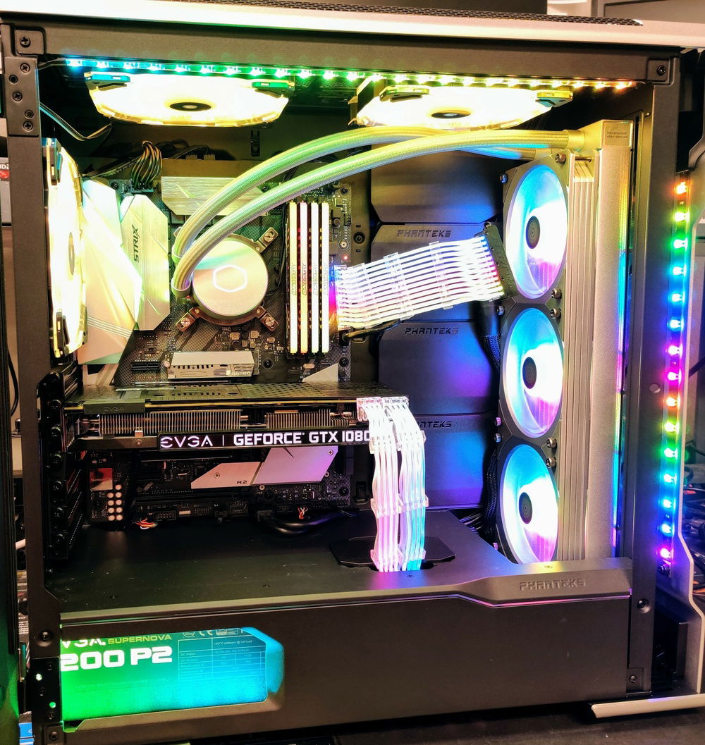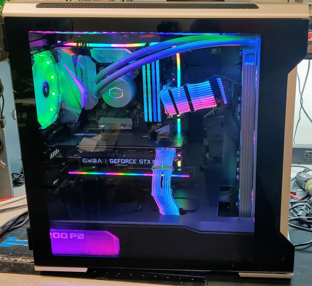 I did my best to make this RGB Build look as nice and classy as possible. We all know most RGB builds look gaudy and not done very clean. Also, RGBs themselves have a very direct light path and can be blinding when looking directly at them. I used all diffused or hidden RGBs everywhere to create the illumination without direct blinding light. To accomplish this I have over 12 RGB cables being controlled by 3 separate boxes/units. The 3 Corsair fans are controlled by the Fan Controller while the rest are a combination of the Cooler Master RGB/AIO Cooler Control Units, RGB Splitters and 3x Headers on the Motherboard. The Lian Li Strimmers are controlled by a single add in card while the case lights are controlled by I forget how!