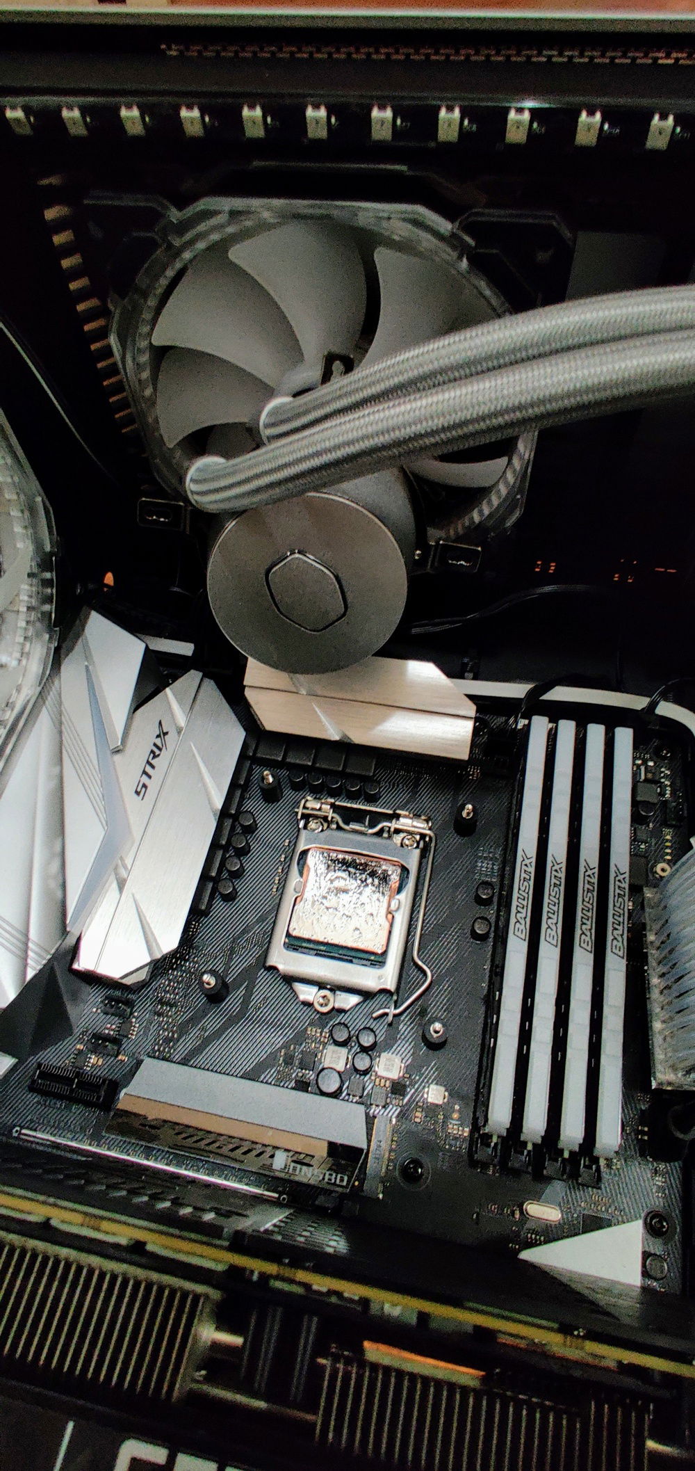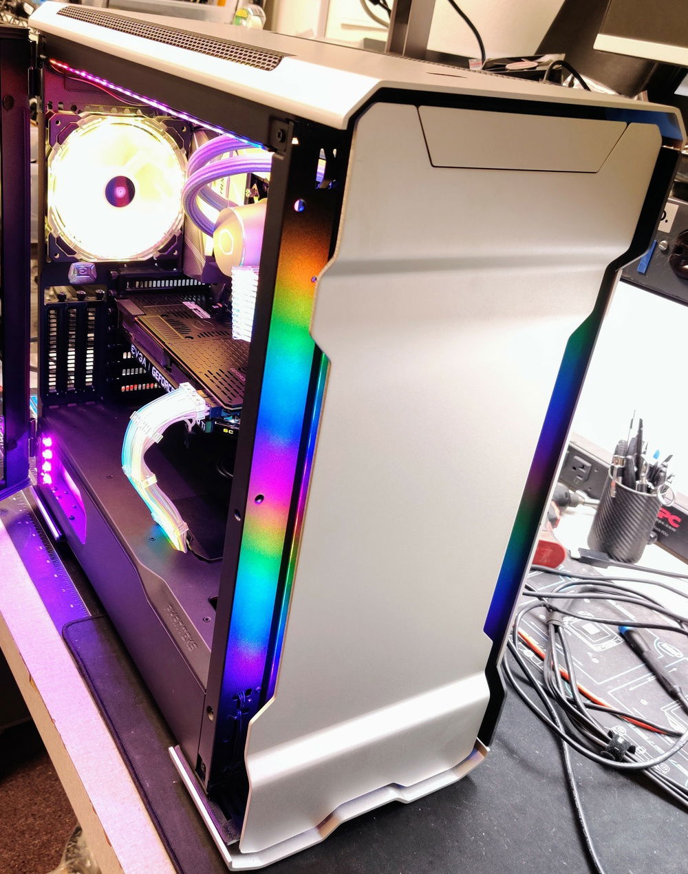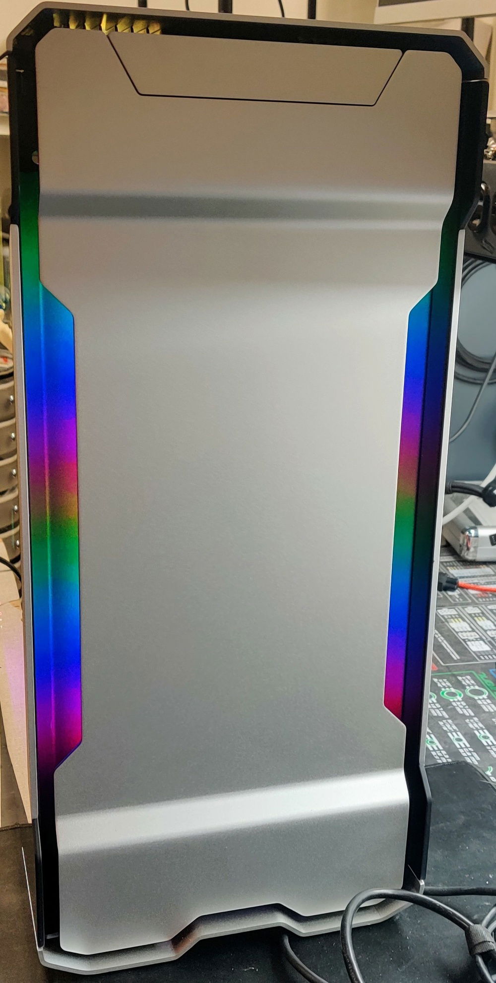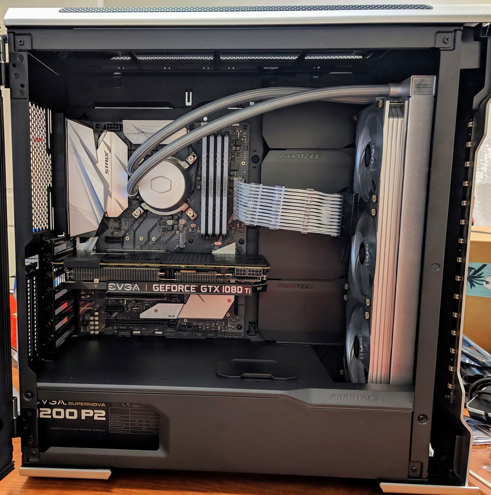I did my best to make this RGB Build look as nice and classy as possible. We all know most RGB builds look gaudy and not done very clean. Also, RGBs themselves have a very direct light path and can be blinding when looking directly at them. I used all diffused or hidden RGBs everywhere to create the illumination without direct blinding light. To accomplish this I have over 12 RGB cables being controlled by 3 separate boxes/units. The 3 Corsair fans are controlled by the Fan Controller while the rest are a combination of the Cooler Master RGB/AIO Cooler Control Units, RGB Splitters and 3x Headers on the Motherboard. The Lian Li Strimmers are controlled by a single add in card while the case lights are controlled by I forget how!